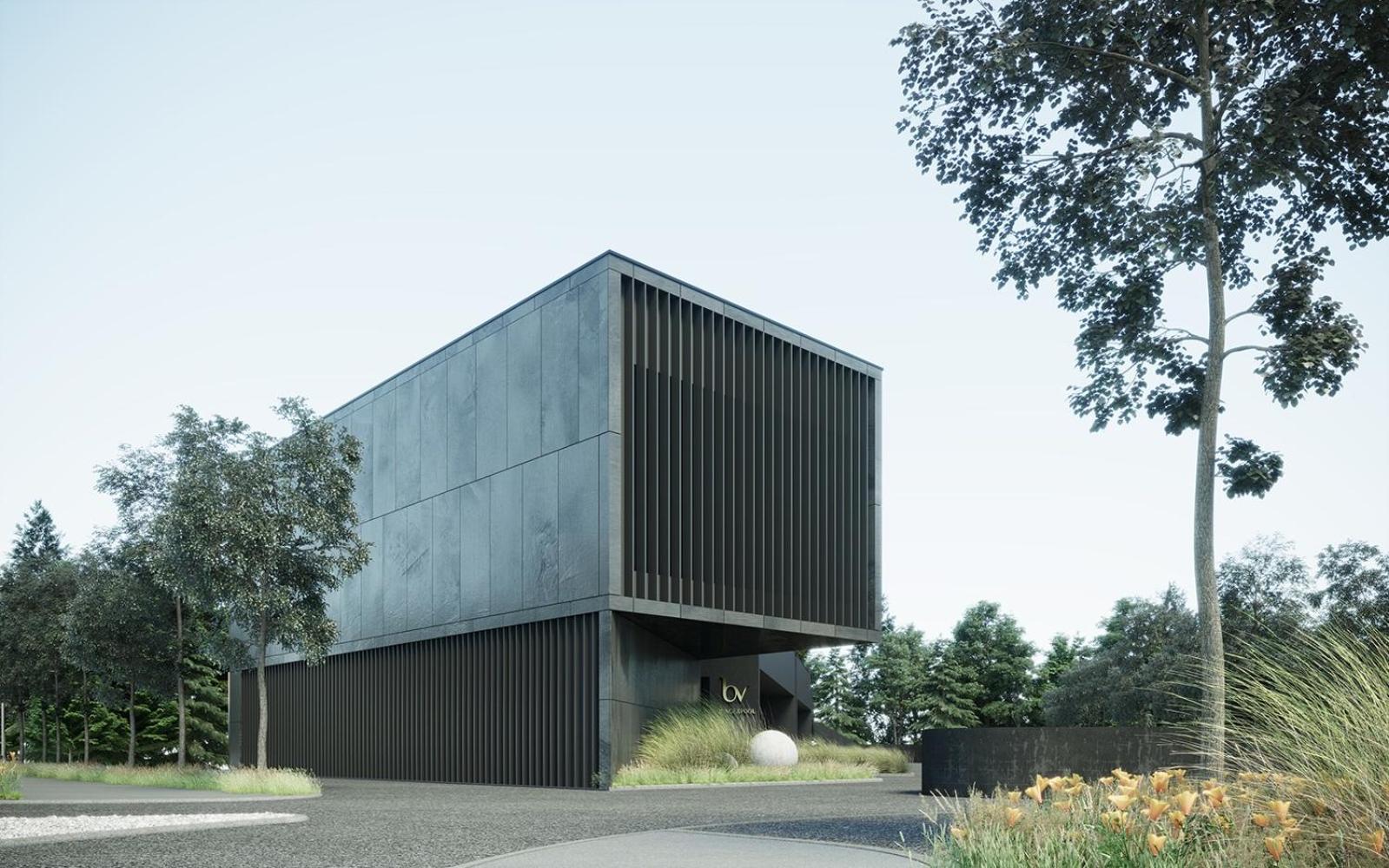 Modernes , interessantes Gebäude, farblos in schwarz und grau.