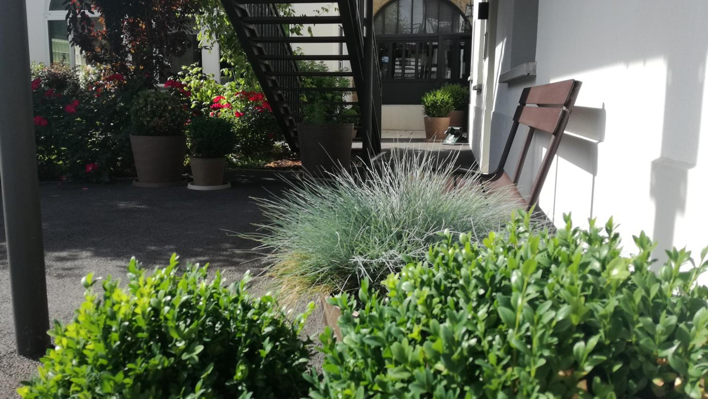 Step back in time: Experience the charm of a 17th-century staircase and half-timbered facade at Hôtel jardin Le Pasteur.