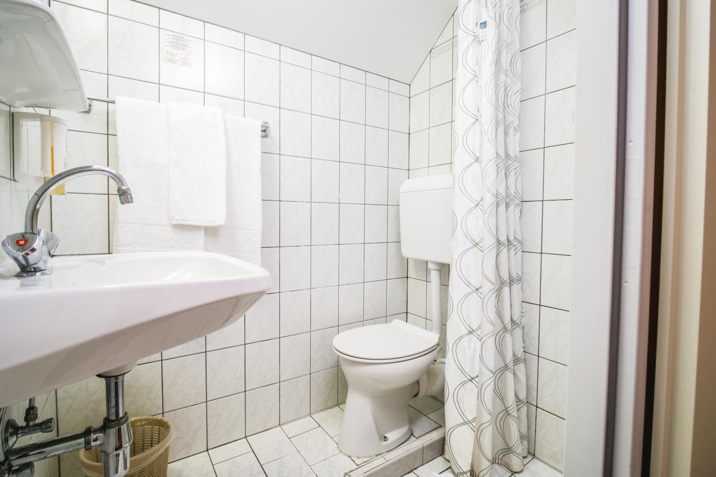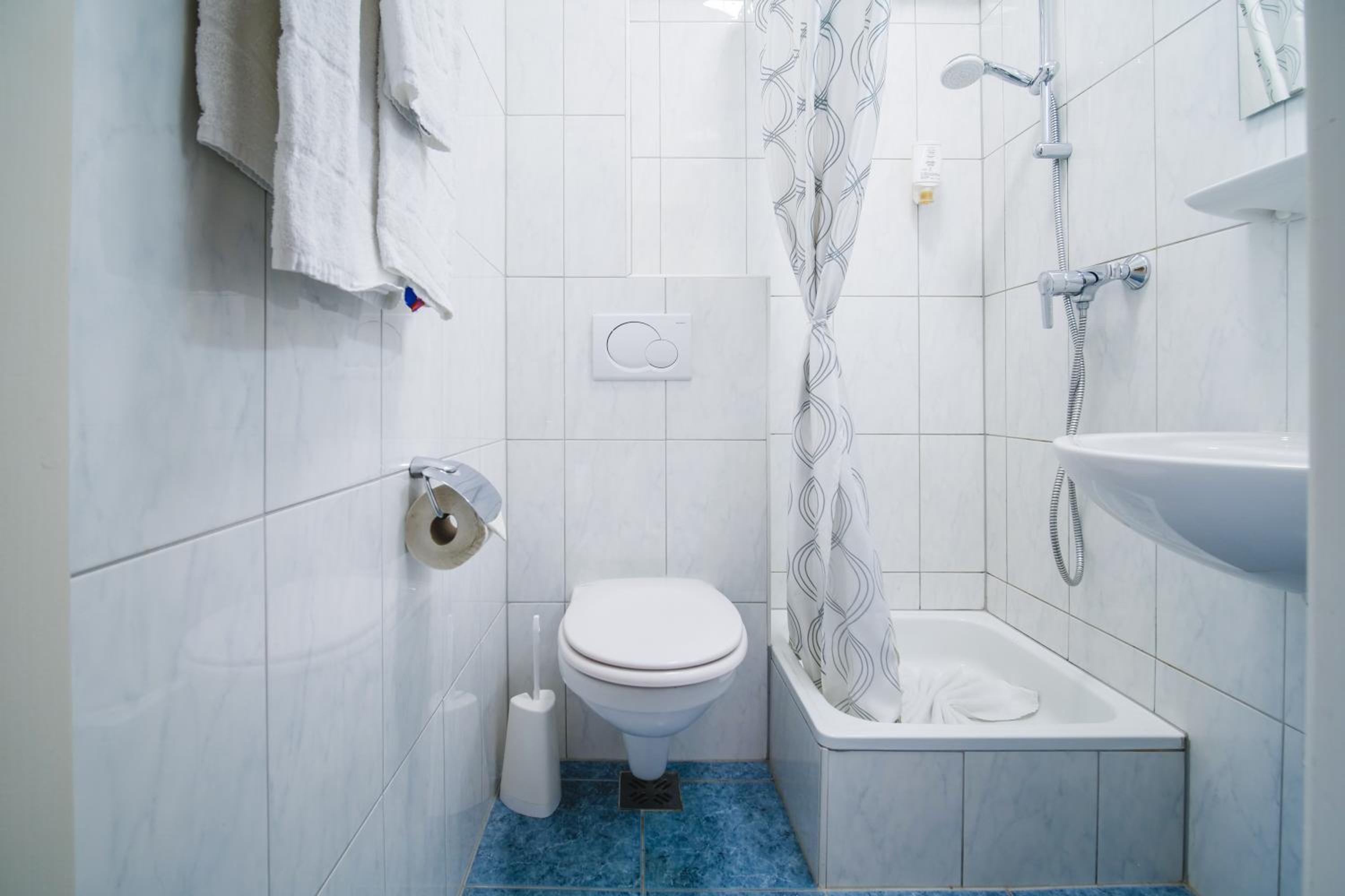 Koupelna je fakt piďi, je ve středu pokoje, takže žádné otevření okna nebo větrání a starý styl záchodu. Jako žena potřebuju víc místa, jinak spokojená.