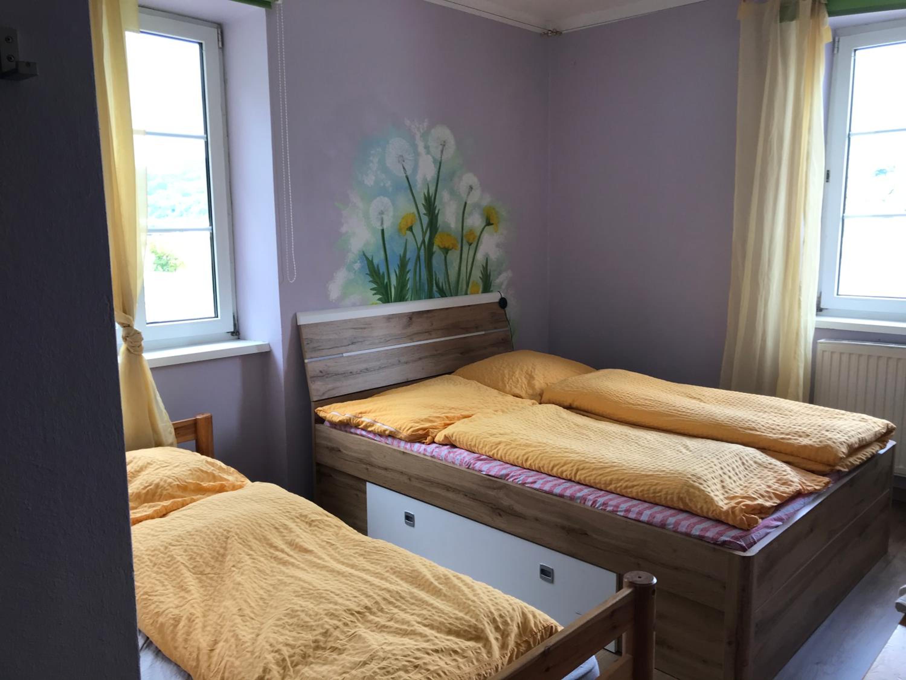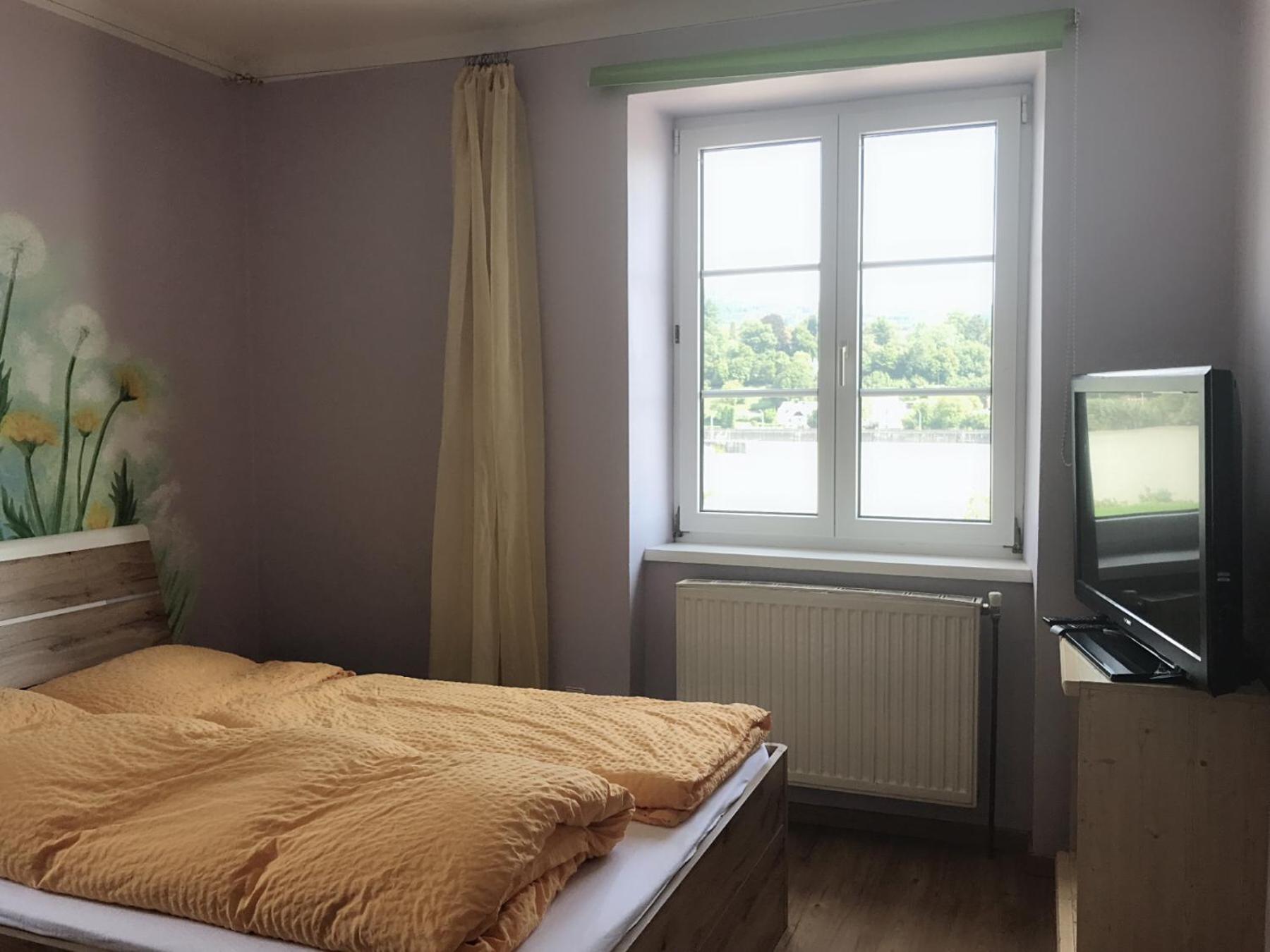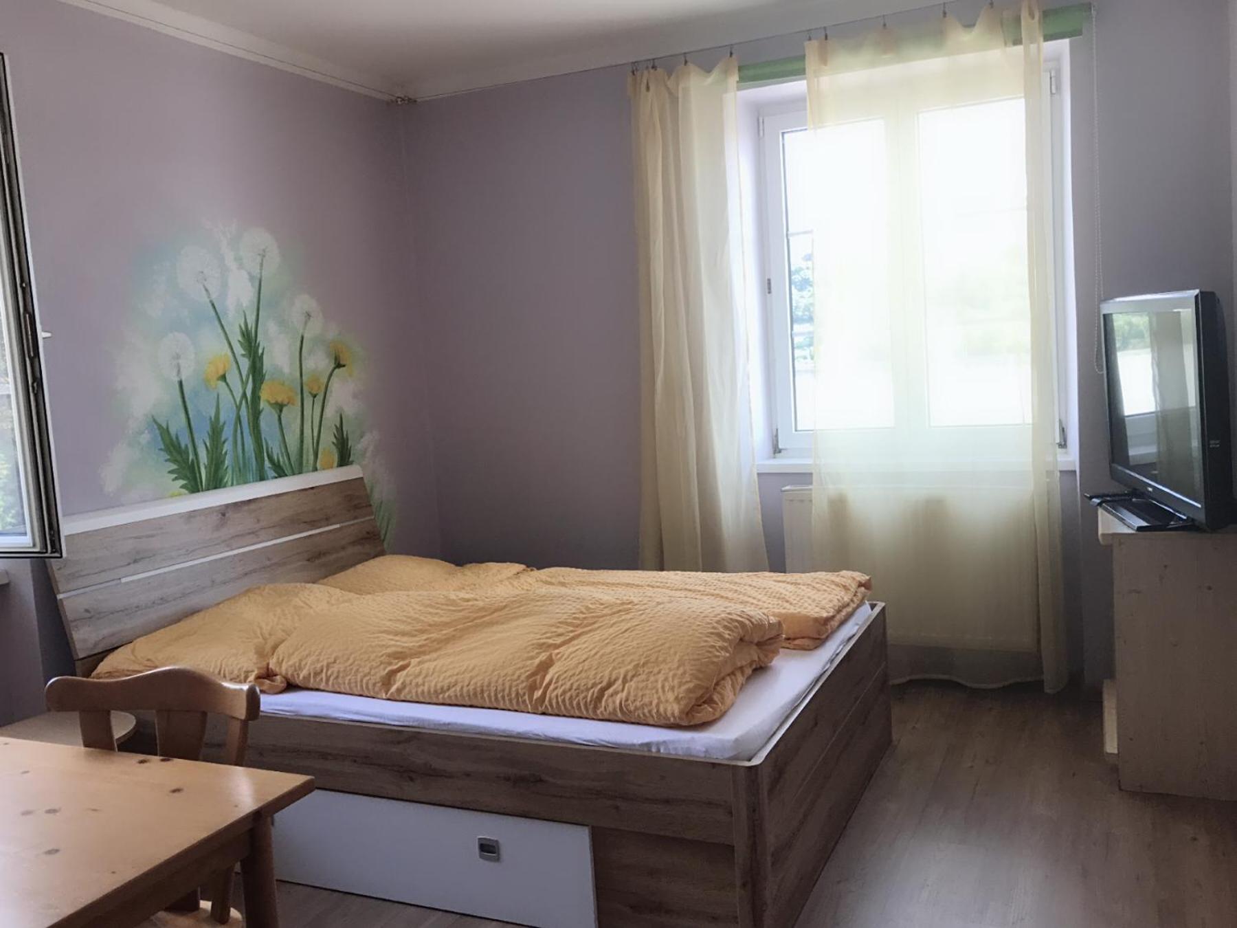 Dobrá lokalita pro další výlety, novější postel a příjemné matrace, na oknech byl zatemňovací závěs, paní byla velmi milá. Na umyvadle balea sprchový gel na mytí rukou a na sprchování, na pokoji varná konvice a android televize - to je super, protože na německé kanály se nepodíváme, takhle si pustíme film na youtube a toho si cením.