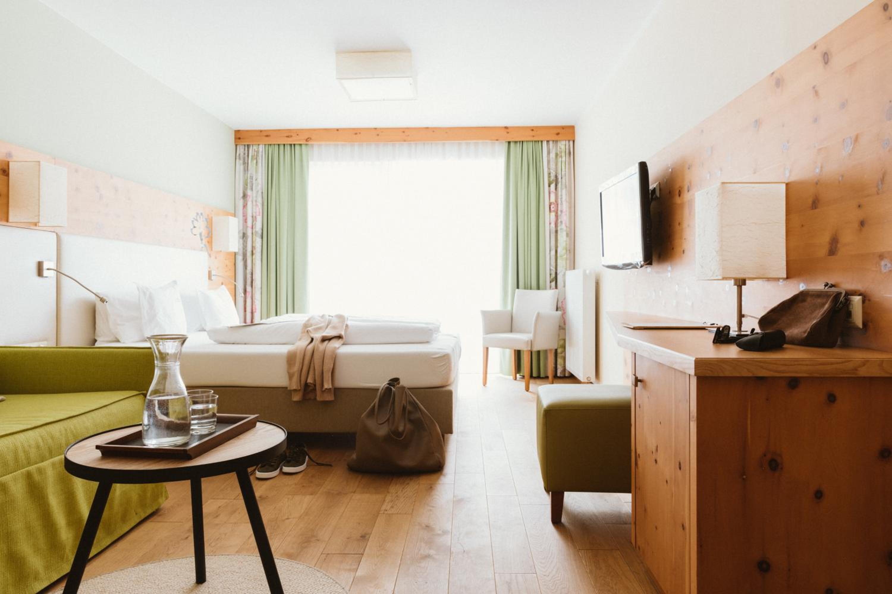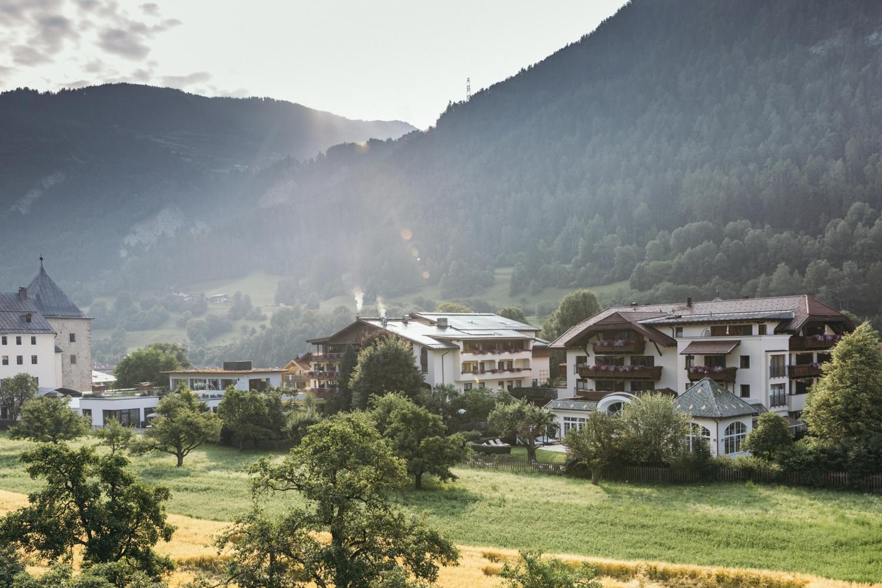 Indulge in traditional Tyrolean cuisine made with fresh ingredients from the organic farm. The hotel boasts an exclusive spa area, gym, and various massage services. Relax in cozy bathrobes and unwind in the comfortable seating areas within the rooms.