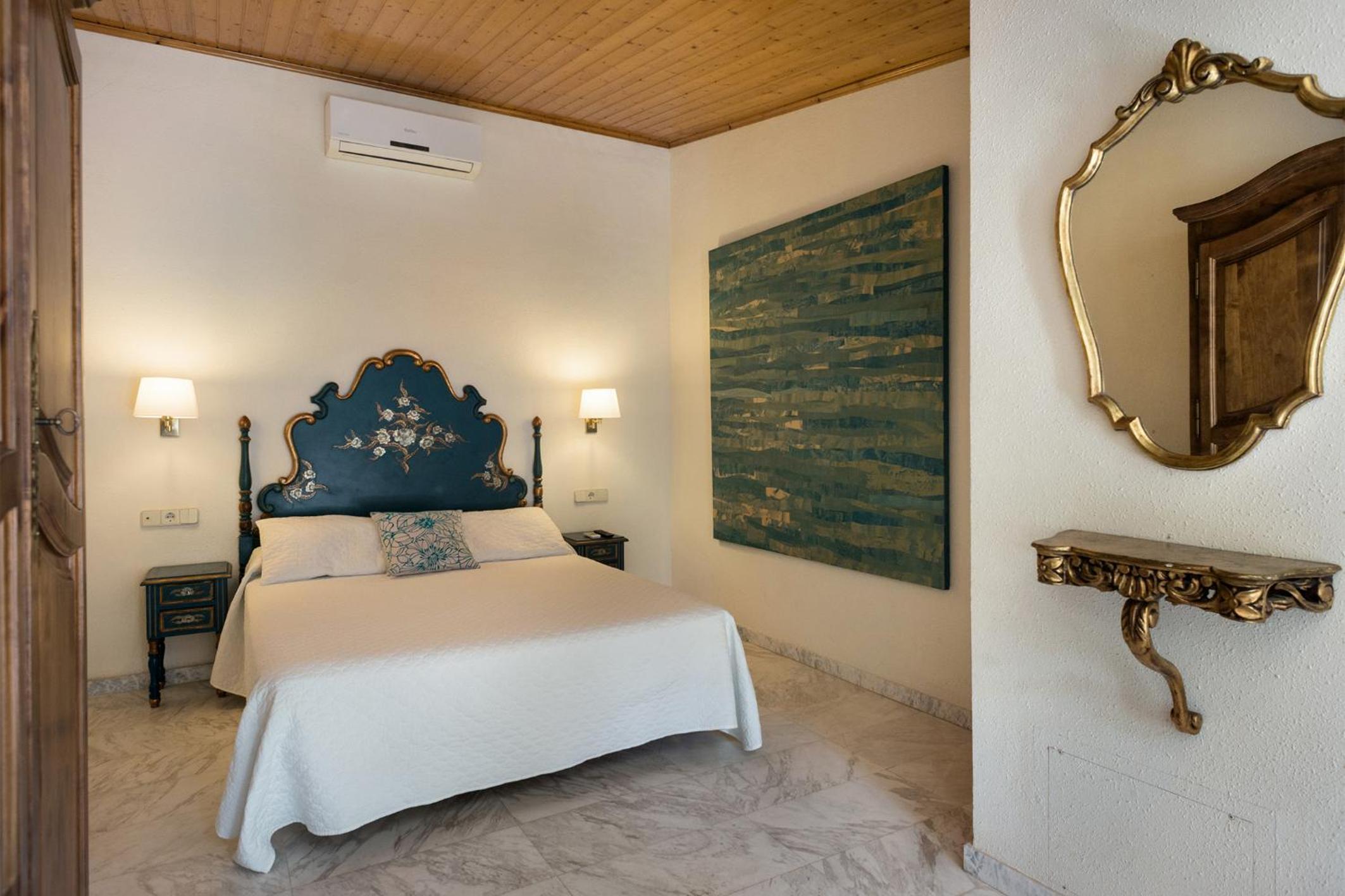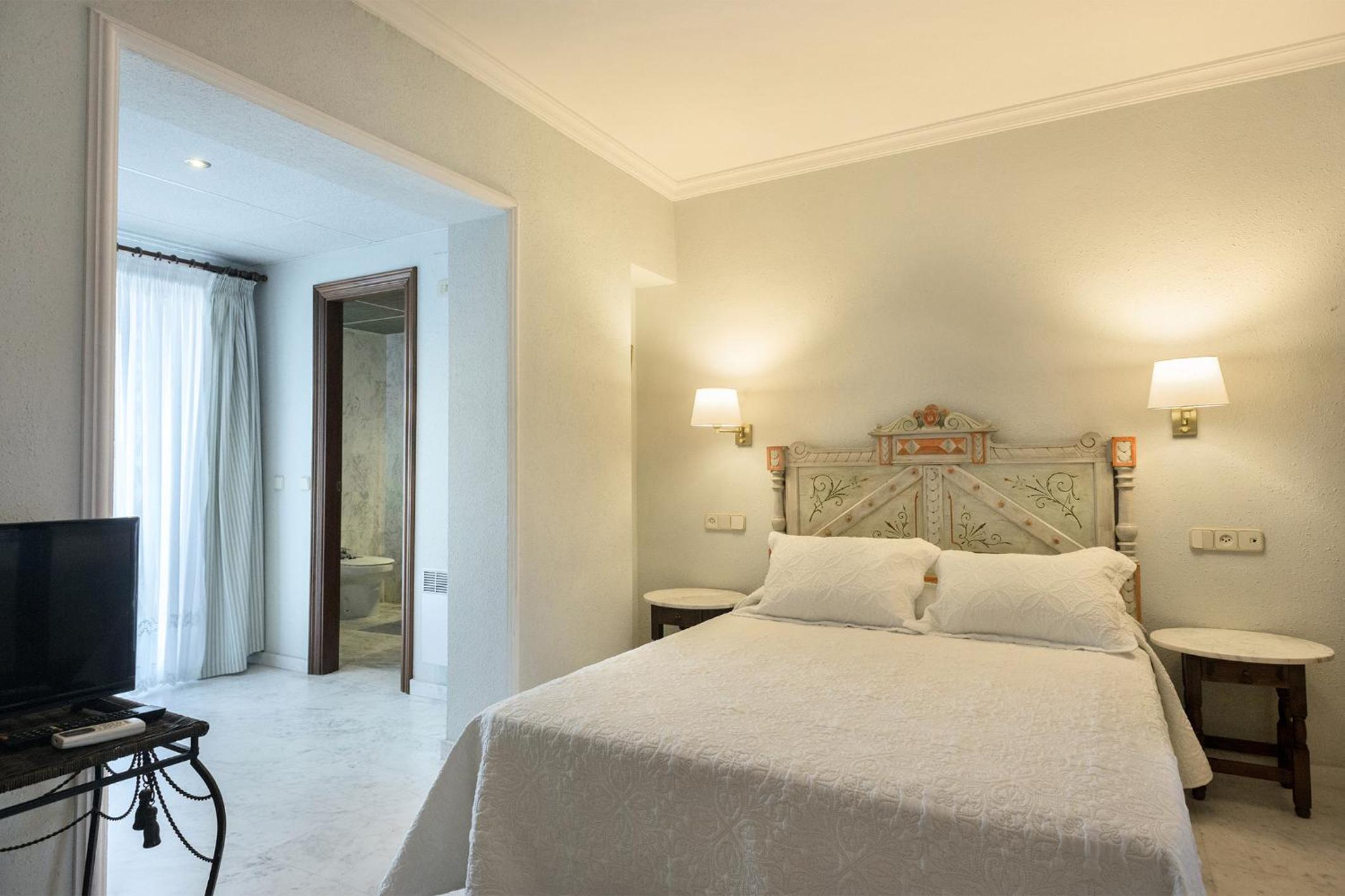 Indulge in the elegance of Hotel El Molí's rooms offering picturesque pool or garden views, satellite TV, and some with a spacious furnished balcony for a truly luxurious stay.
