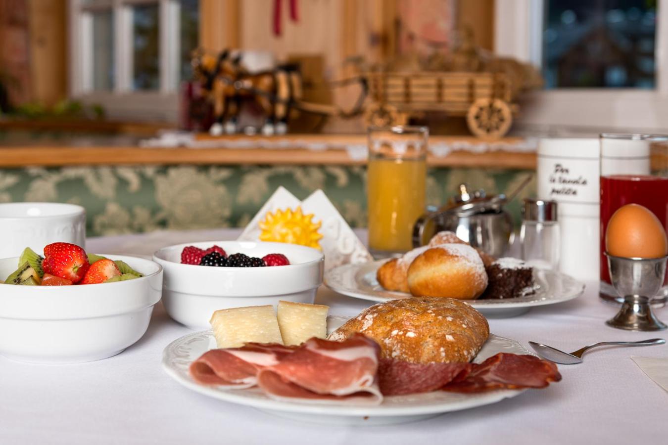 Start your day with a hearty buffet breakfast offering a variety of sweet and savoury options, from croissants and homemade cakes to jams, cheese, and cold cuts.