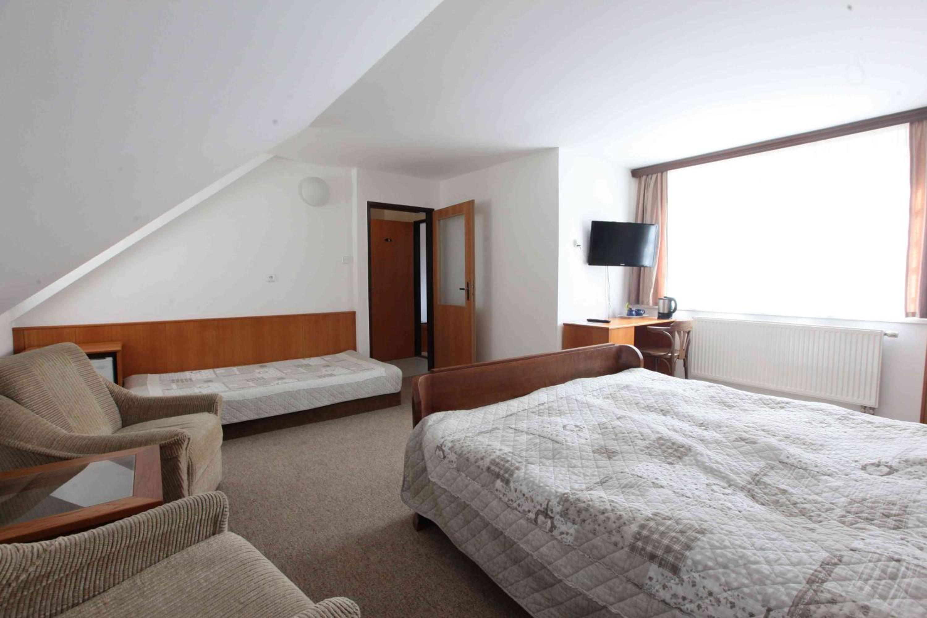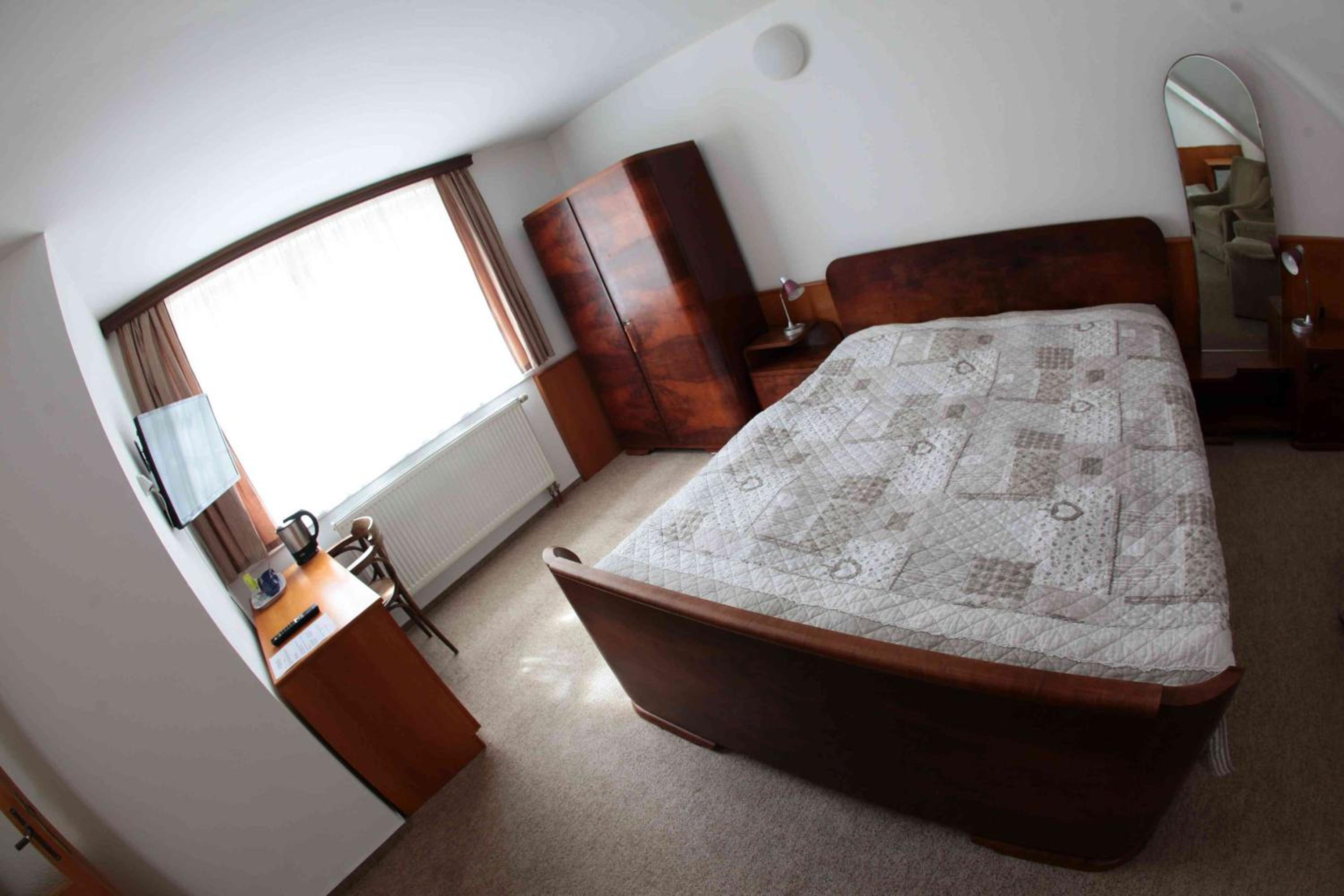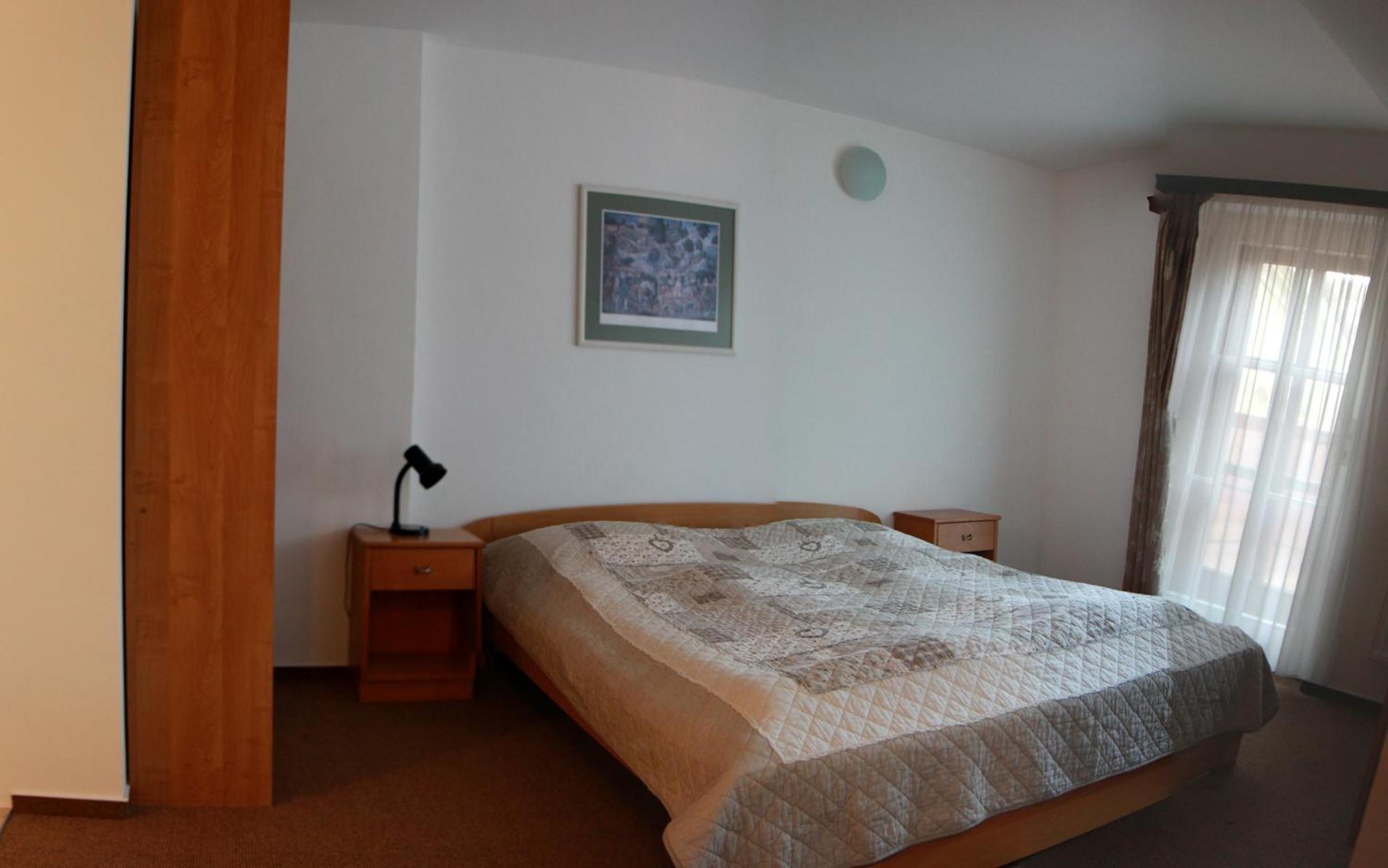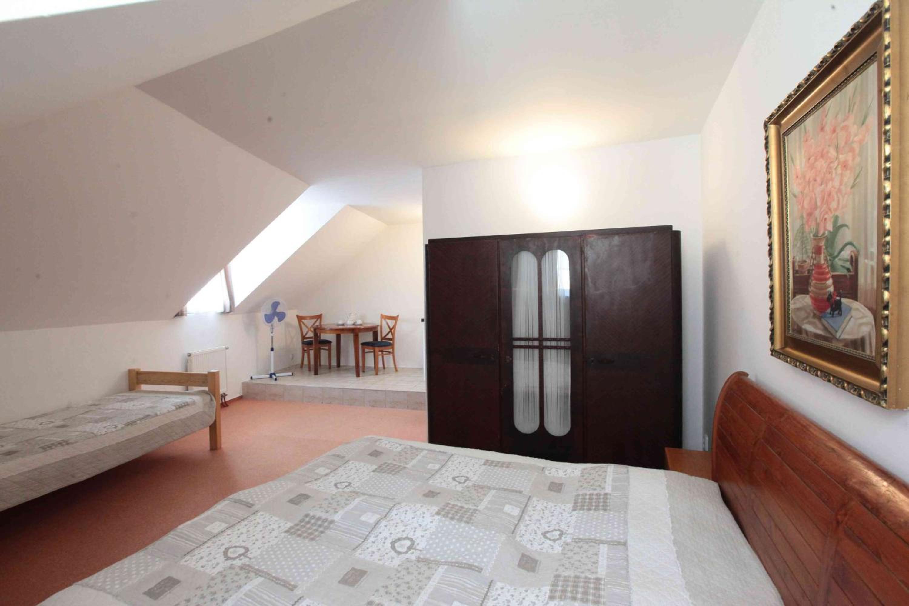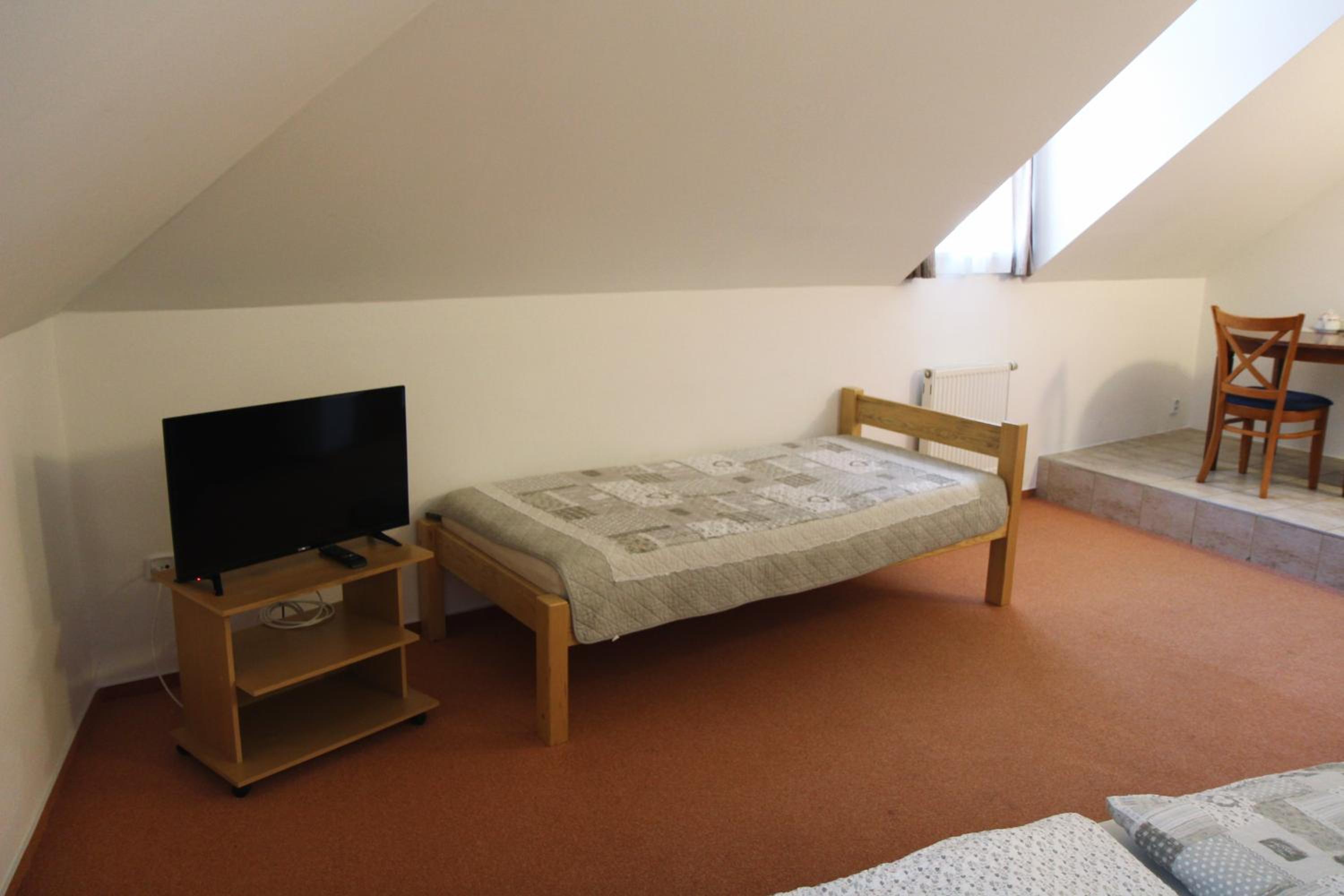 Podkrovní pokoj (vnější stěn šikmá), několikrát jsem se při mé výšce uhodil do hlavy. Jen jedno ze tří oken šlo otevírat.
