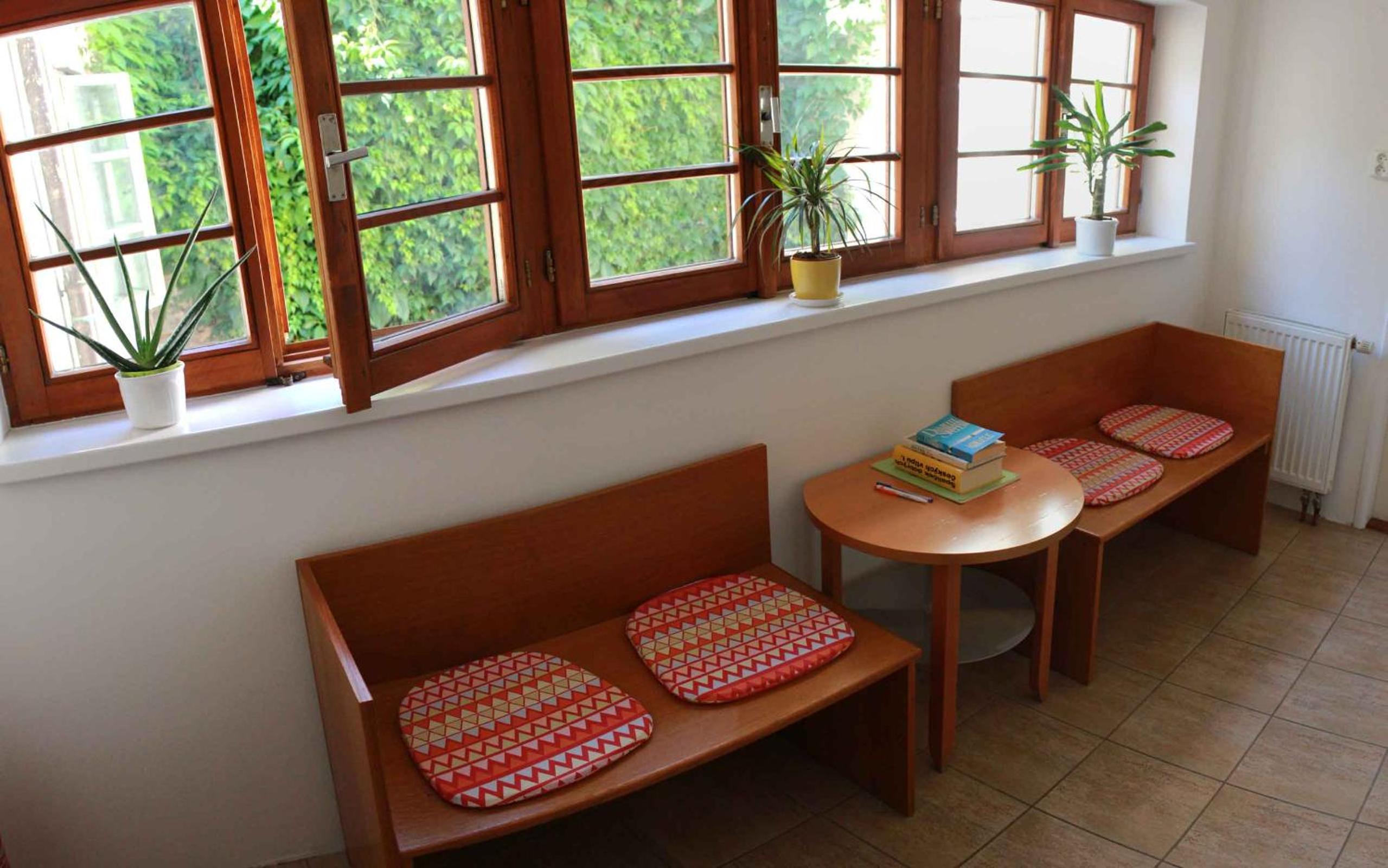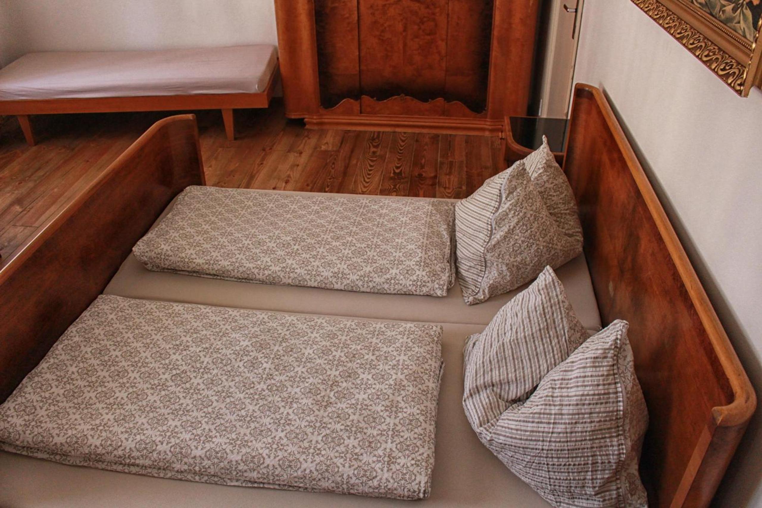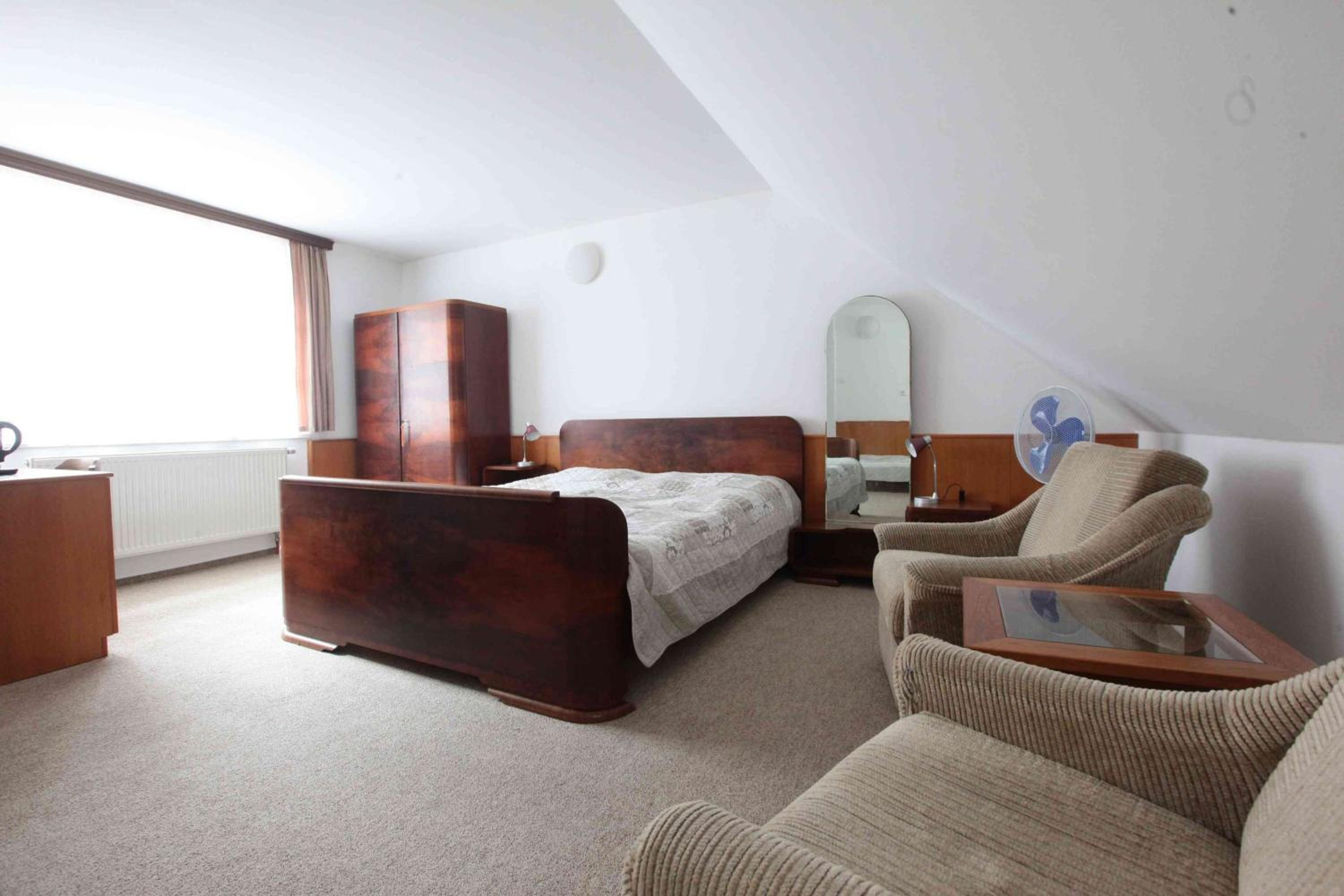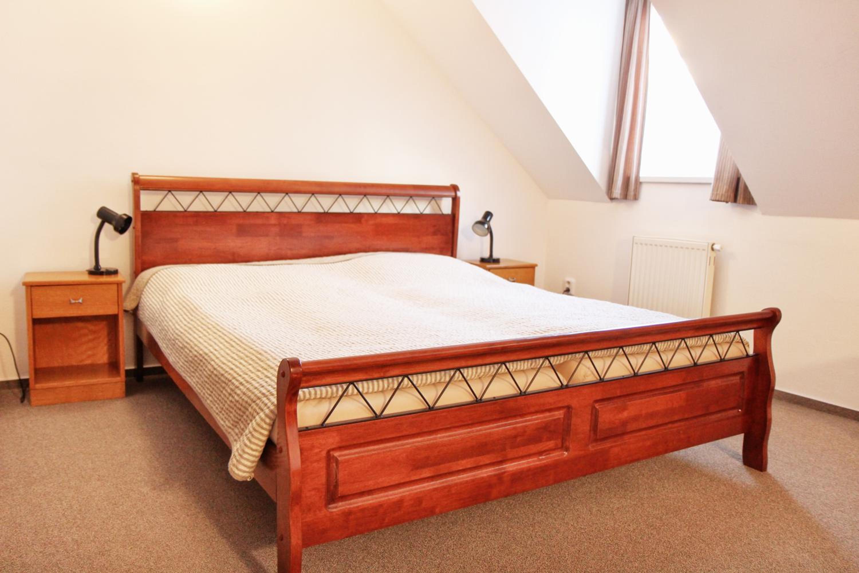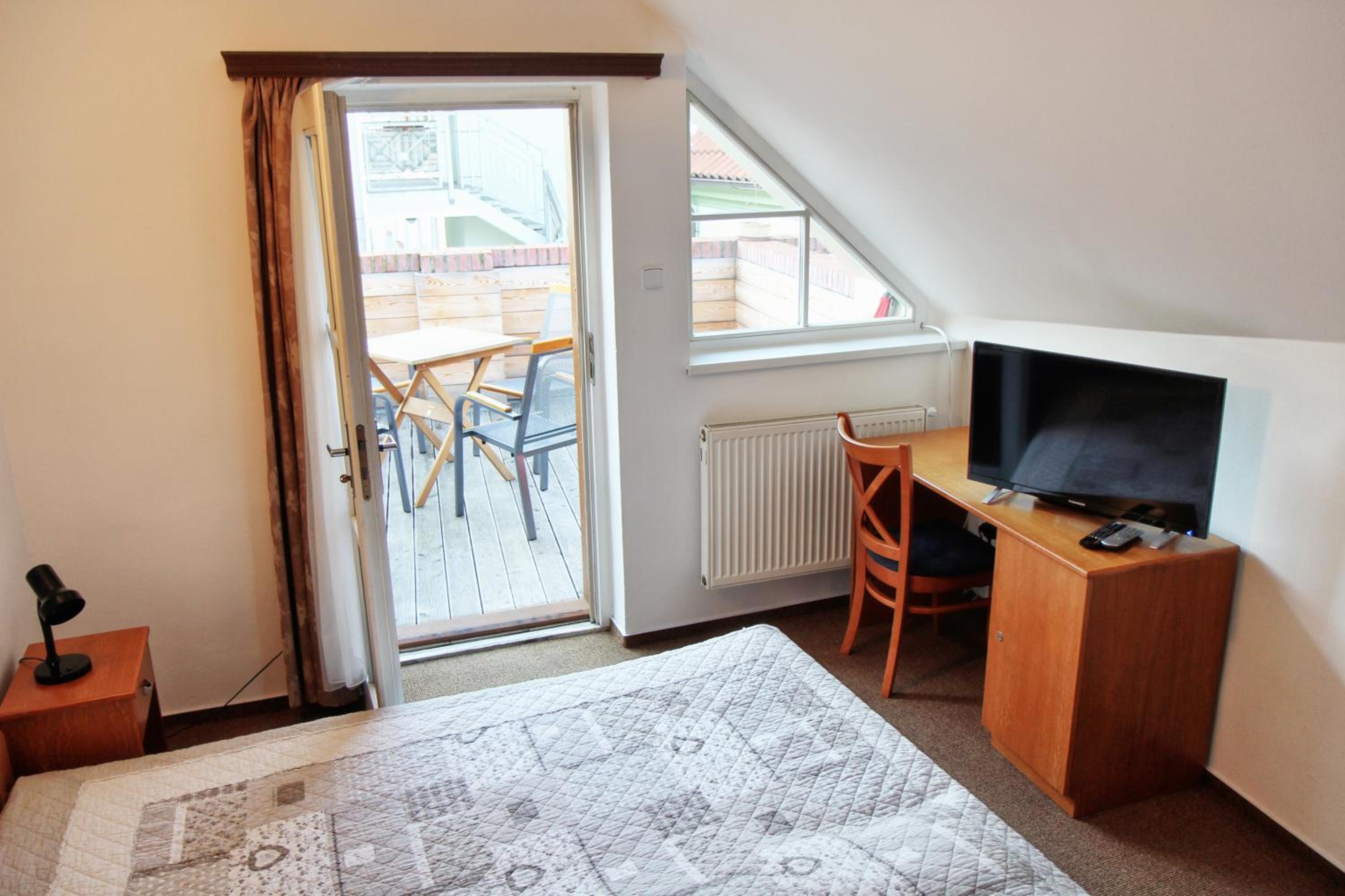 Podkrovní pokoj (vnější stěn šikmá), několikrát jsem se při mé výšce uhodil do hlavy. Jen jedno ze tří oken šlo otevírat.