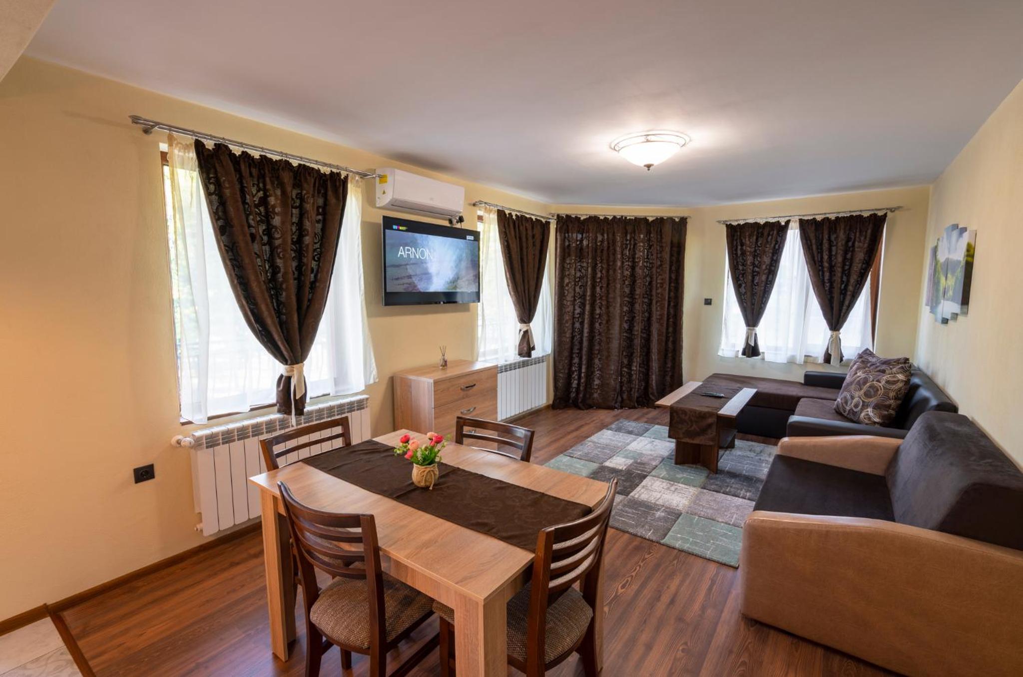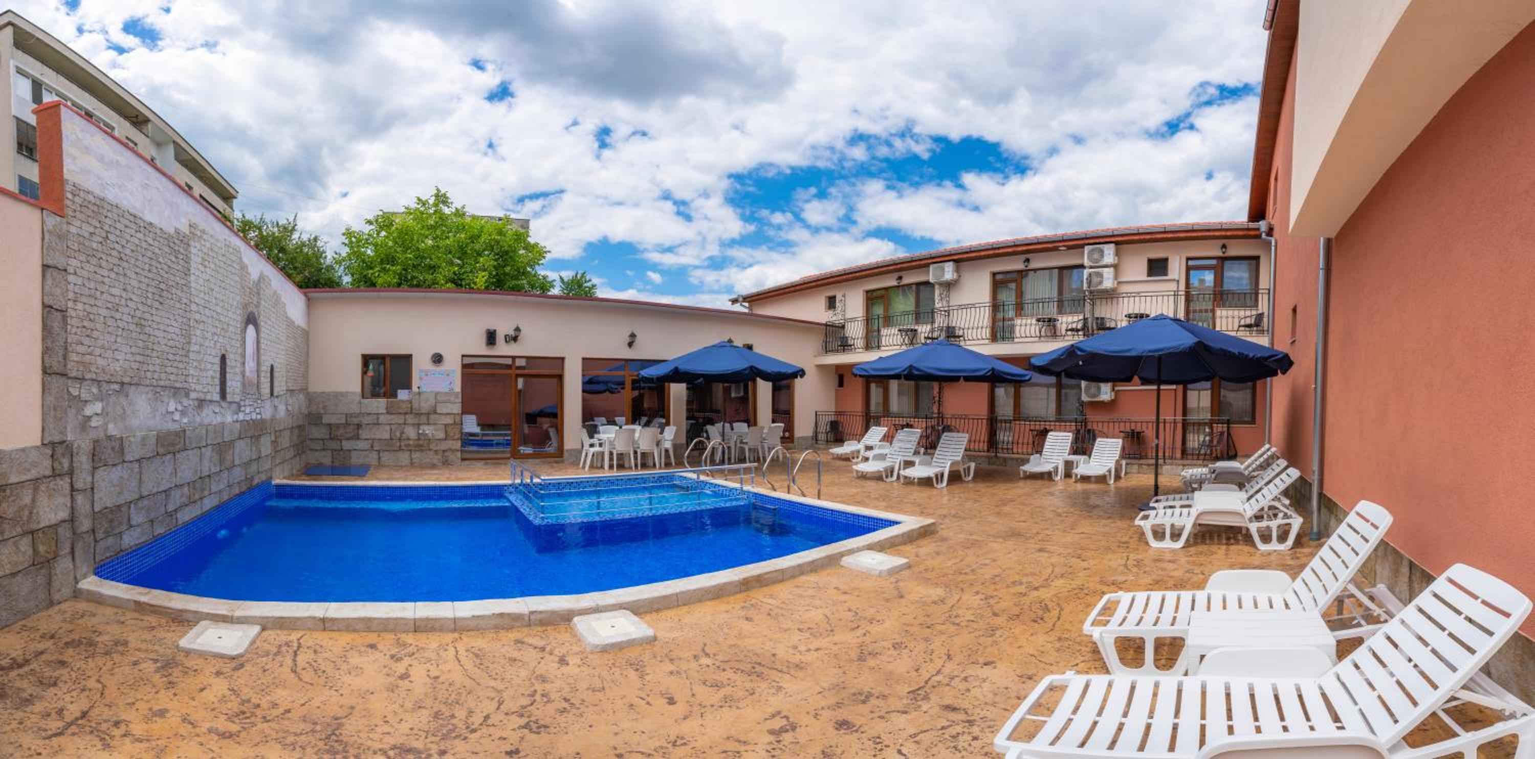 Everything! This is another of those absolute gems; spacious, extremely comfortable, and the lady on reception was so helpful in every way. The hotel has a lovely swimming pool with a jacuzzi facility on the one side, and space to stretch out and relax on recliners. It was extremely hot, so the excellent aircon was most welcome. It even made self catering relatively easy, although the excellent hotel restaurant away across the main square had superb food at reasonable prices. This is a lovely little town with all the facilities one could wish for, and we loved it. I even had an excellent haircut at the local barber for just 10 Leva.