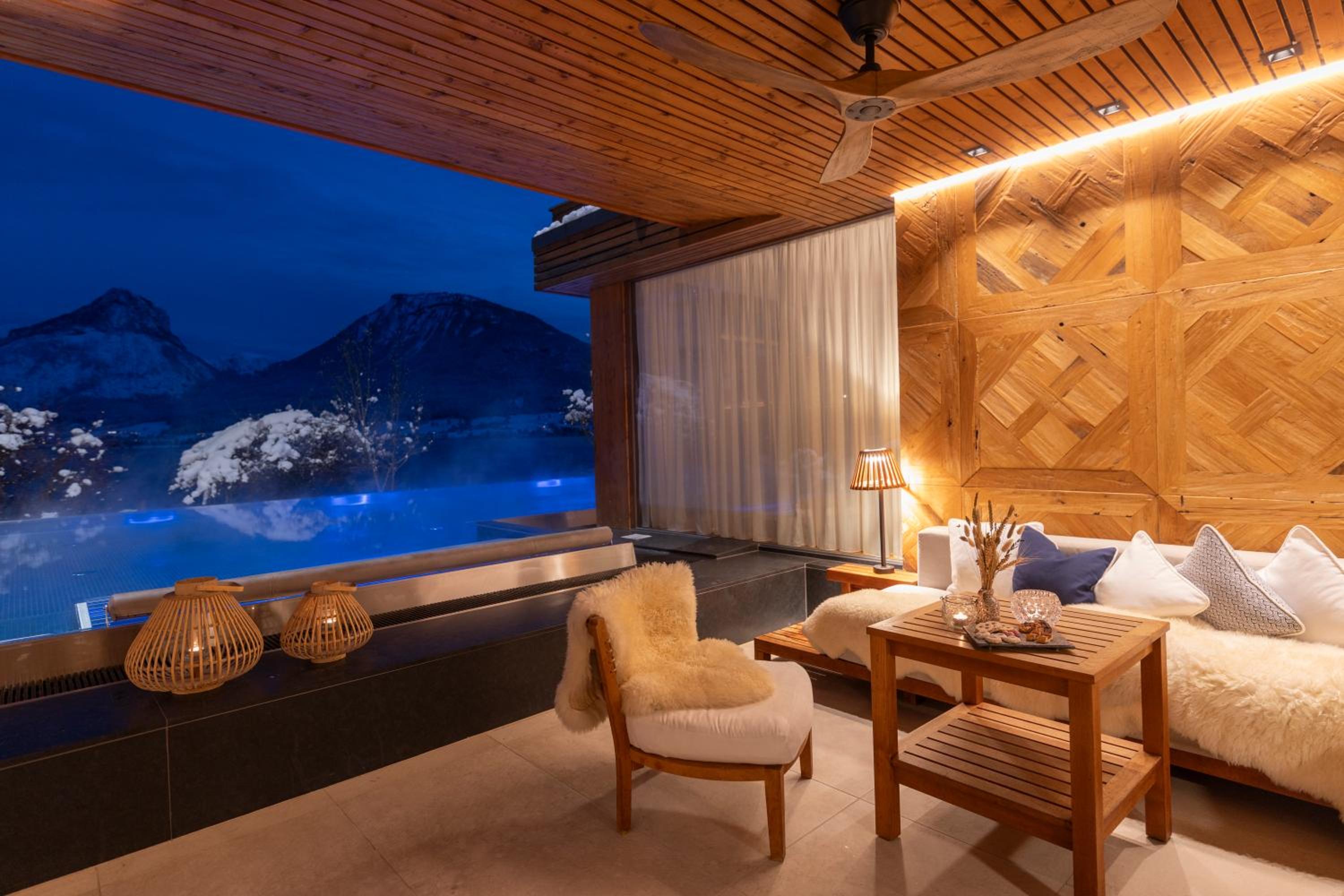 Unwind at the hotel's small spa center featuring free sauna, infrared cabin, steam bath, and fitness facilities. Dive into the heated 10-meter infinity pool with panoramic lake and mountain views. Don't miss the opportunity to try various recreational activities nearby, including golf, water skiing, and sailing.
