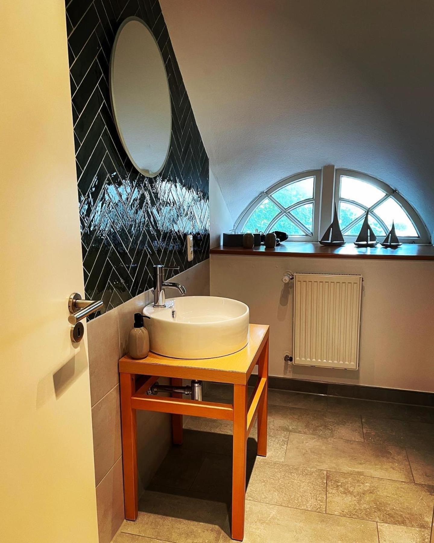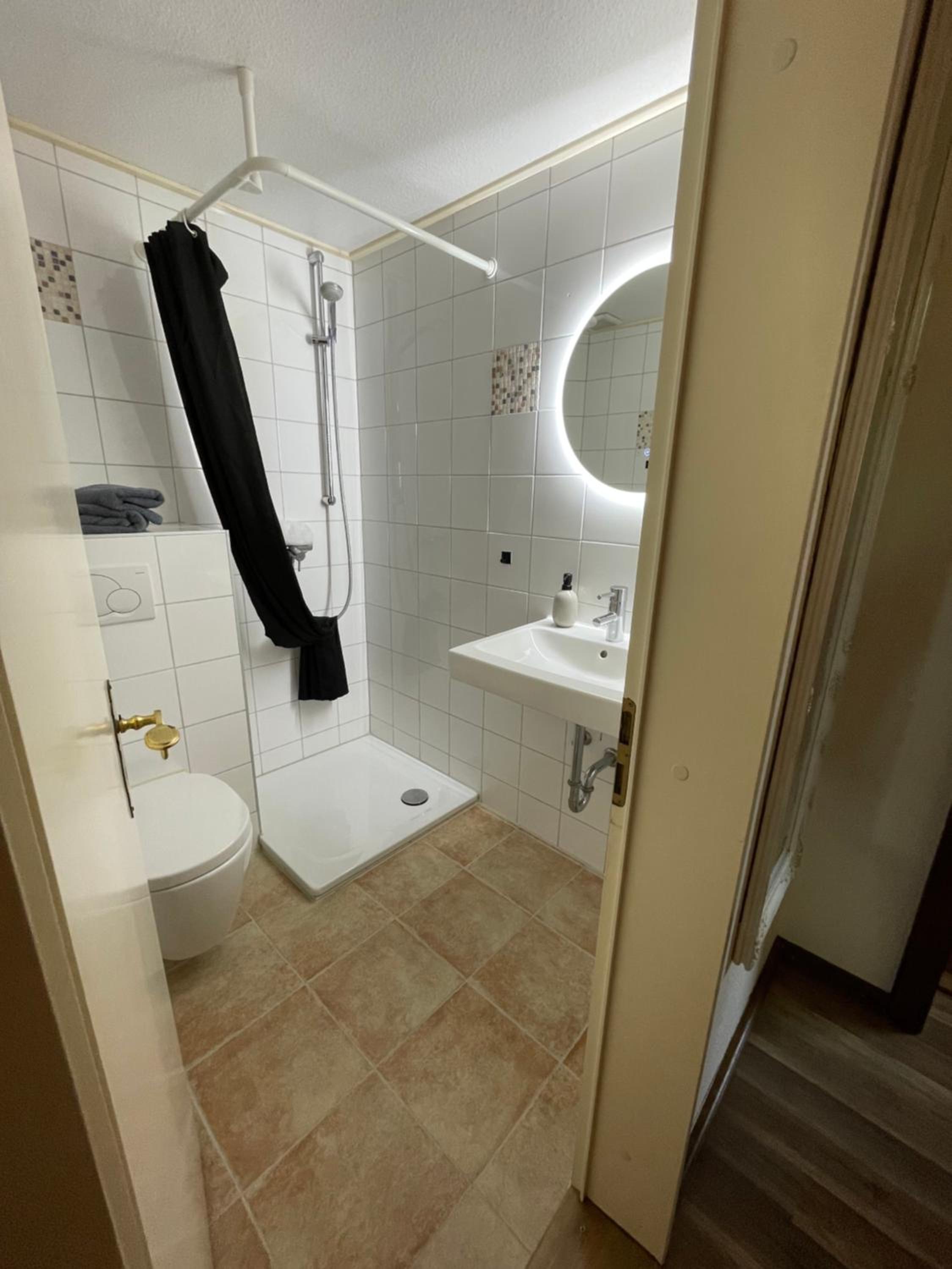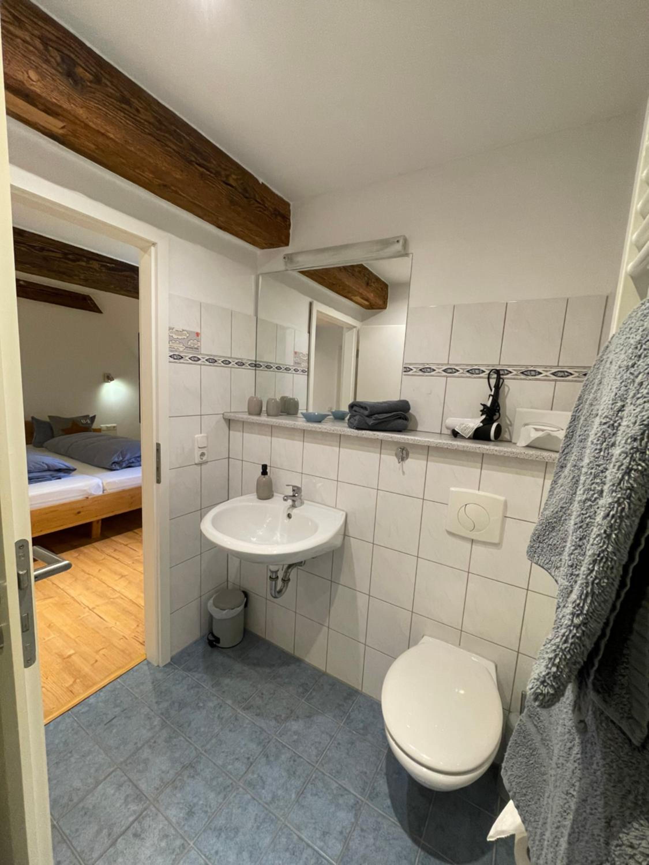 Der Spiegel im Bad hängt für kleine Menschen zu hoch.