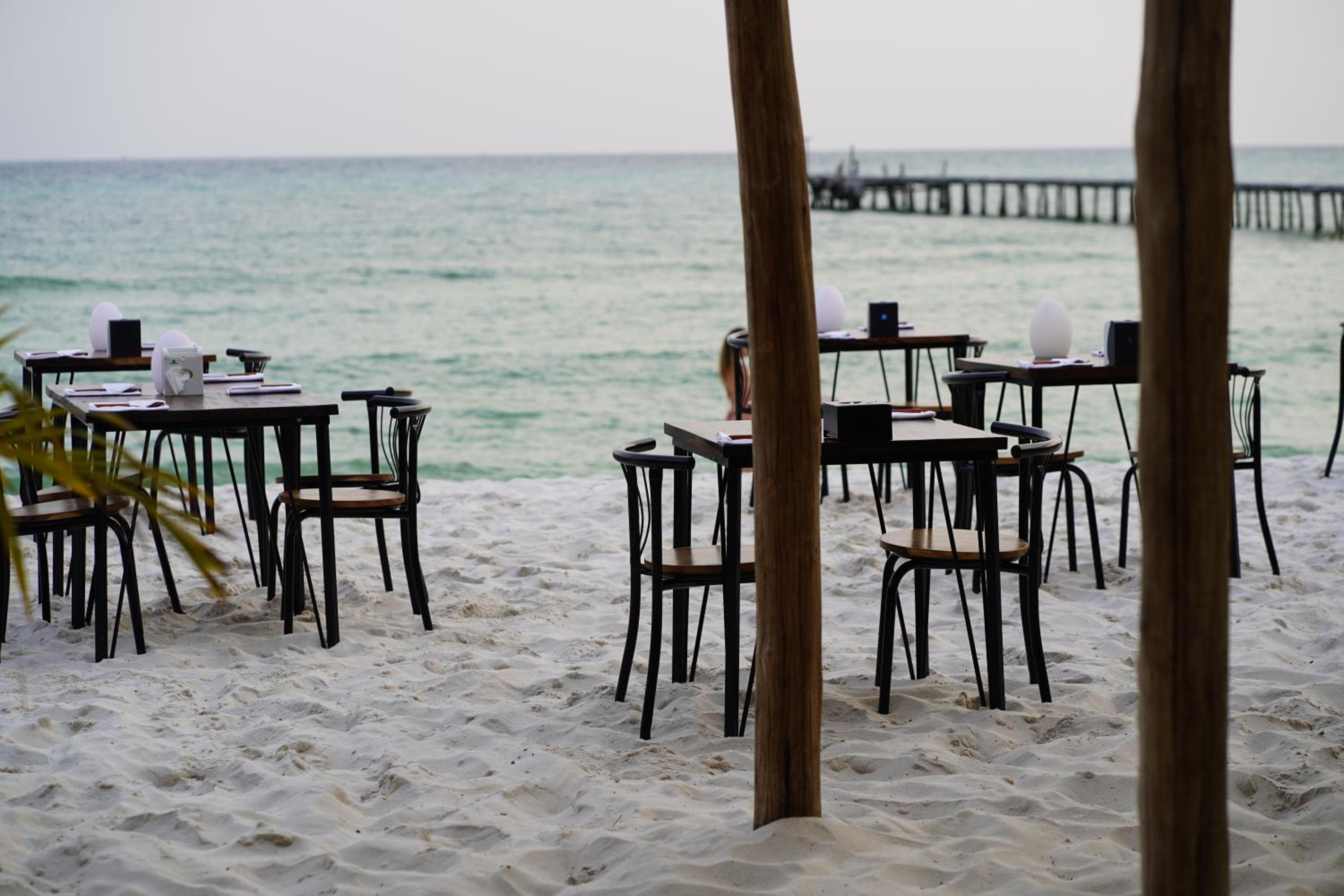 La plage, le restaurant, le garçon du restaurant très professionnel .