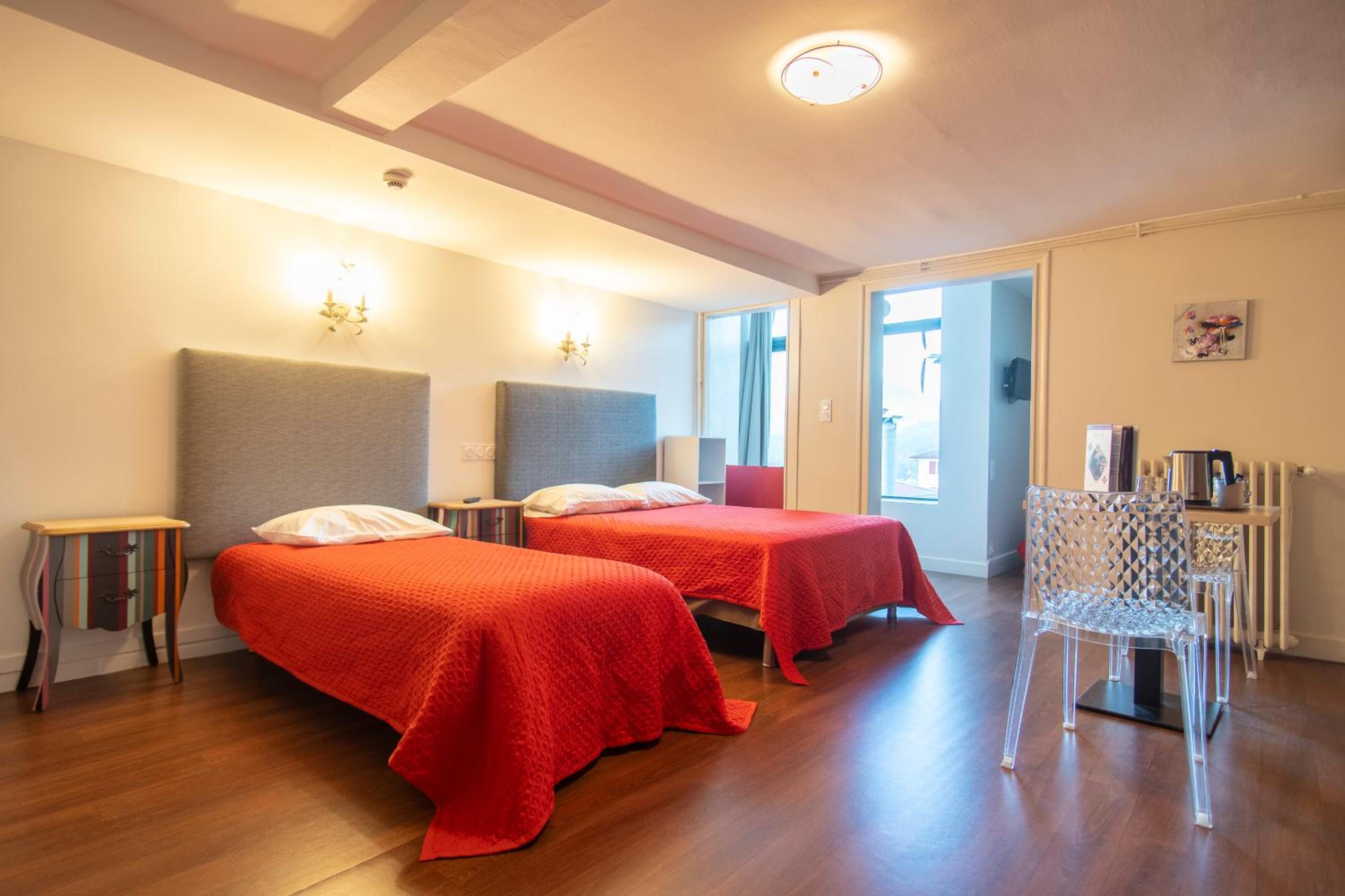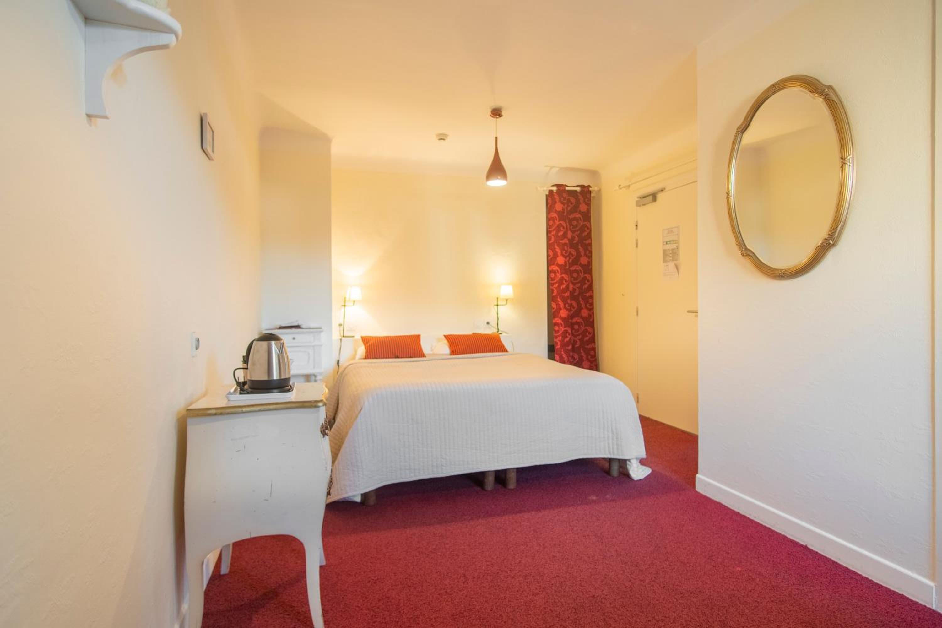 Chambre sur rue principale, mais très calme grâce à 2 double vitrage, confortable avec une super literie. Un bon radiateur nous a permis de sécher nos affaires, car séjour pluvieux. Nous y reviendrons.
