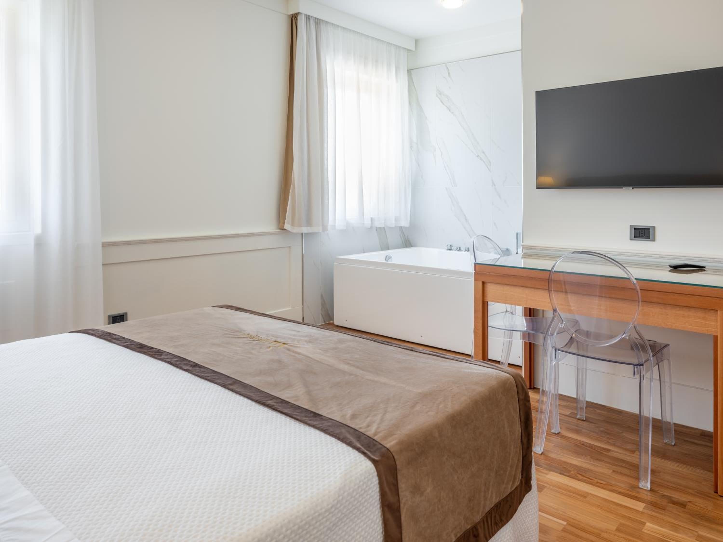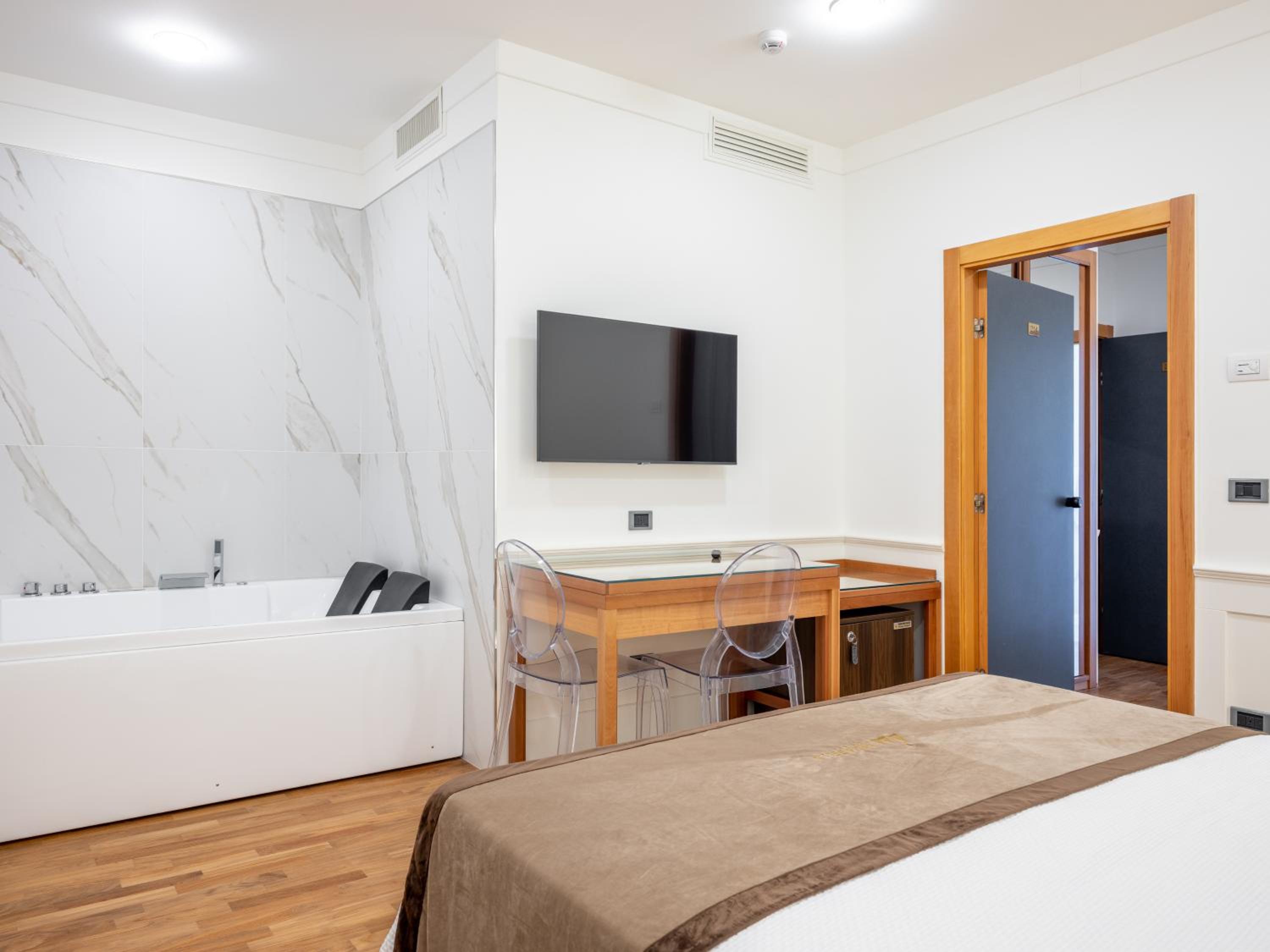 qualche imperfezione del bagno, la porta di ingresso molto pesante da aprire e la colazione non all'altezza dell'hotel, dovrebbe migliorare