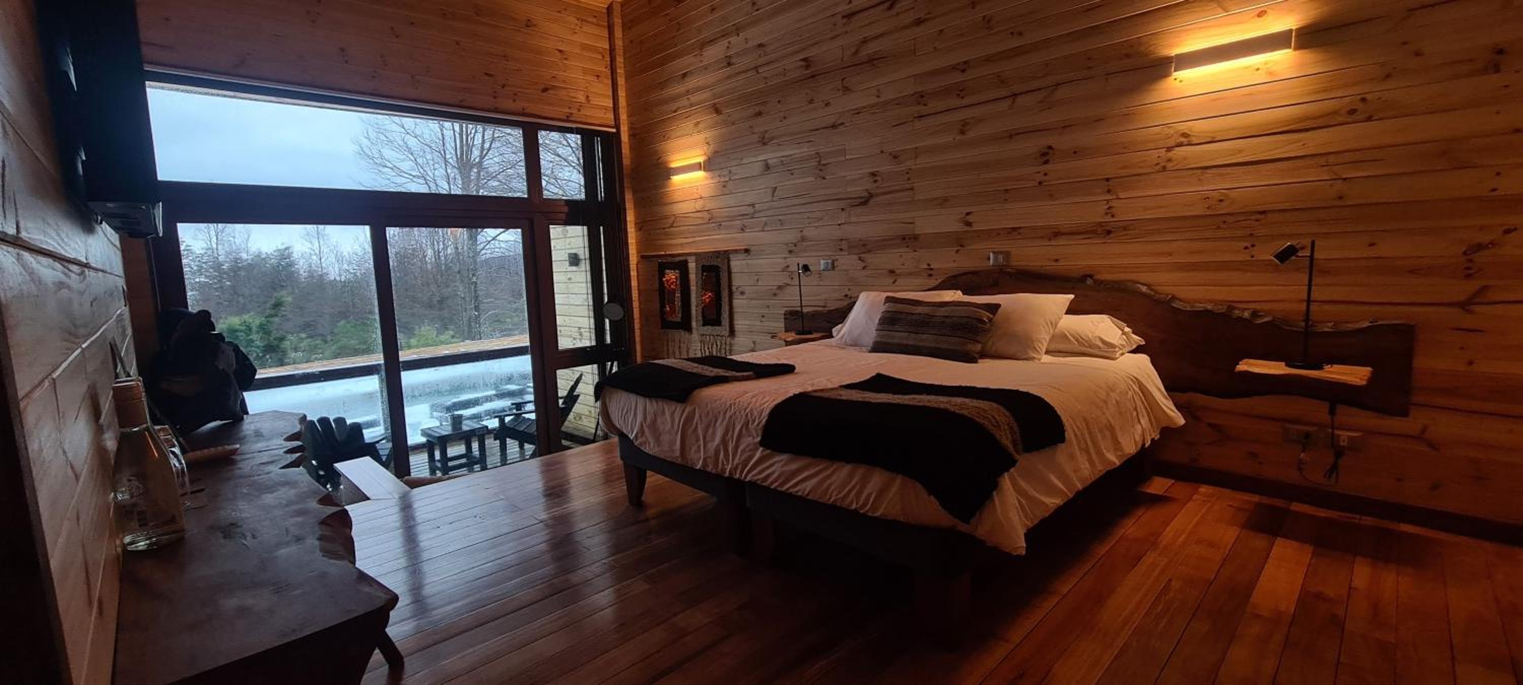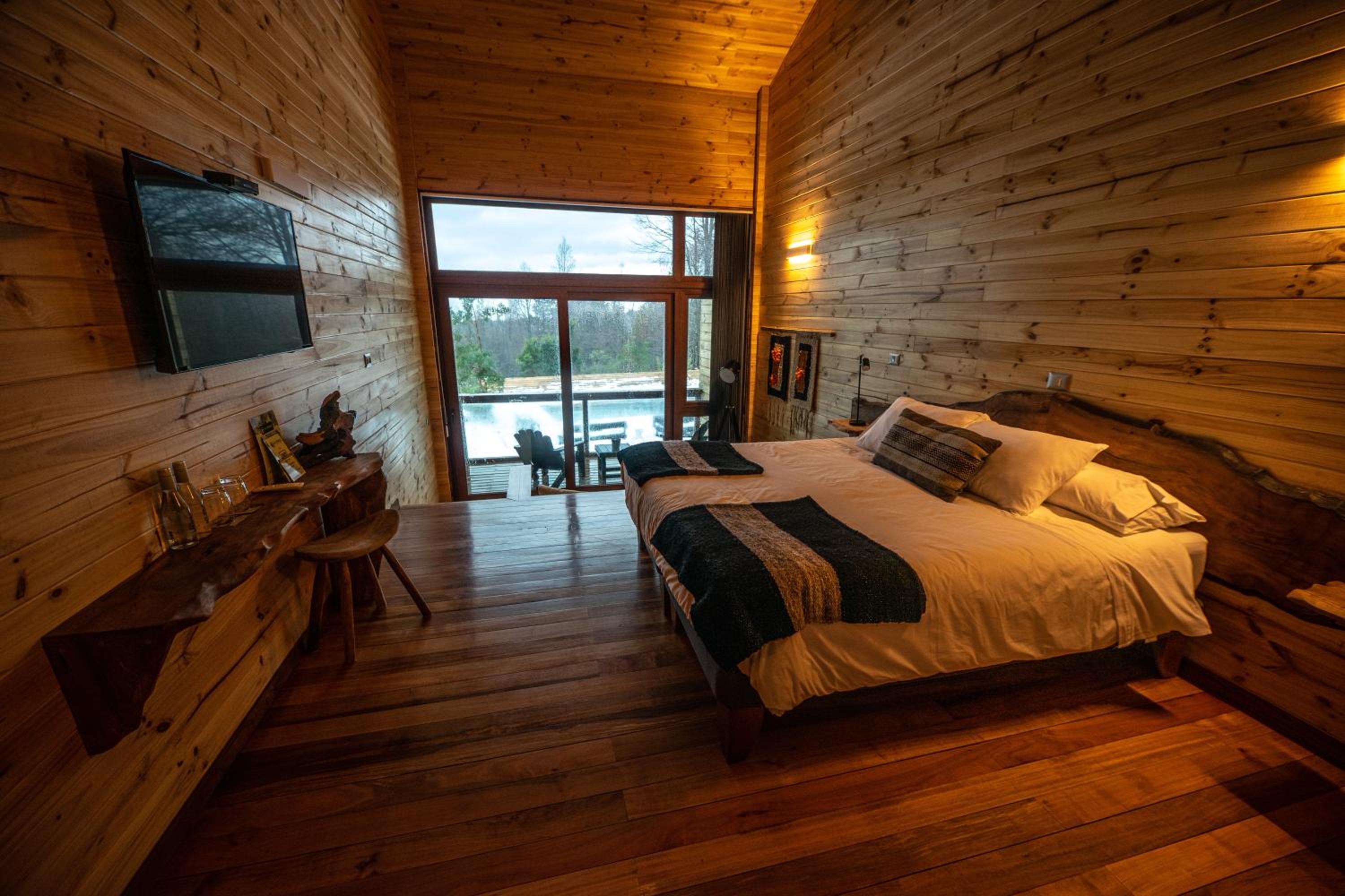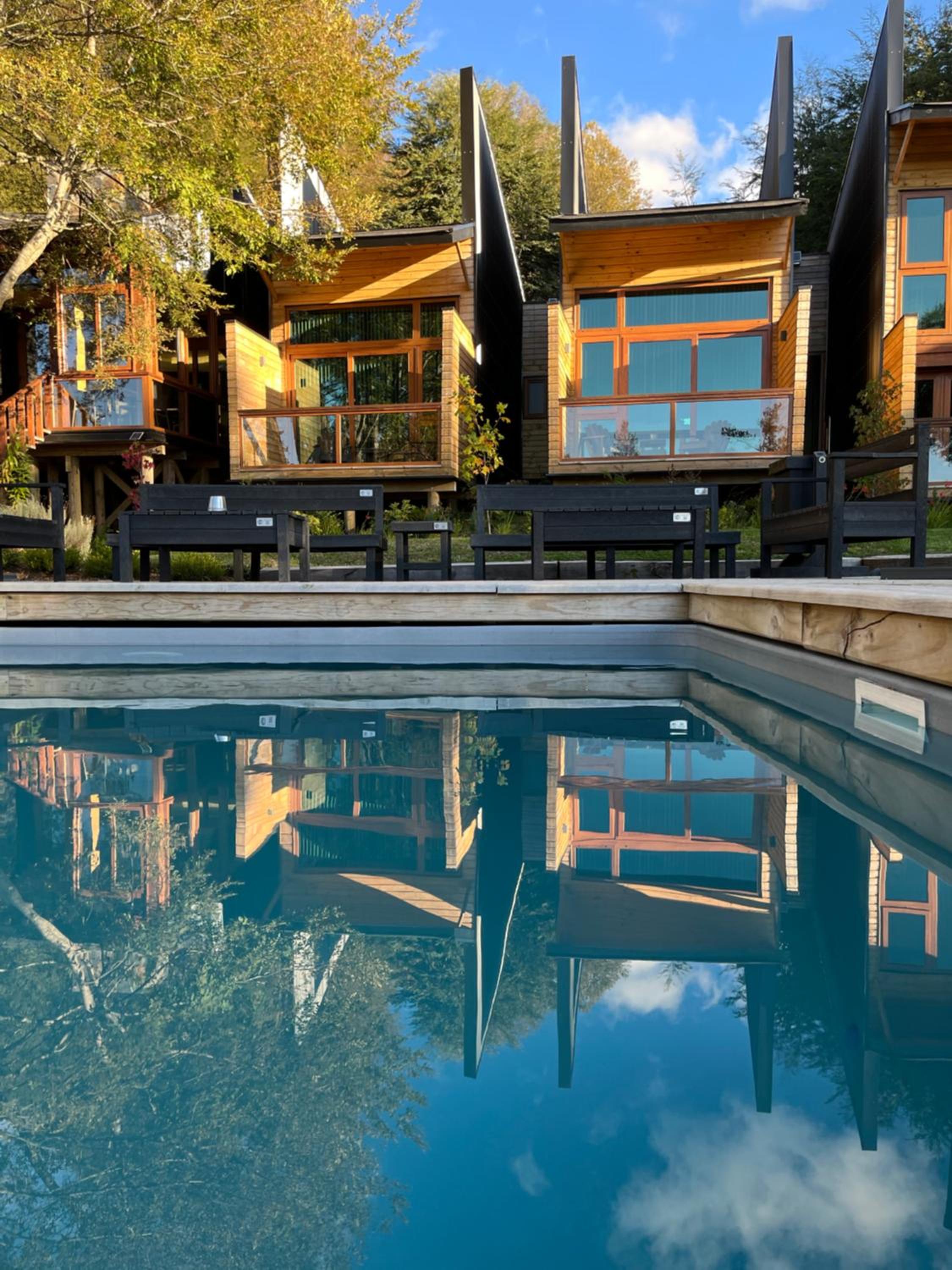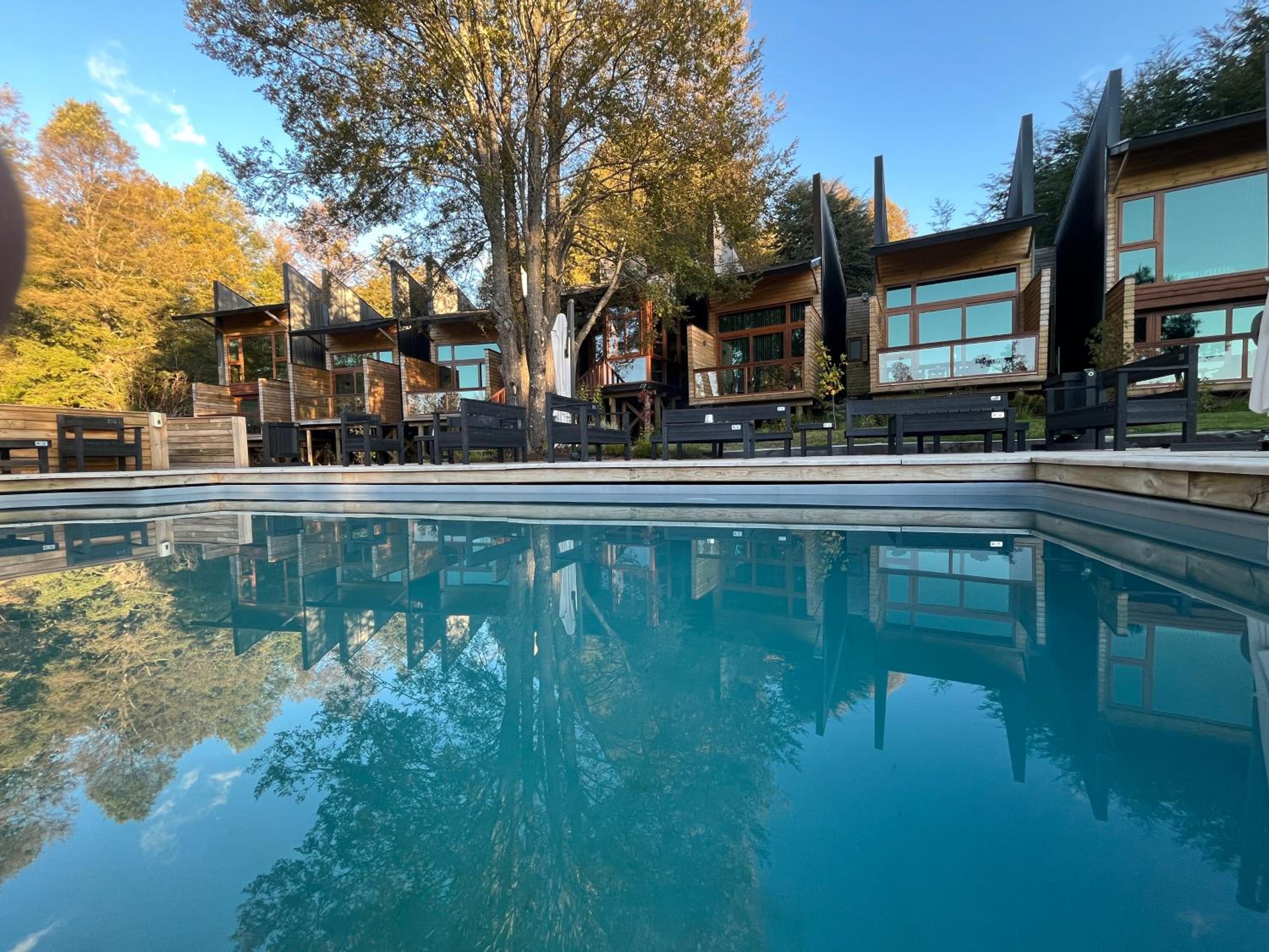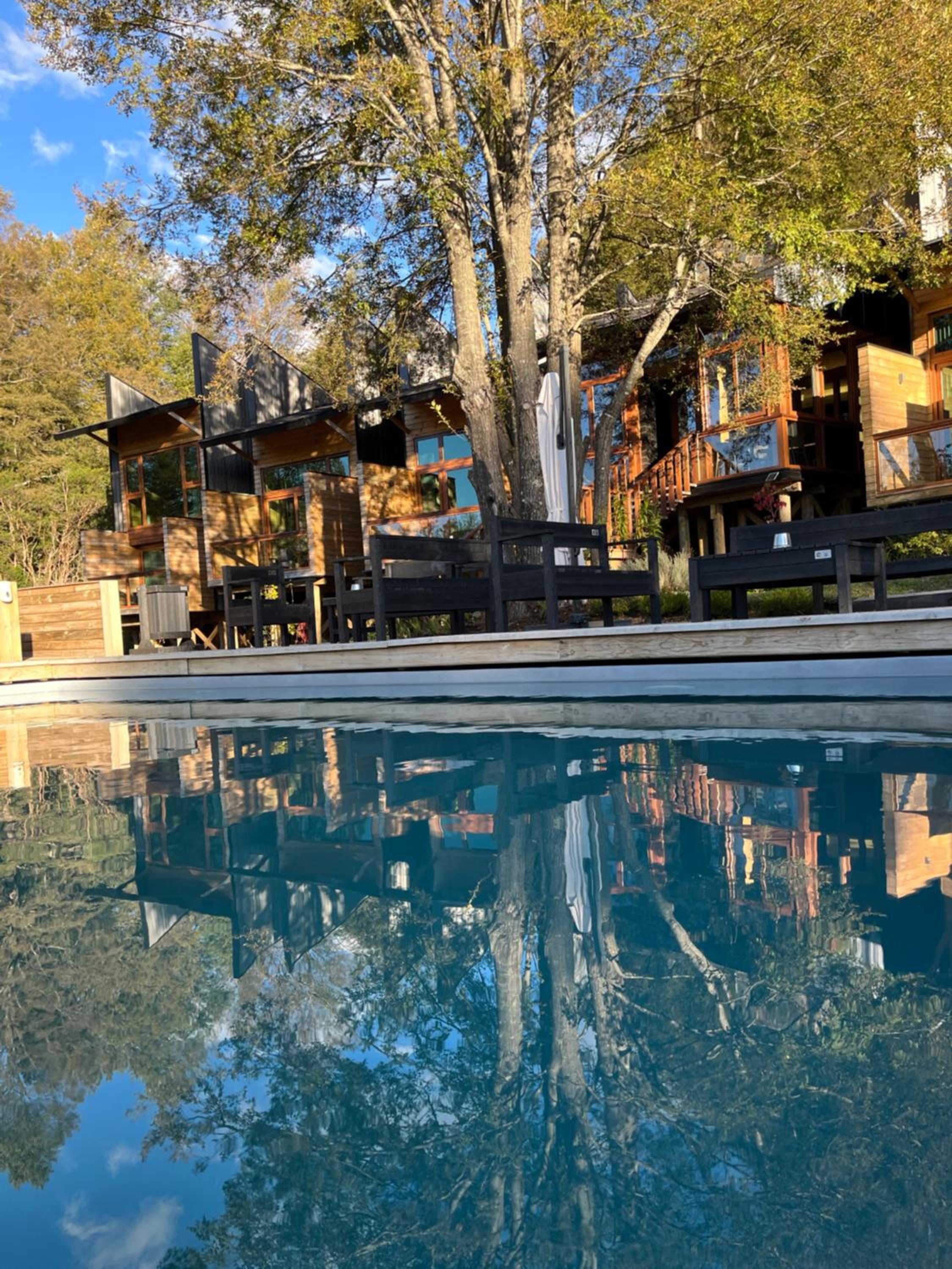 Unique boutique lodges in the middle of the forest and graciously far away from the touristy areas by the lake. Incredible, all-wood sustainable architecture, comfortable lodges with private balcony, scenic swimming pool with breathtaking sunset views on the Andes. Best breakfast of our Chilean tour and good dining with ample choice of cocktails.