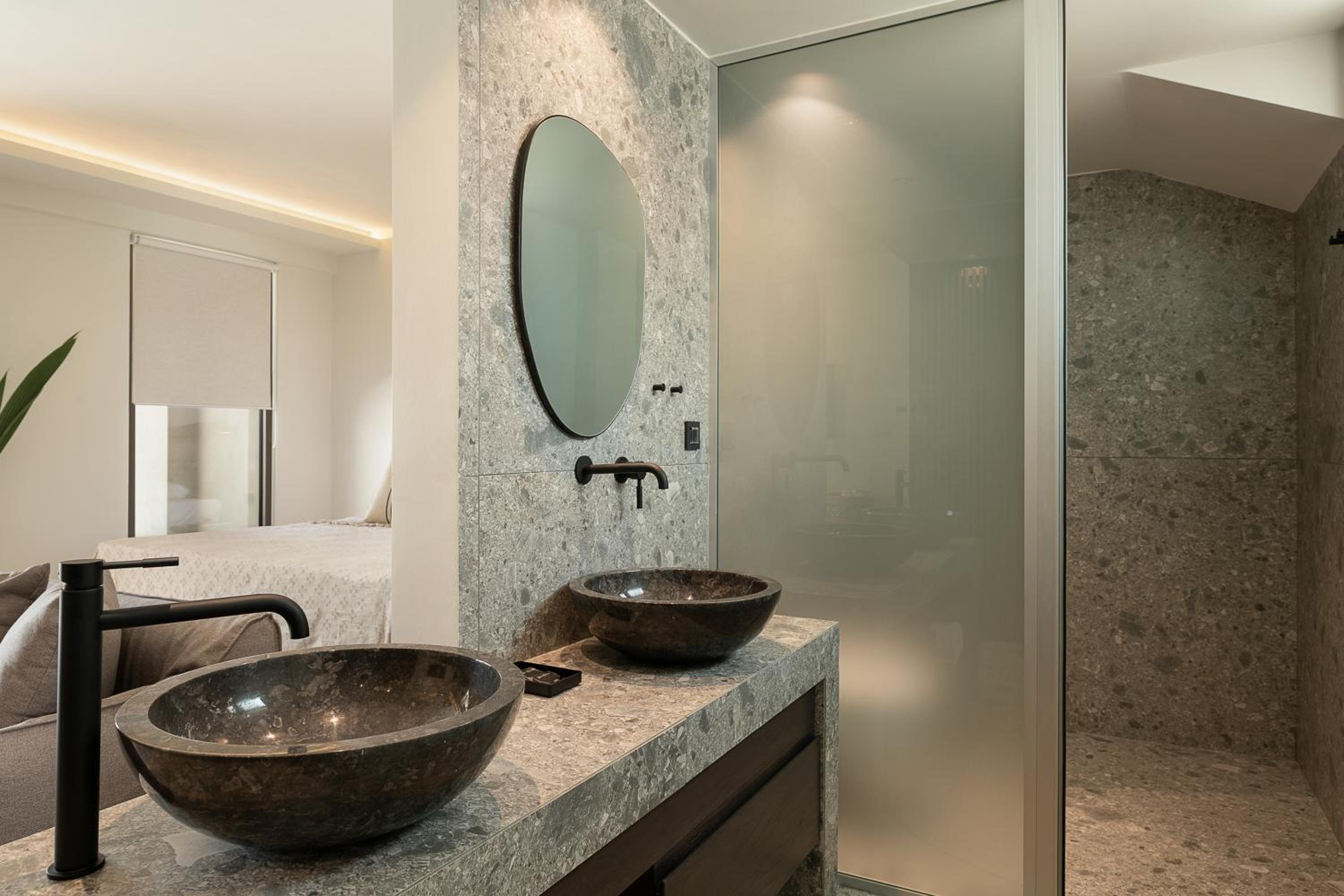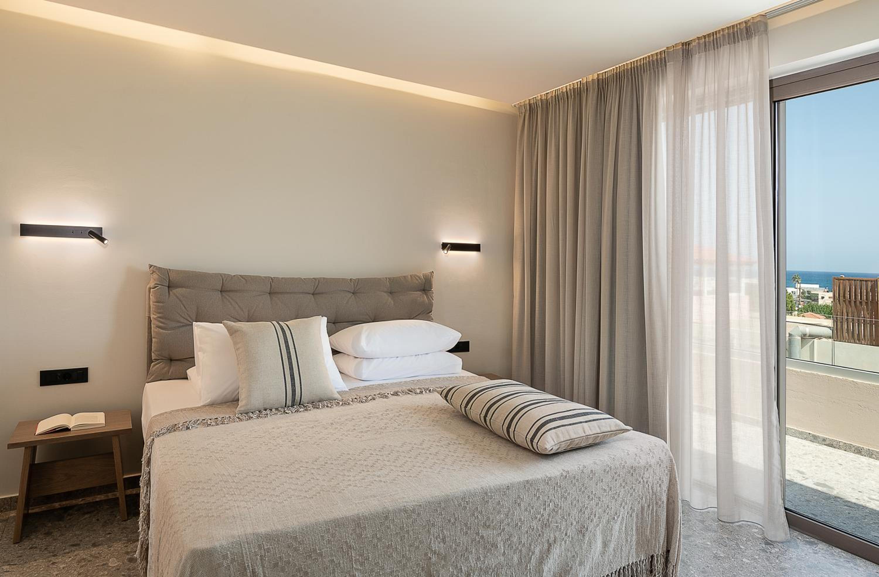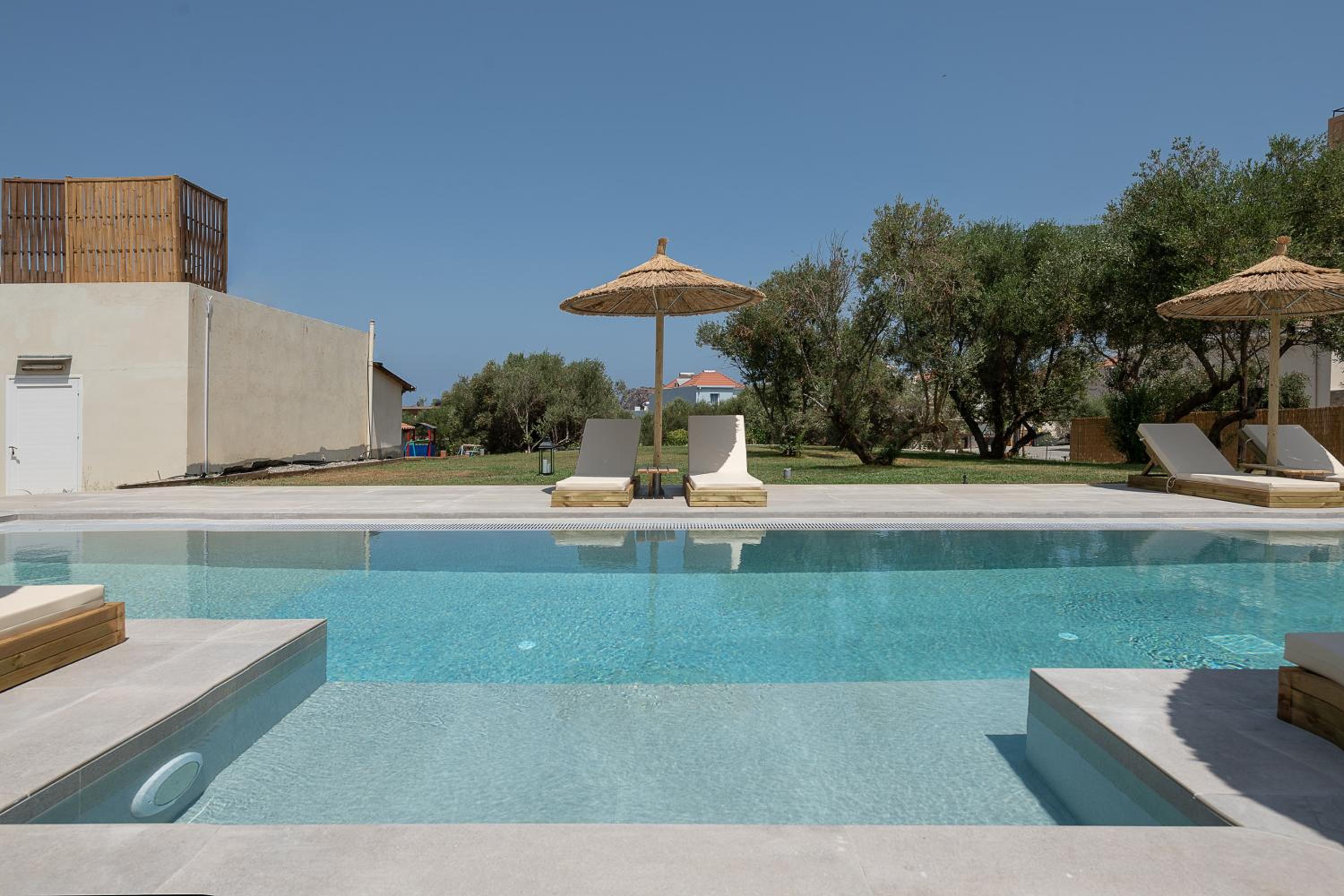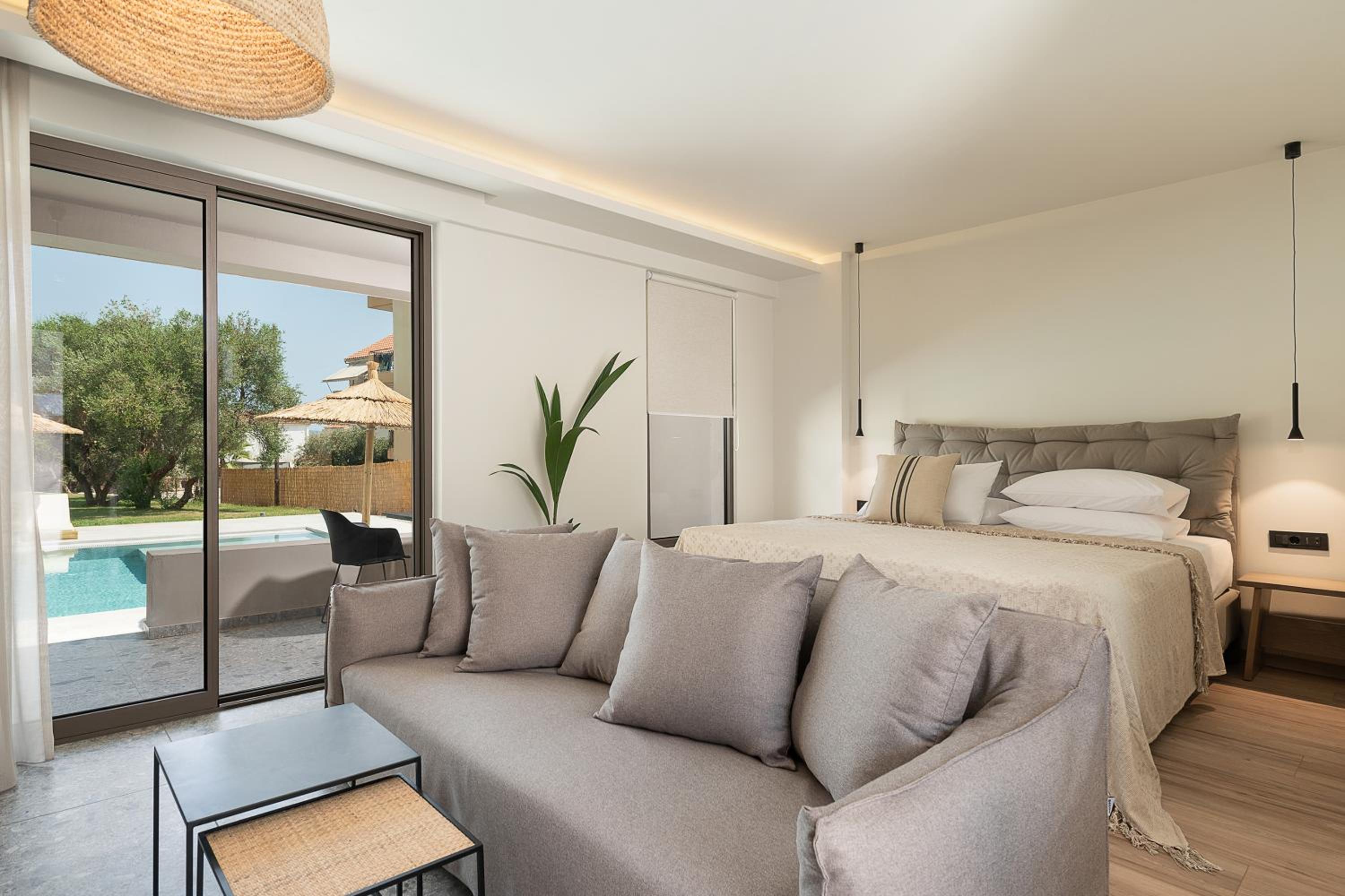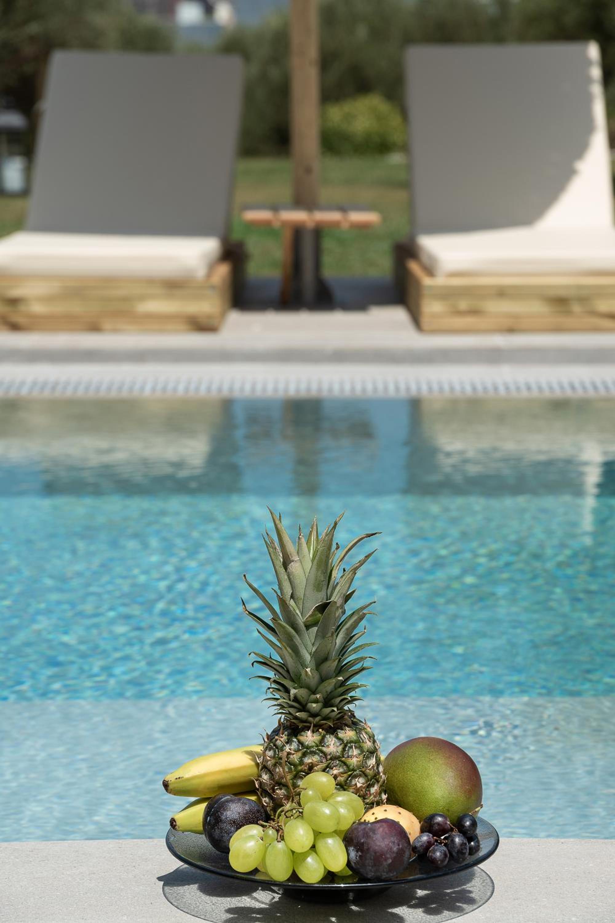 The room was furnished and equipped to a really high standard.Amazing bed, lovely sofa, great bathroom facilities, coffee maker.Lovely patio and with the pool outside the room just lovely.Christos was so lovely and helpful and accomodating - he even got quotes and arranged our taxi for onward travel.The room was sensational value - the food was also great for dinner and the breakfast.Also just 5 mins walk into town.