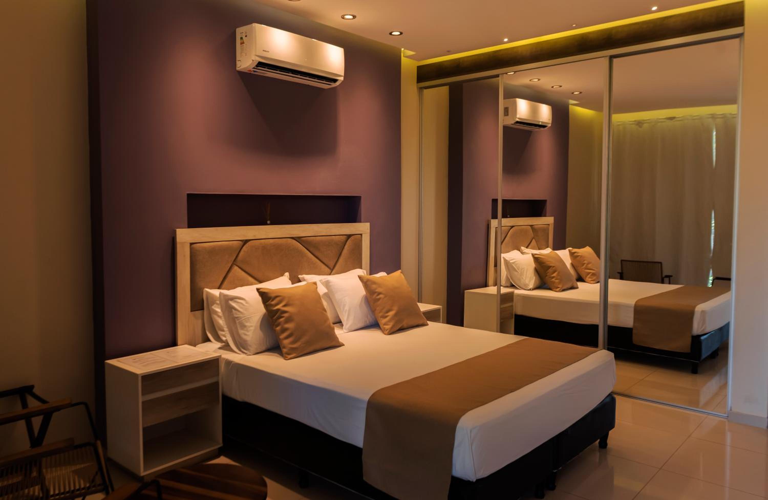 No nosso primeiro quarto tudo estava ruim, ar condicionado não funcionava, porta do guarda roupa não abria, a porta do quarto não fechava e o chuveiro estava imundo. Quando fomos trocados de quarto uma porta do guarda roupa não abria, mas o restante no segundo quarto estava bom. Tivemos problema também em emprestar um prato garfo e faca, queríamos apenas cortar o queijo que havíamos comprado para comer. E uma sugestão é colocar frigobar nos quartos pois sentimos muita falta de não ter um.