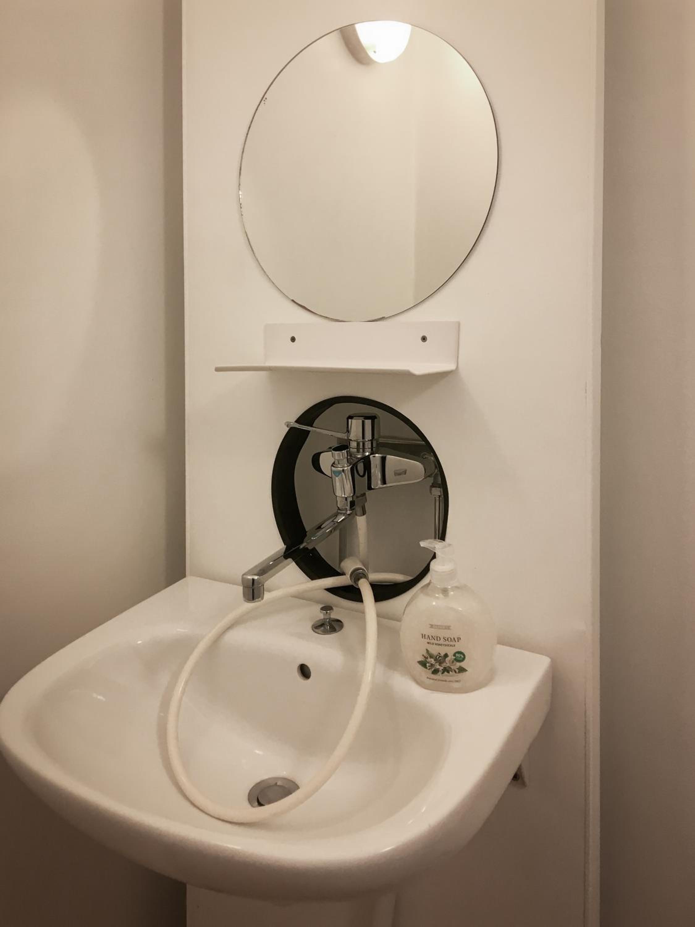 Inget handfat på toaletten.