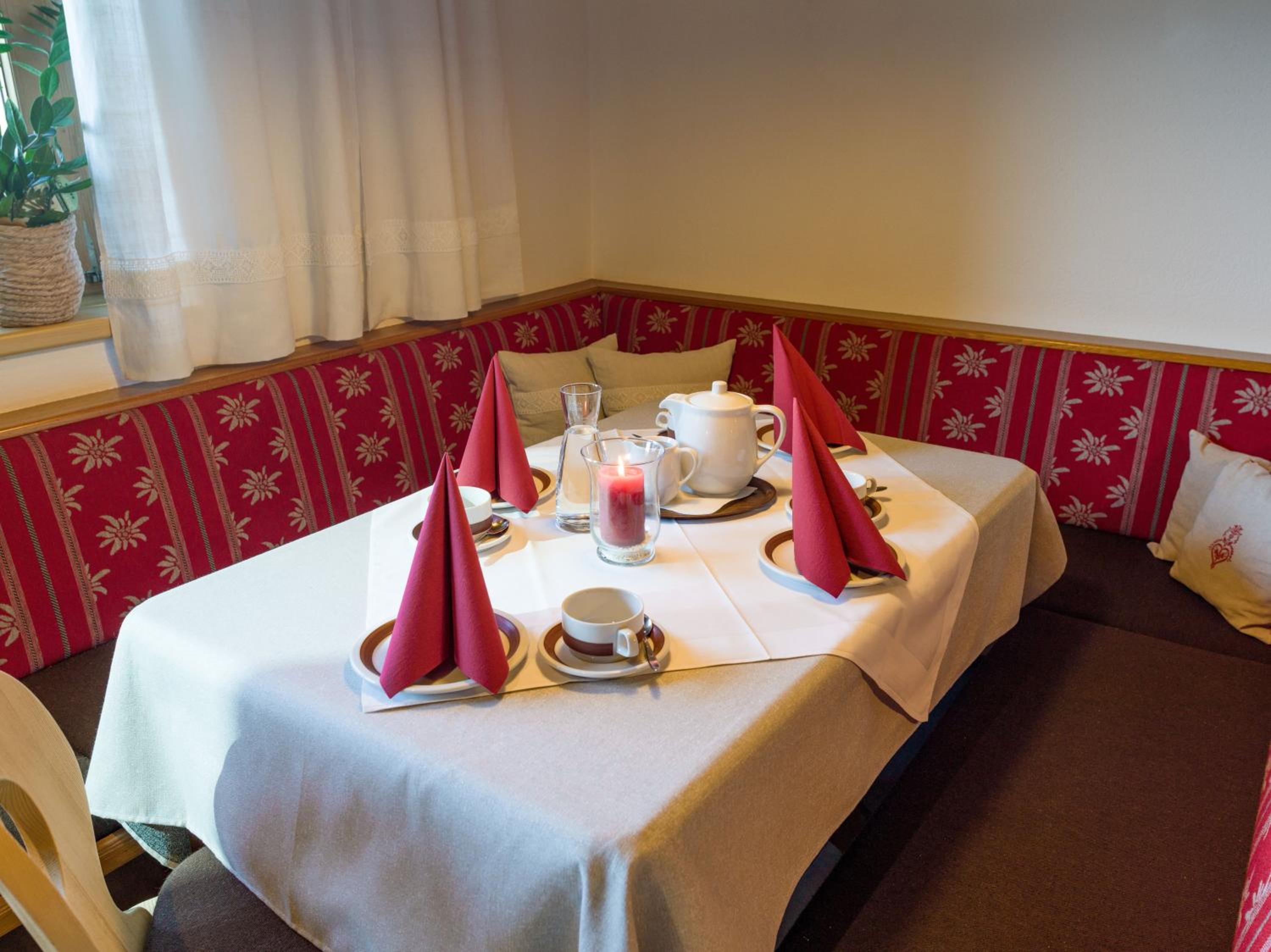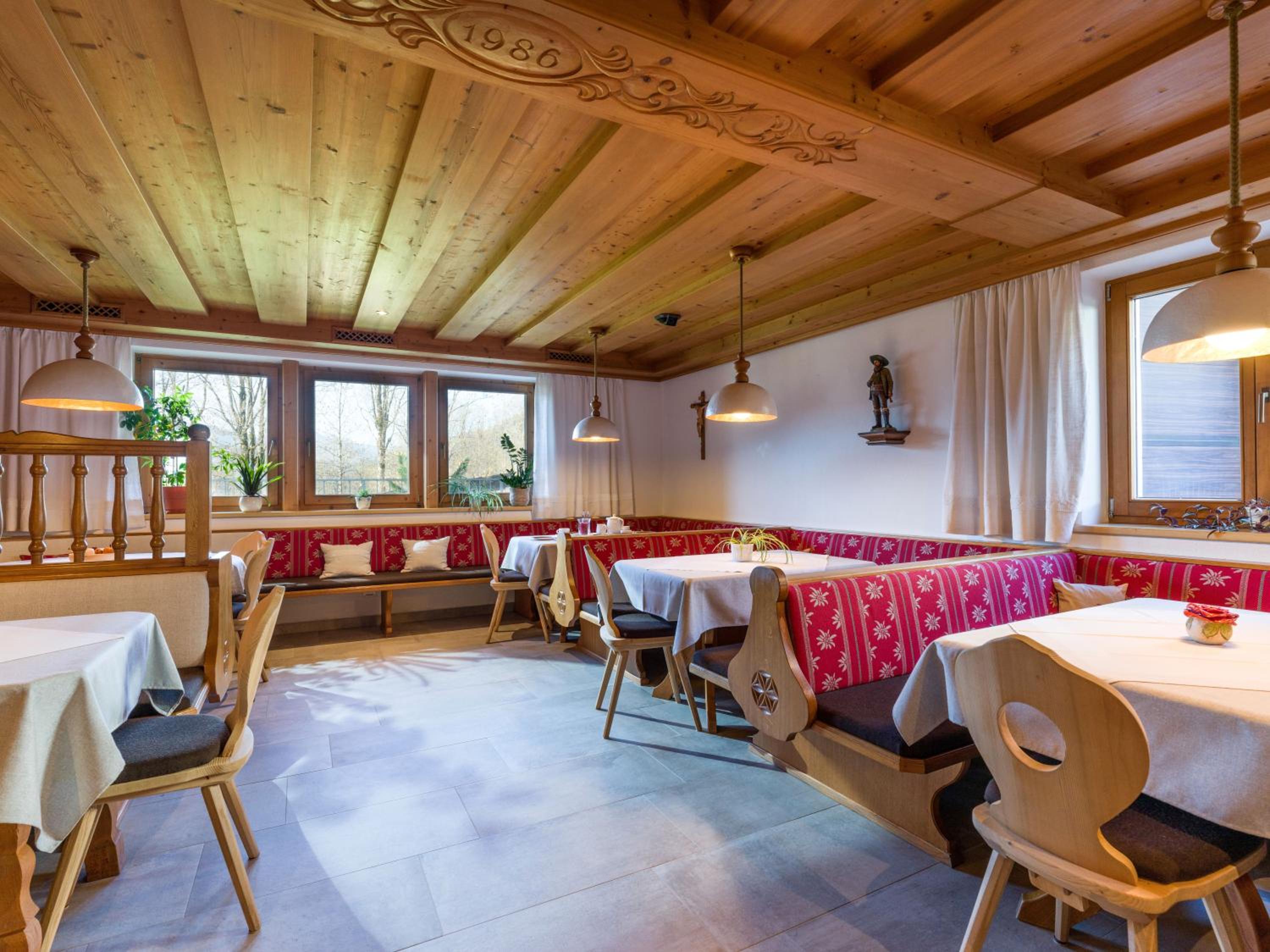 Breakfast is very nice, well organised, clean and the host was continuesly refreshing food/drinks. Room was very clean, location is perfect and surrounding nature is beautiful. Lots of hiking-possibilities. For those who want to ski: ski-elevators are just 5 minutes walking away from the hotel. Semi indoor-parking is very good and one can offload the car in front of the hotel. There is a fridge for everyone to use on the first floor: clean and big enough. Our host who checked us out was very correct: we didn't use the breakfast-option for the day we left so we didn't have to pay for it. Hotel has a traditional look, both inside and outside.