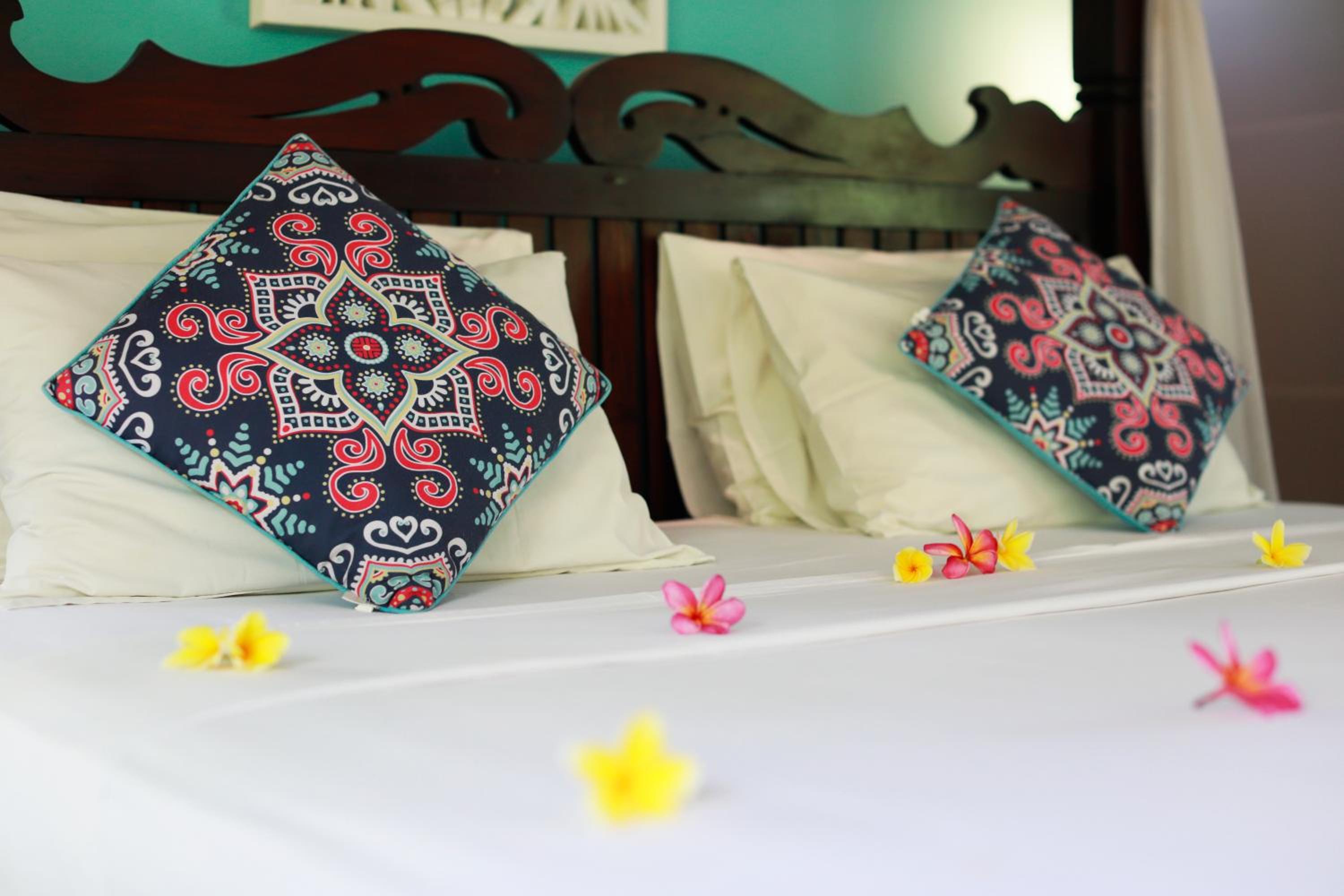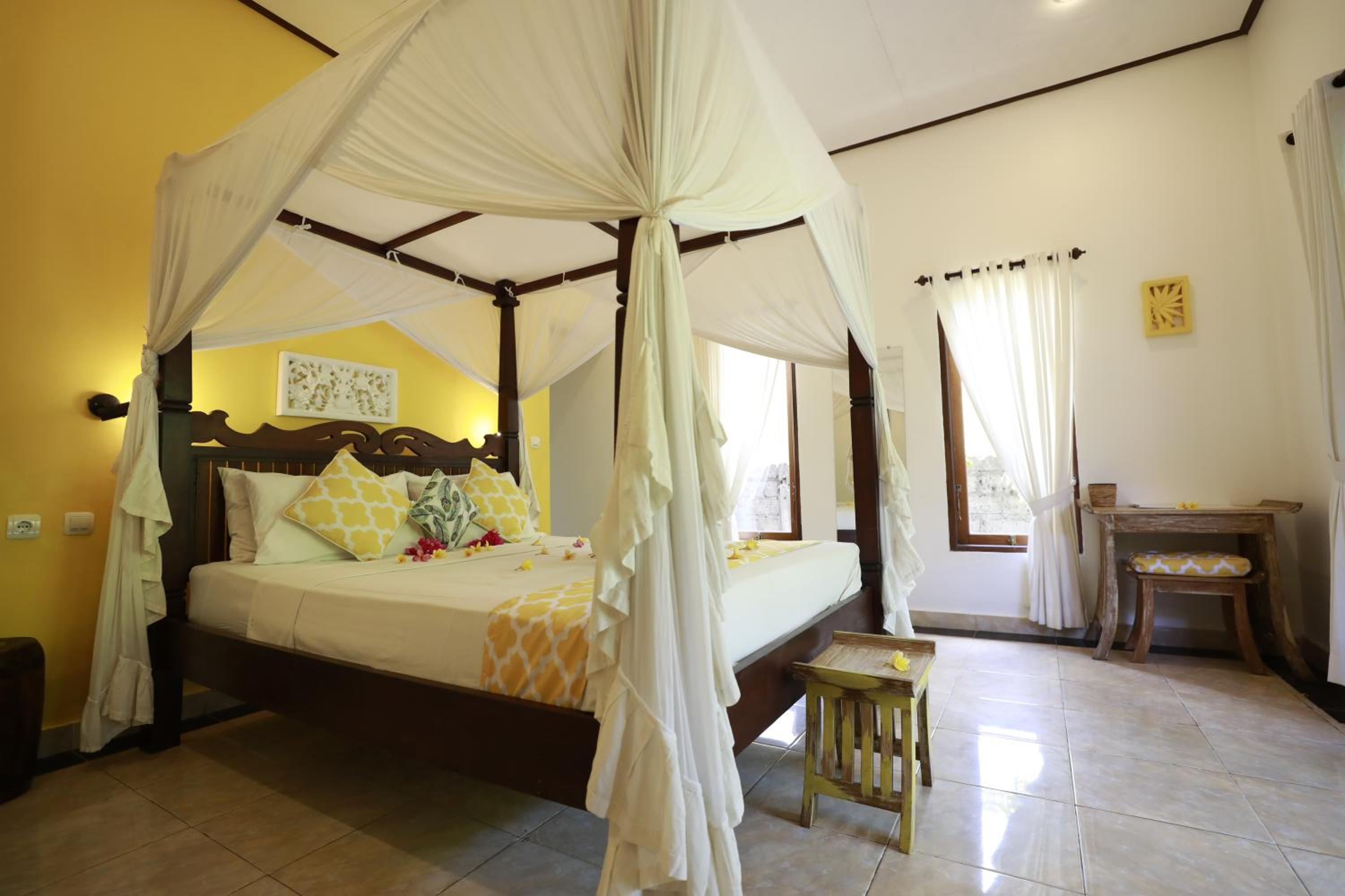 Kirana Homestay offers 4 vibrant bungalows with King or Queen canopy beds, A/C, free WIFI, and hot water. Three bungalows feature private kitchens, and one is a spacious family bungalow with a separate room for children.