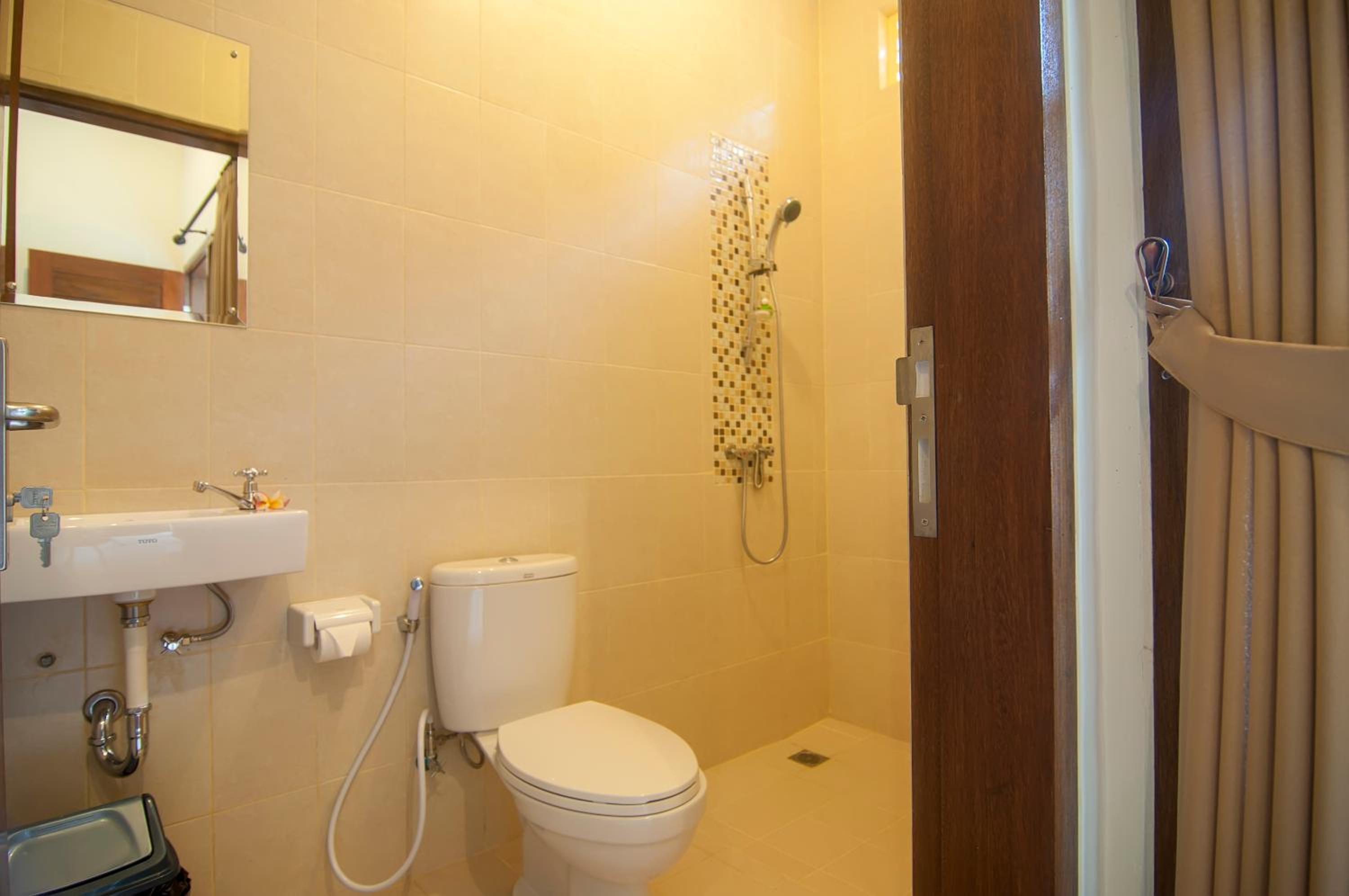 The modern room was pretty big, with tea/coffee kettle/things, a refrigerator, an AC, great wifi, and a Bali traditional environmentally-friendly wet bathroom, which is under the fresh air, not under AC. Staff spoke English, were friendly and tried the keep the guests happy. Close to the beach, although the beach was hallow with very warm water. Quiet area overall with some good options for cheap and not- cheap food.