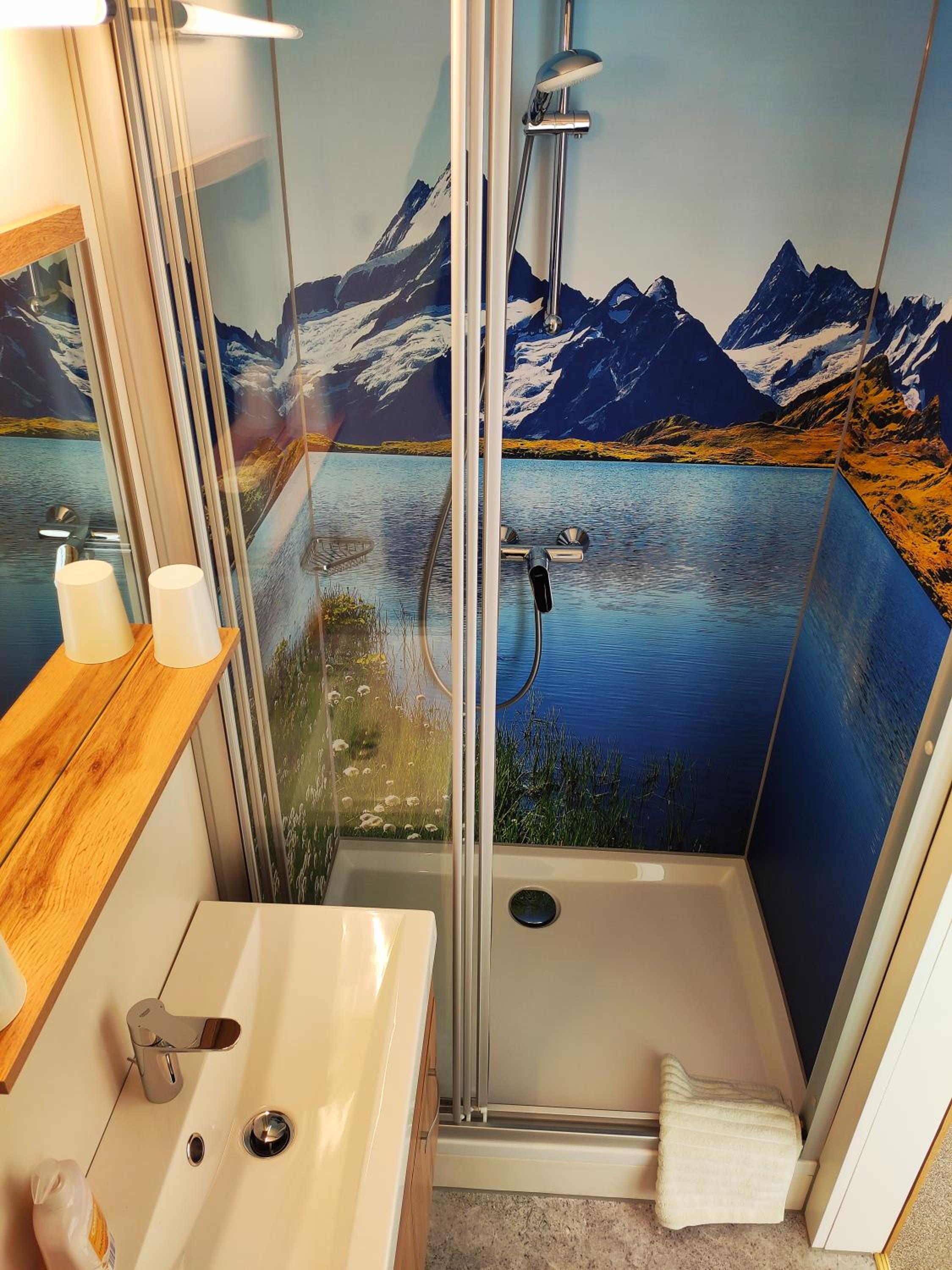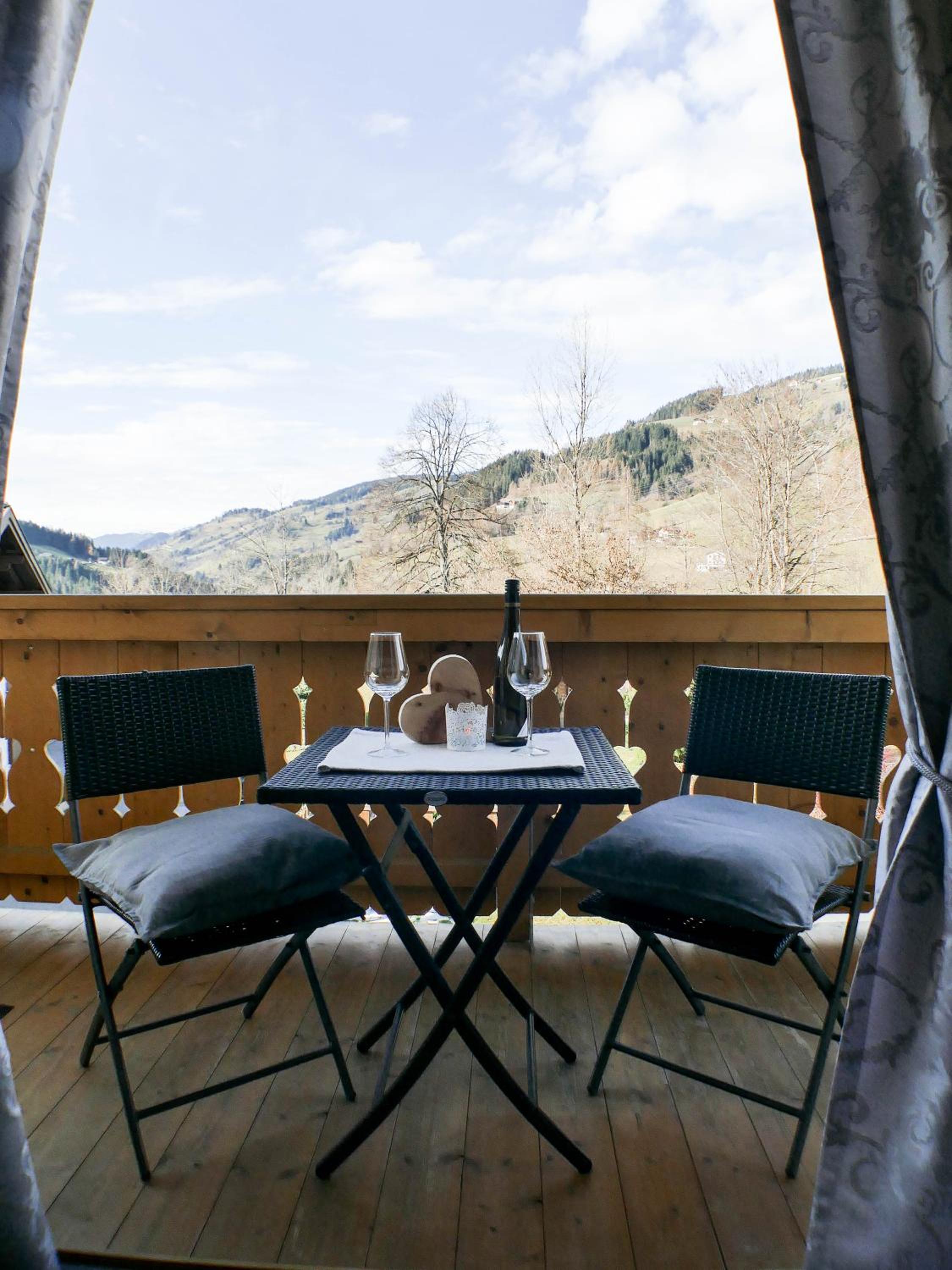Scenic Views and Comfortable Stay: Enjoy Alpine-style rooms with balconies offering breathtaking views of the landscape. Each room is equipped with free WiFi, a flat-screen cable TV, and cozy amenities like a sofa and a bathroom with a shower and hairdryer.