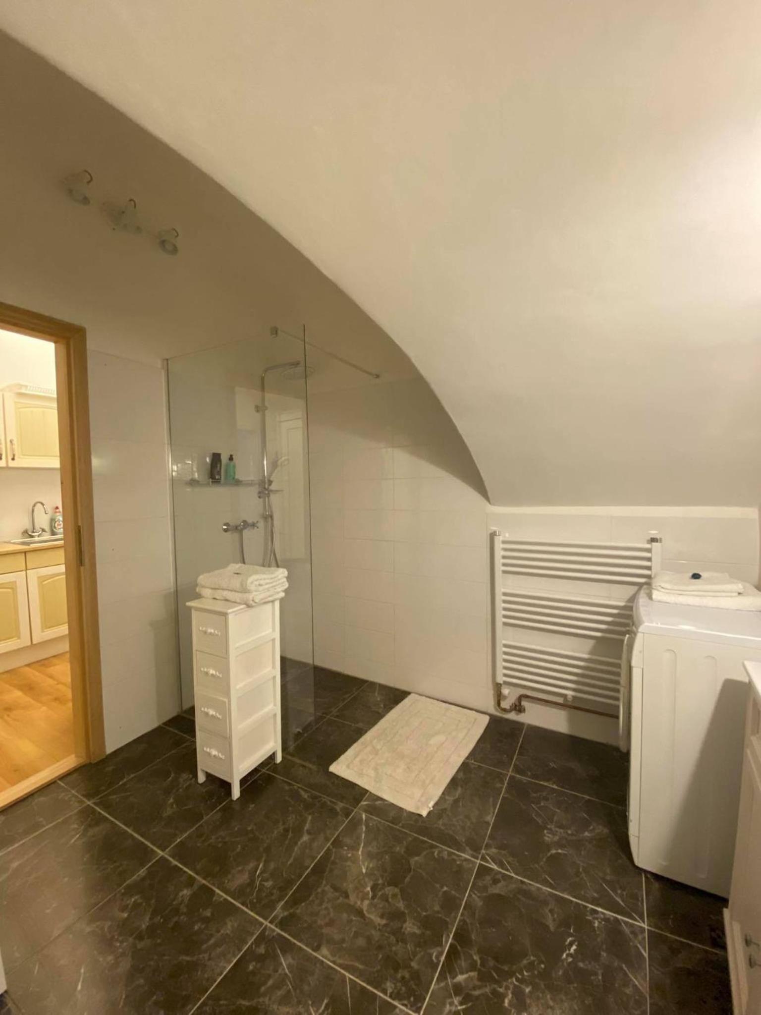 Velmi příjemný a vybavený apartmán s úžasnou koupelnou a zahradou. S bábovkou na stole. Úžasný majitele moc dekuju