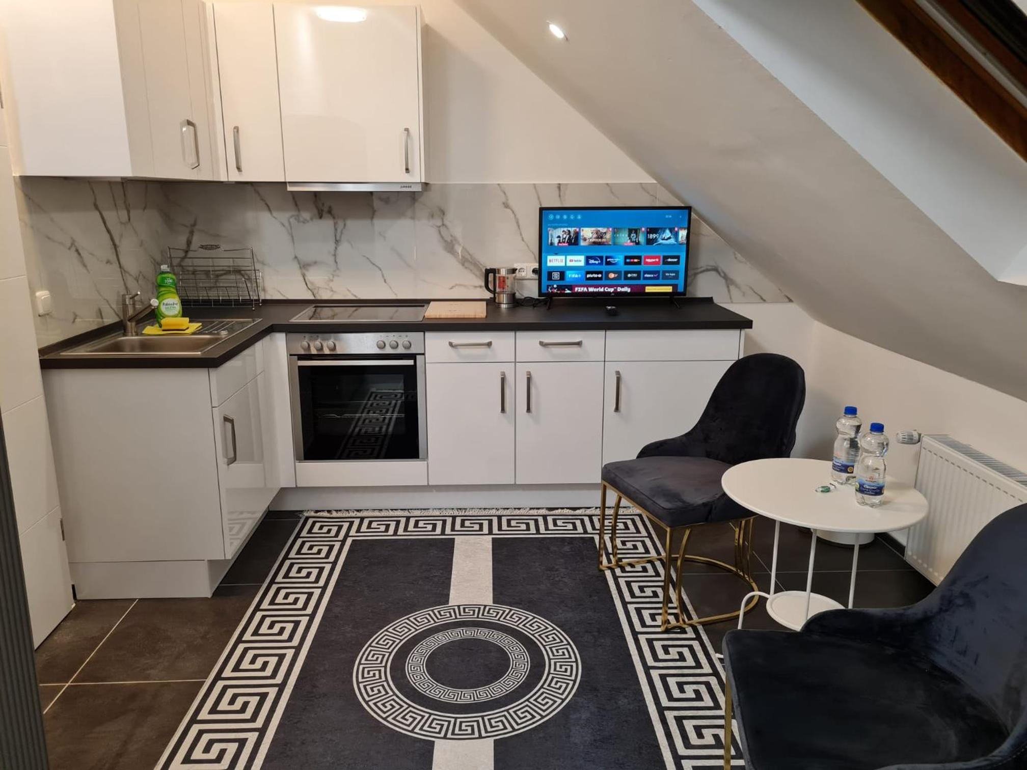 Im gebuchten Zimmer gab es keine Kaffeemaschine, Mikrowelle, keine Bier-, Wein/Sektgläser, lediglich 2 kleine Mehrzweckgläser. Nur 4 große Teller, keine kleineren. Keine Geschirrtücher. Gesamte Ausstattung der Küche eine Zumutung.