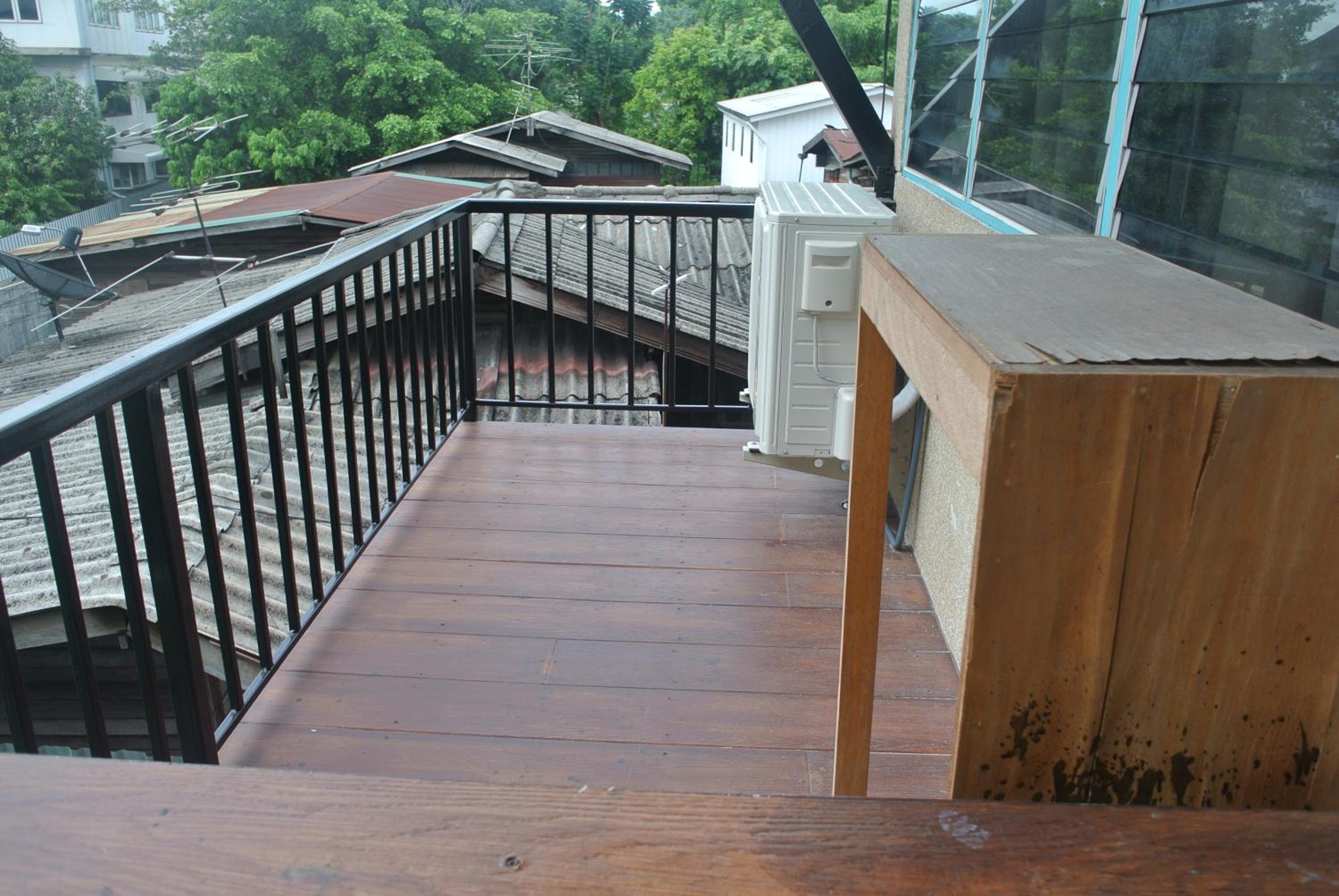 La petite terrasse collective avec eau chaude et eau froide en libre accès. La simplicité. La grande chambre pour un petit prix.