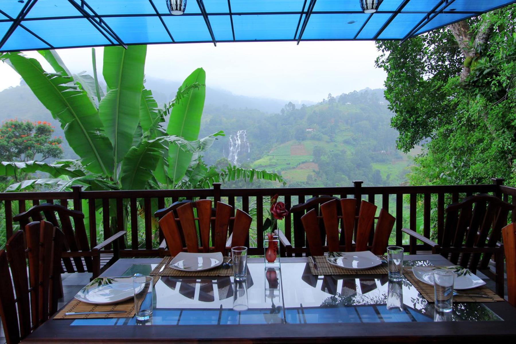le petit déjeuner au calme face a la cascade, à minutes a pied du centre très agité d'ELLA en passant par la voie ferrée. reposant et personnel agréable