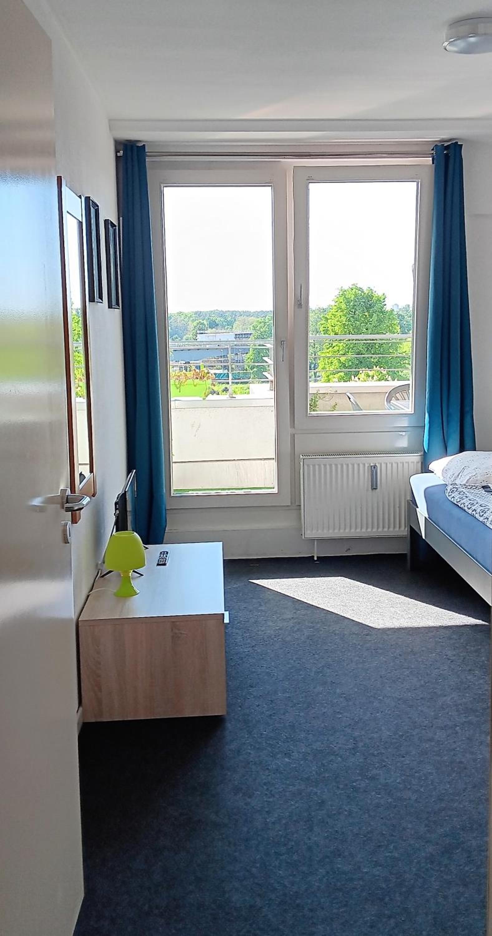 Zimmer mit Balkon und eigenem Bad.