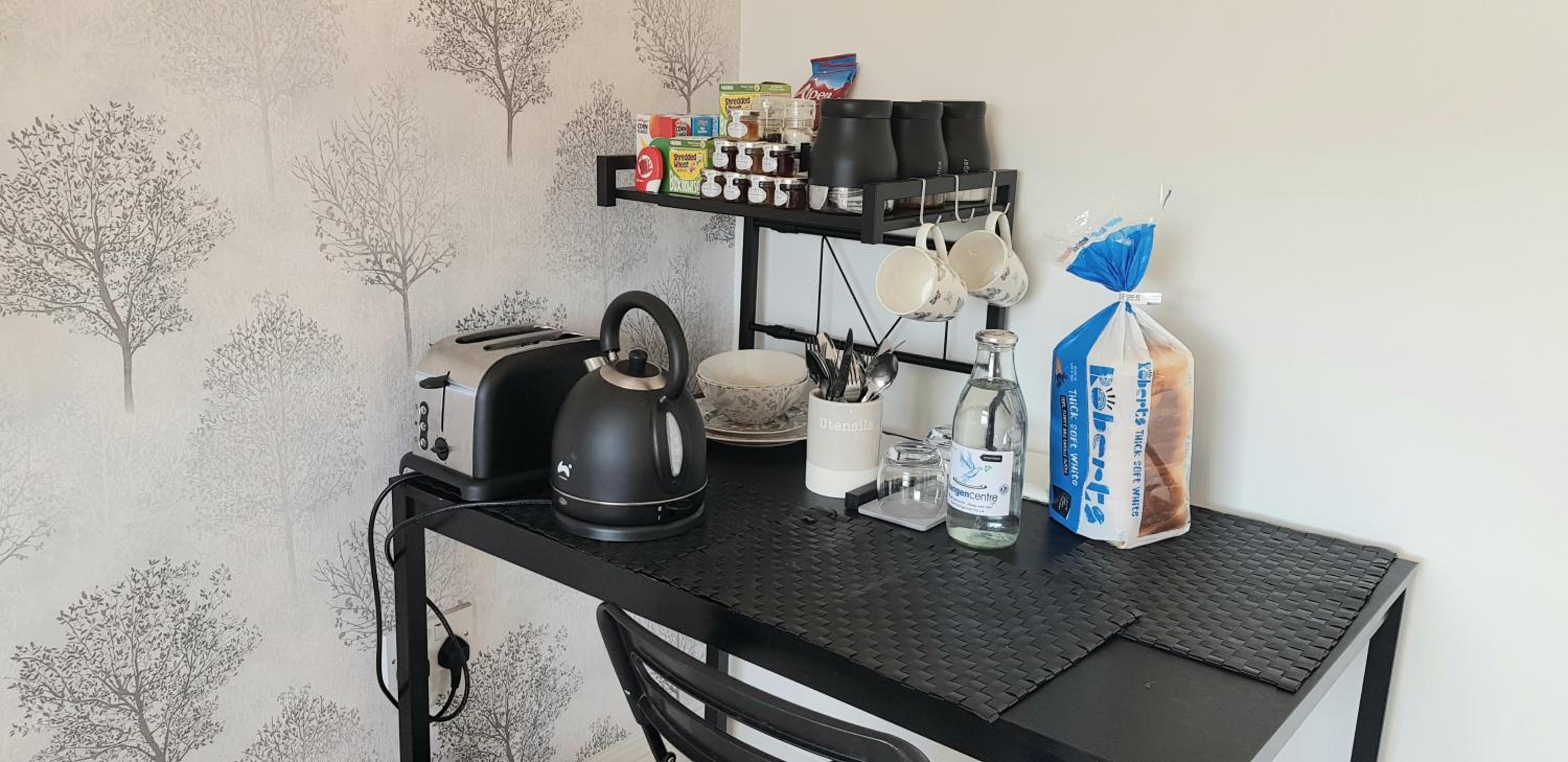 A separate room provided a sitting area with TV and a hospitality table of tea coffee bread jam cereals etc. With a fridge for the milk. Everything you could need was there.