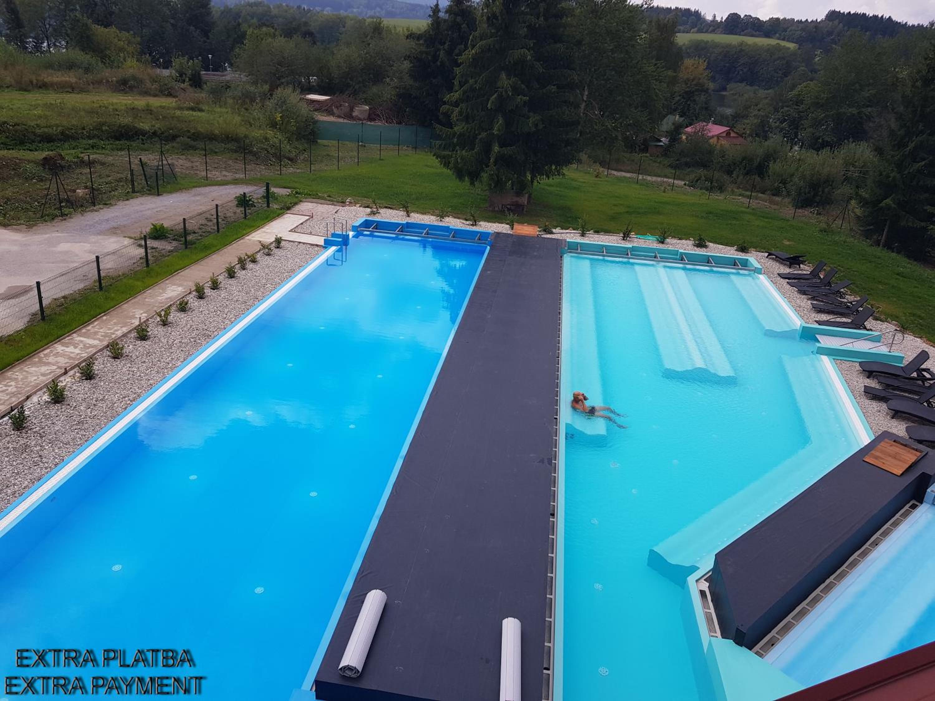 Experience breathtaking mountain views from Lipno Wellness - Frymburk C104 privat family room, featuring a rooftop pool and a balcony. Enjoy the serene lake and garden views, just 25 km from Castle Český Krumlov.