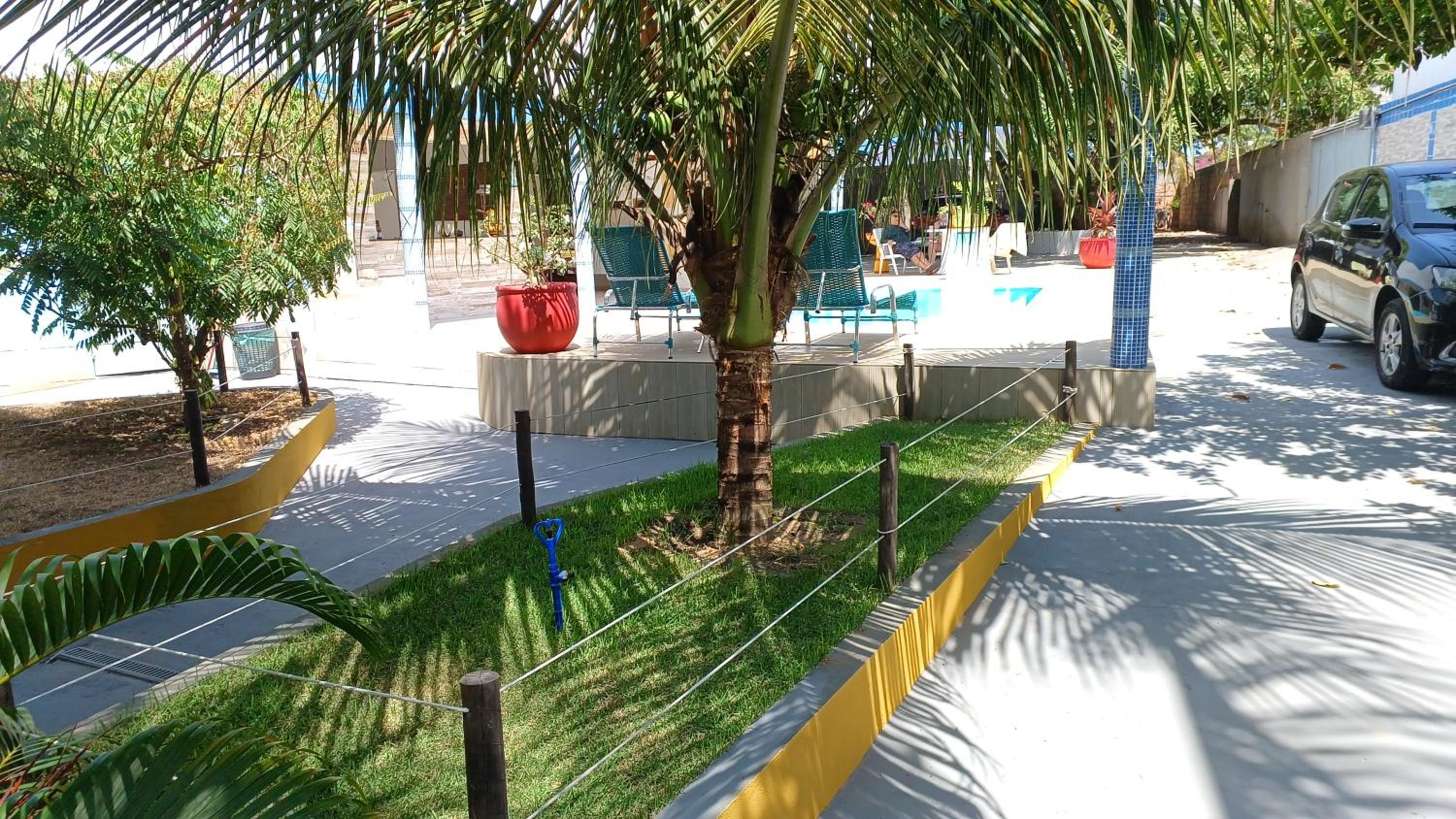 Enjoy the serene quiet street view from the terrace at Pousada Carvalhos - Camaçari. Relax by the pool with a picturesque backdrop, perfect for unwinding after a day of exploring the nearby attractions.