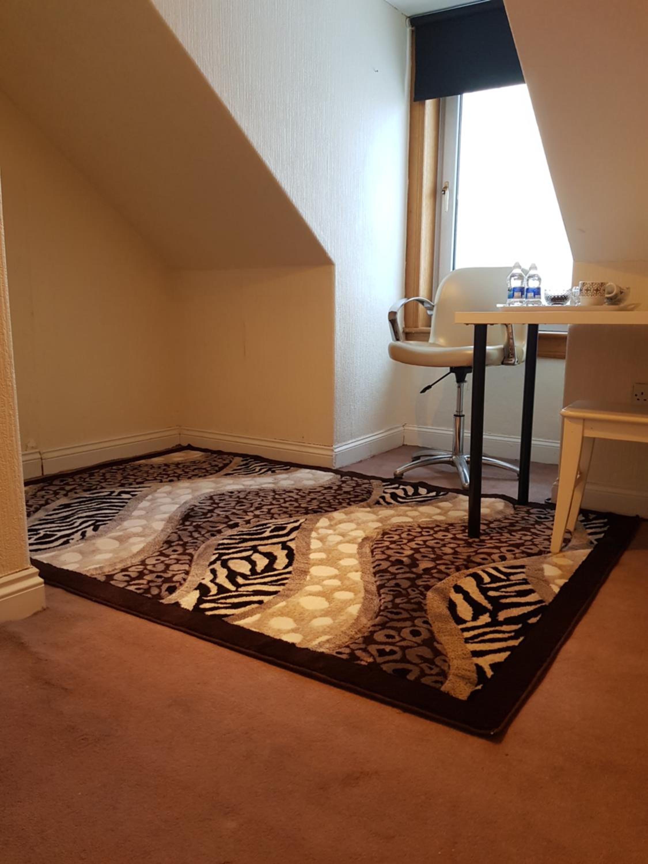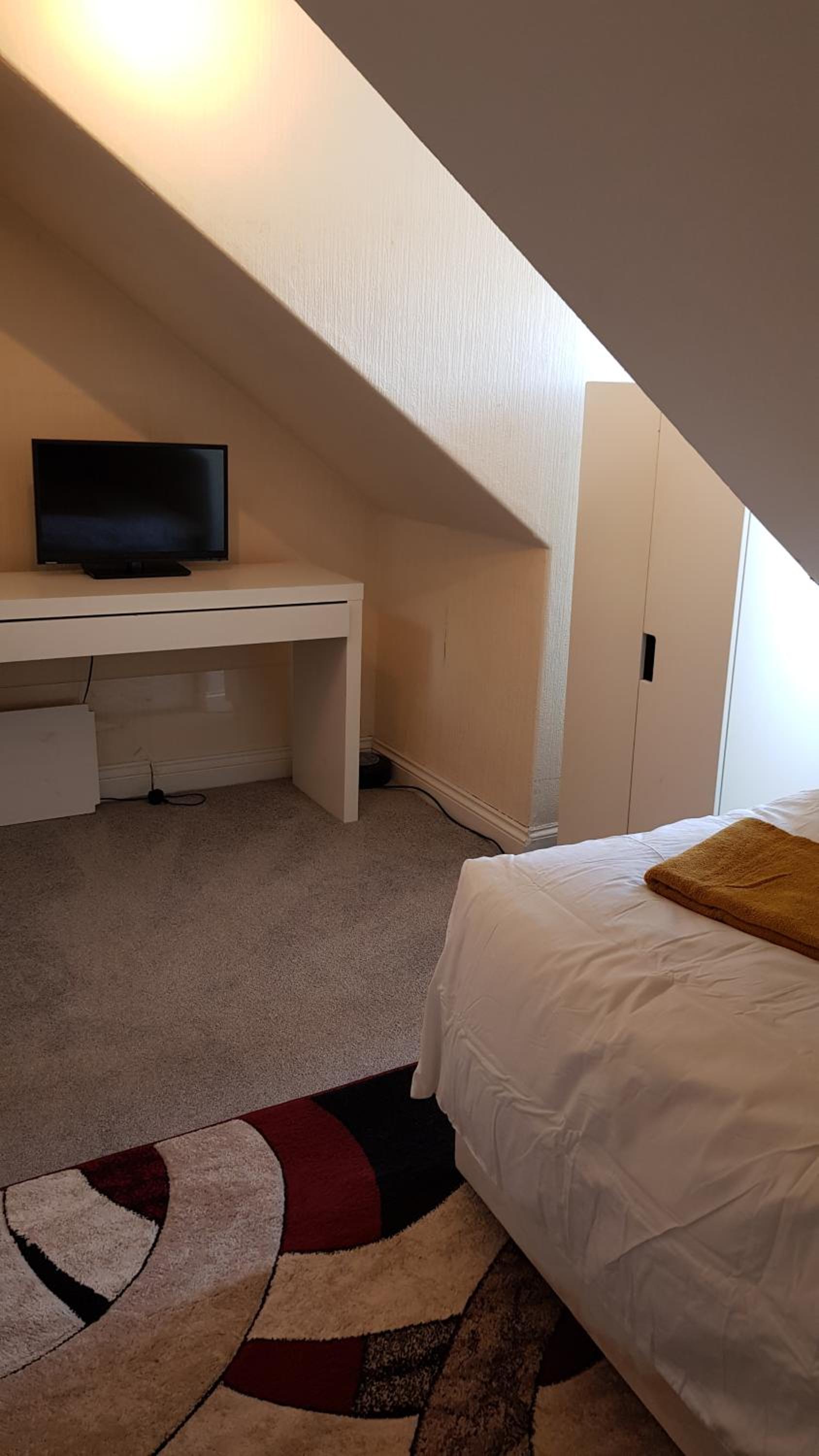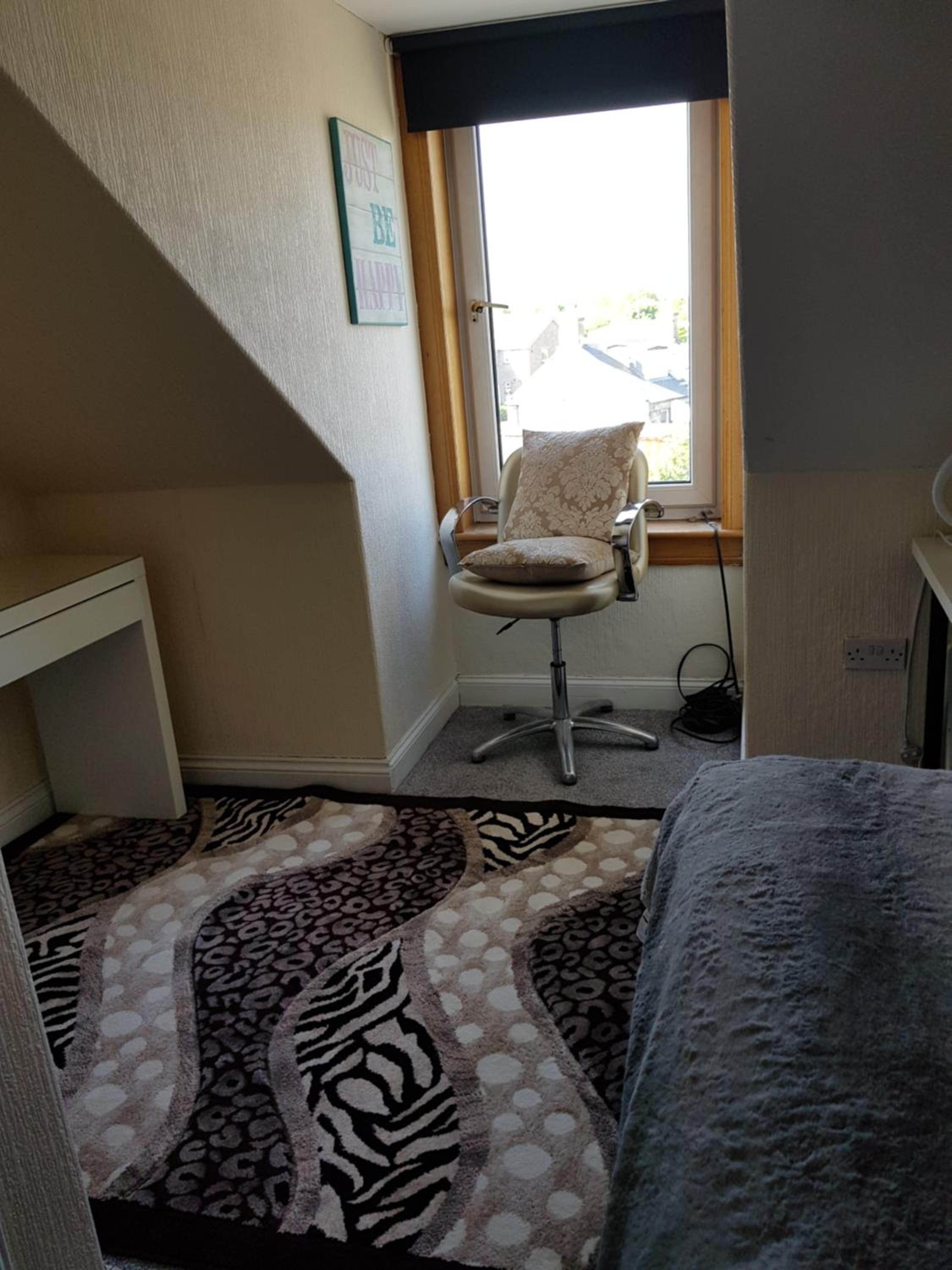 Bad room. No mirror, no drawers, no waste bin, no chair, no tea/coffee or kettle in room, no bedside table or bedside light. Long flight of black painted stairs, no light, no windows. Very dangerous. Window half obscured and remainder looks over mix of rooves. Fire risk and no notice of escape method. It was a grotty house, doss room and at £84 I feel cheated.