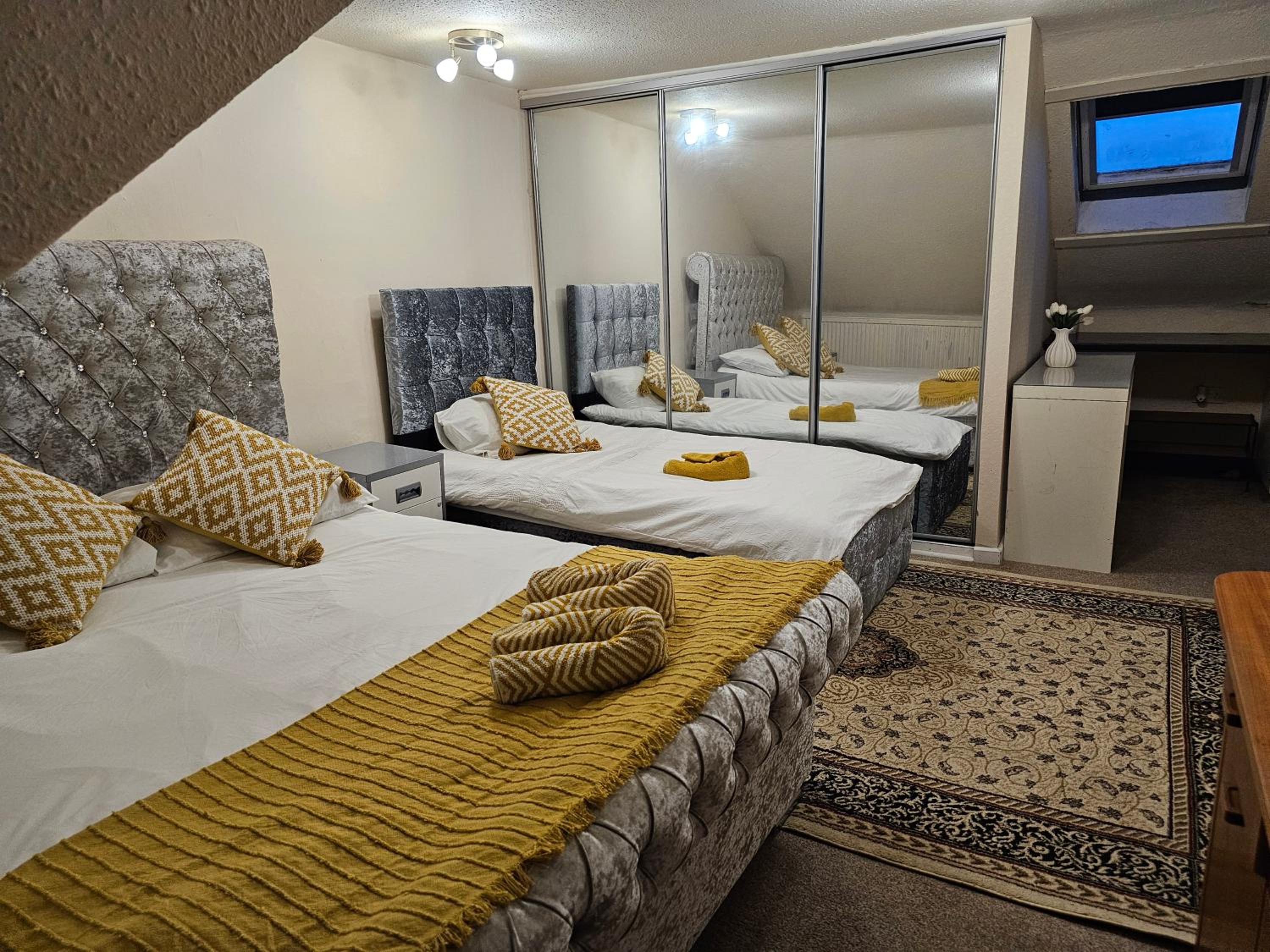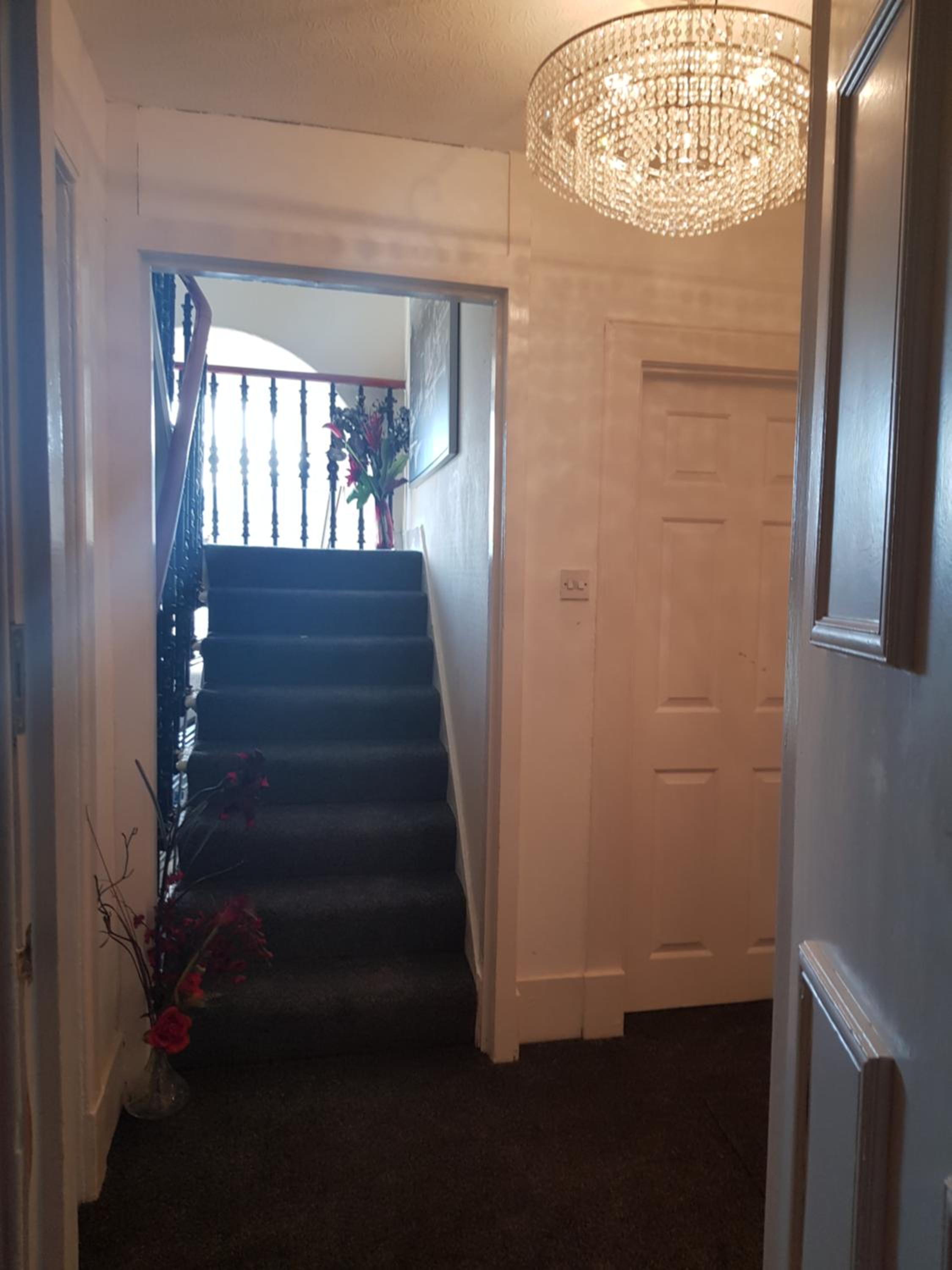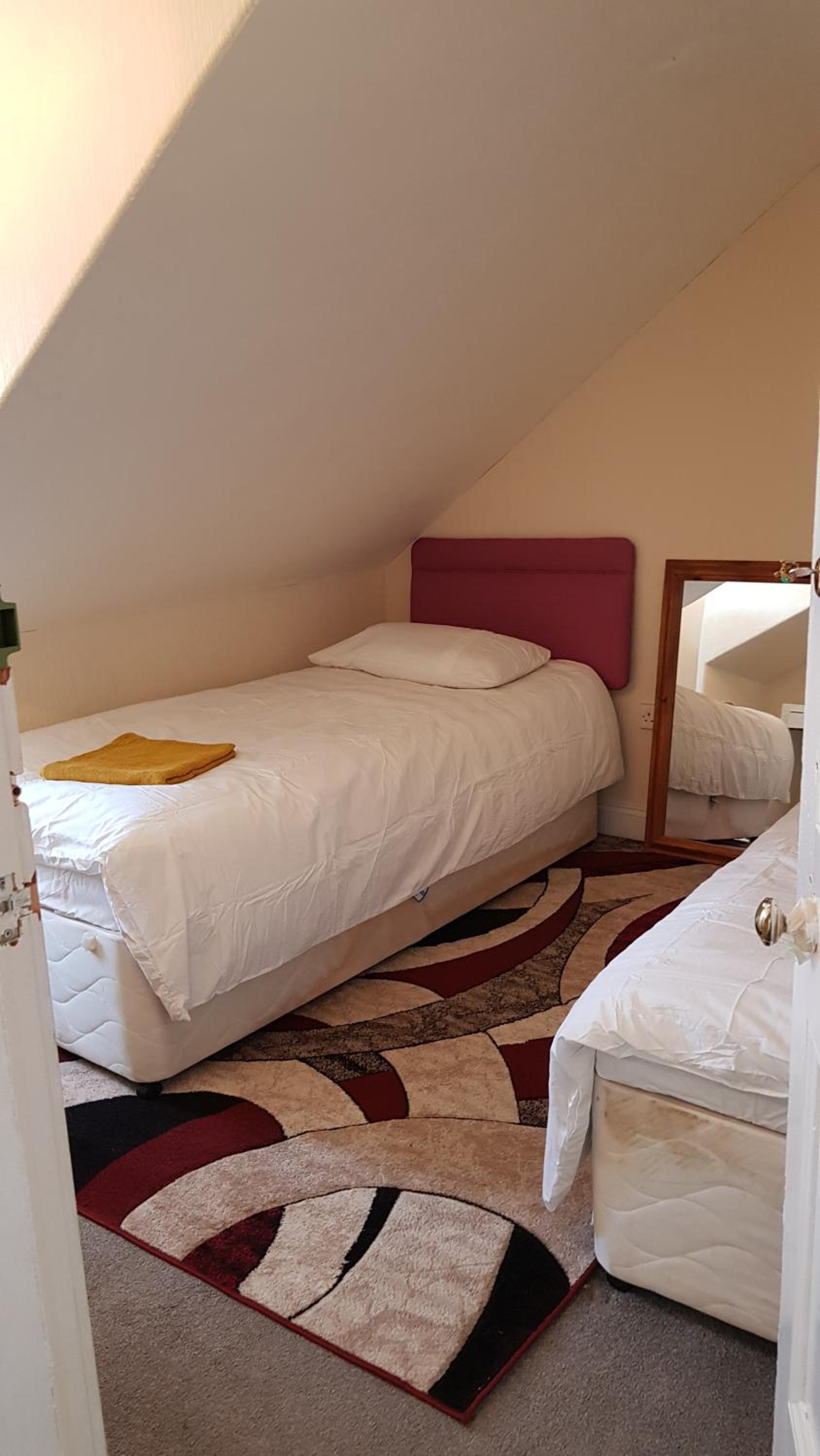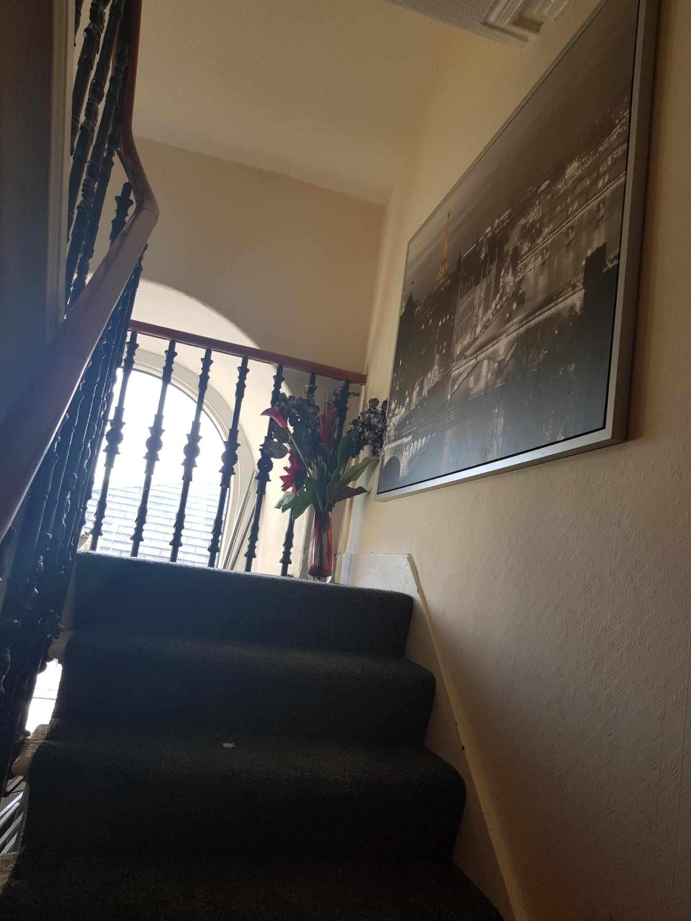 Bad room. No mirror, no drawers, no waste bin, no chair, no tea/coffee or kettle in room, no bedside table or bedside light. Long flight of black painted stairs, no light, no windows. Very dangerous. Window half obscured and remainder looks over mix of rooves. Fire risk and no notice of escape method. It was a grotty house, doss room and at £84 I feel cheated.