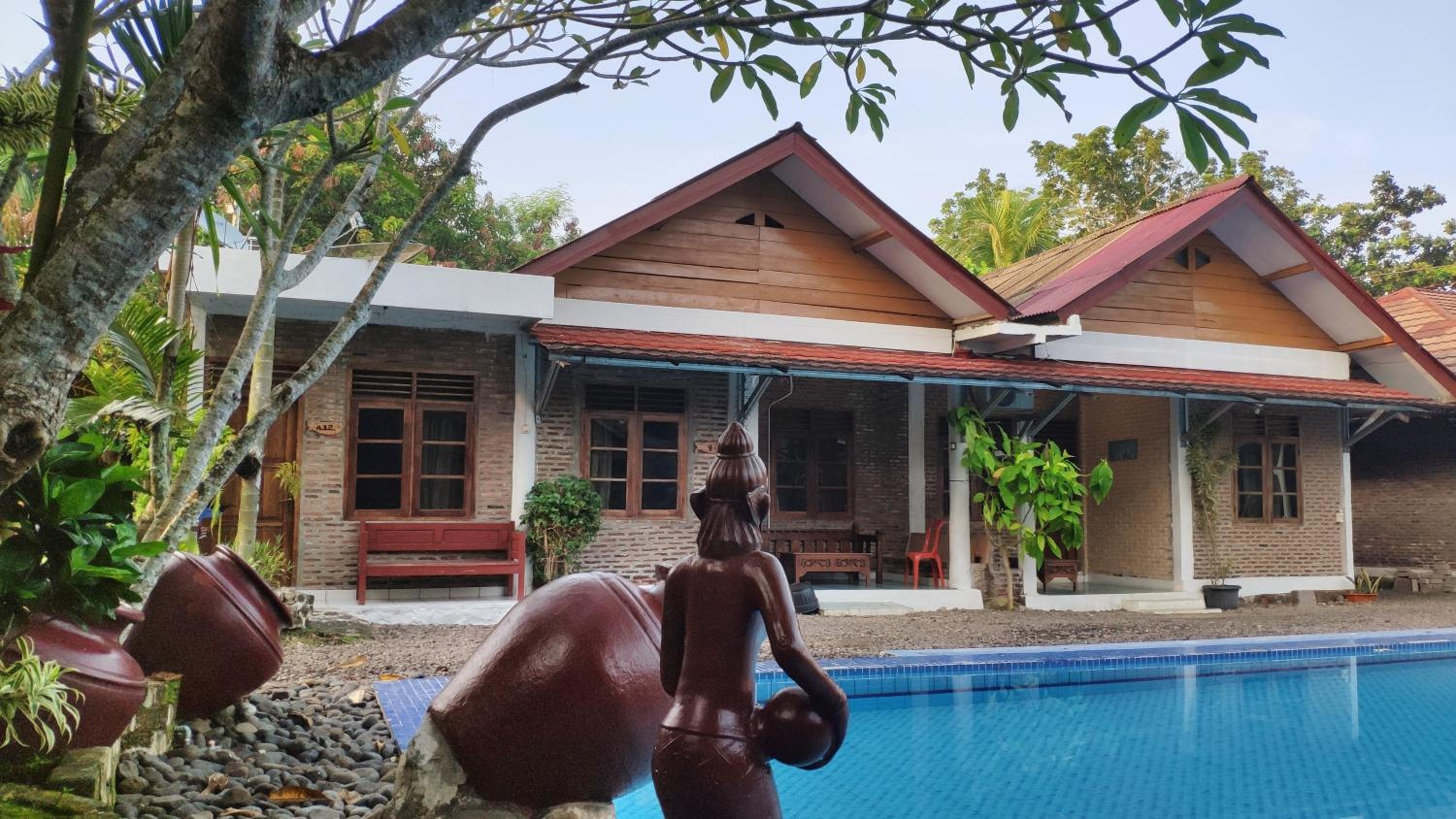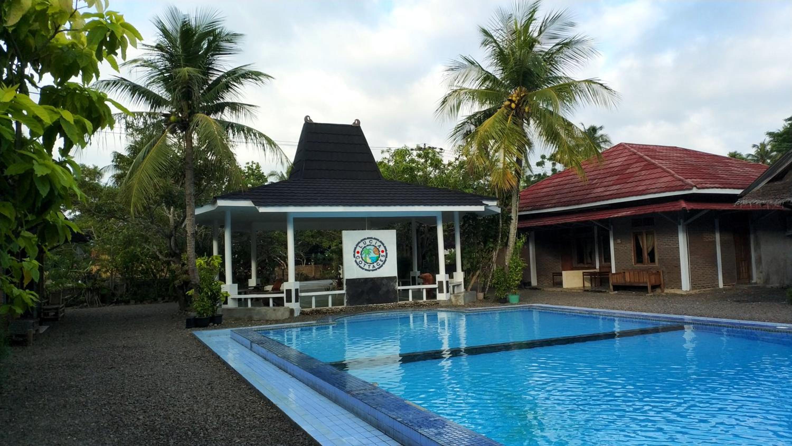 Enjoy a refreshing dip in the outdoor swimming pool or relax at the private beach area at Lucia Cottages. Perfect for unwinding after a day of exploring Carita Beach.