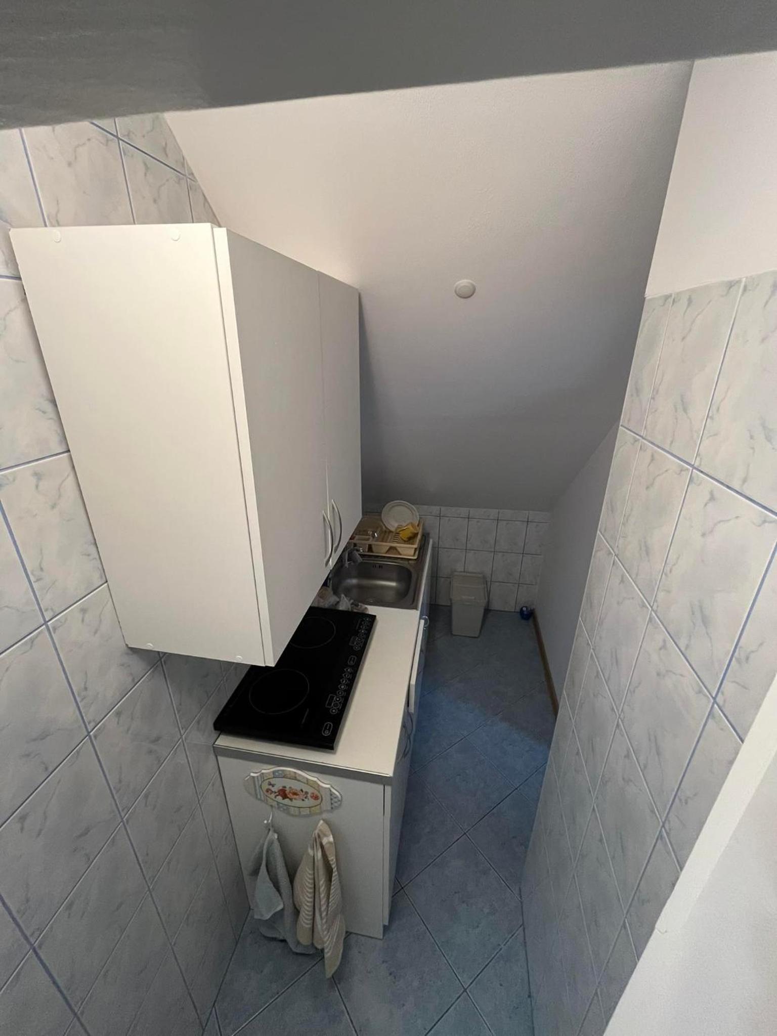 Mikroskopijna i ciemna kuchnia ledwo jedna osoba się zmieści.