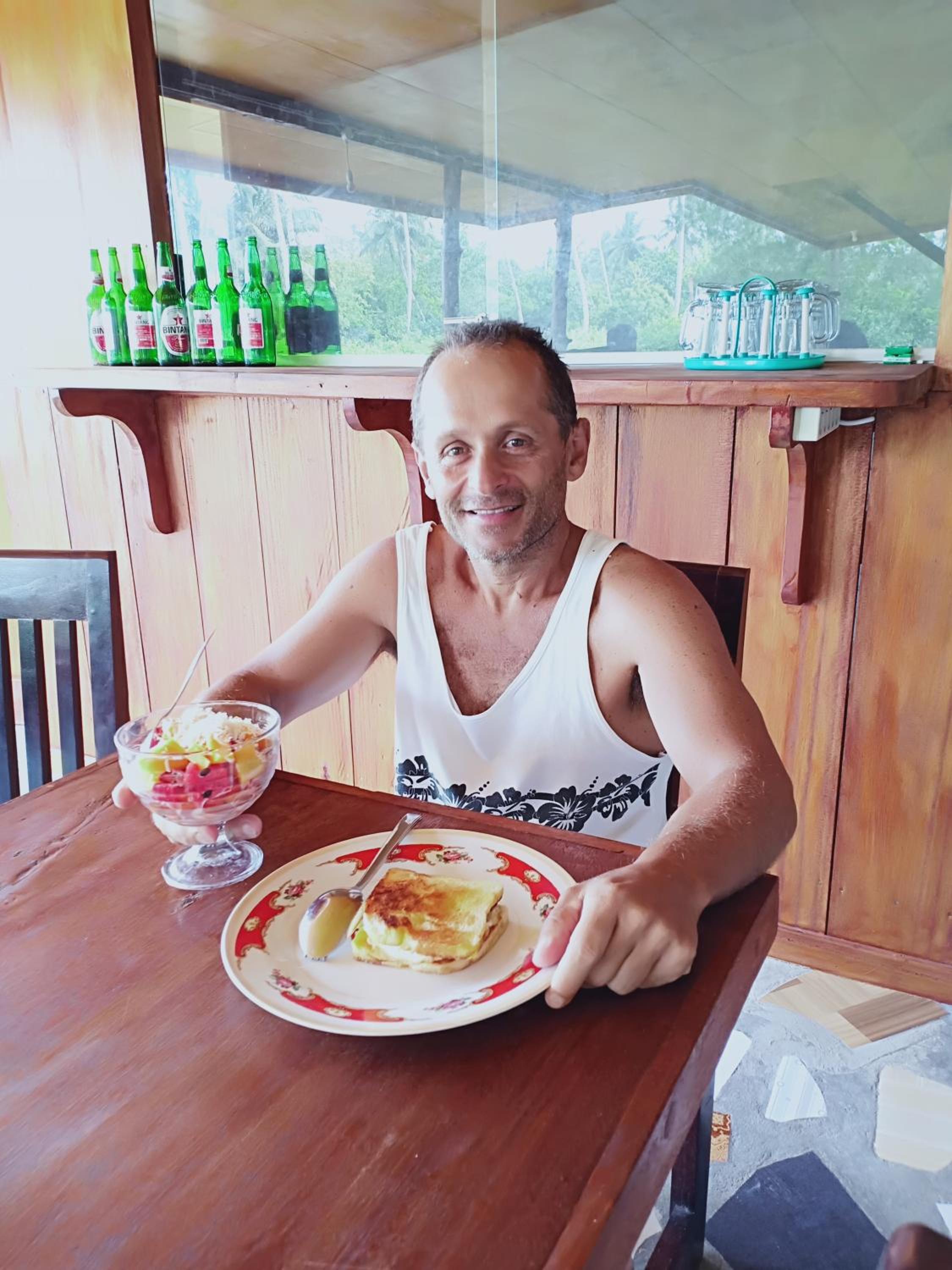 Cook wasn’t very friendly, food could take ages. Staff often very hard to find. Food a bit pricy and serving sizes weren’t great except the miegoreng and nasi goreng. Especially the nasi goreng was great. Taxi to ferry and back way over price. We also did a snorkel tour and they gave us marks but no snorkels. The snorkeling wasn’t great, and the people who did it the day before said the staff caught fish and fried them on a beach fire and got them coconuts. We didn’t get any of that. Our guide was very anti social and the tour was expensive. Cool fish at the last spot tho 🤷