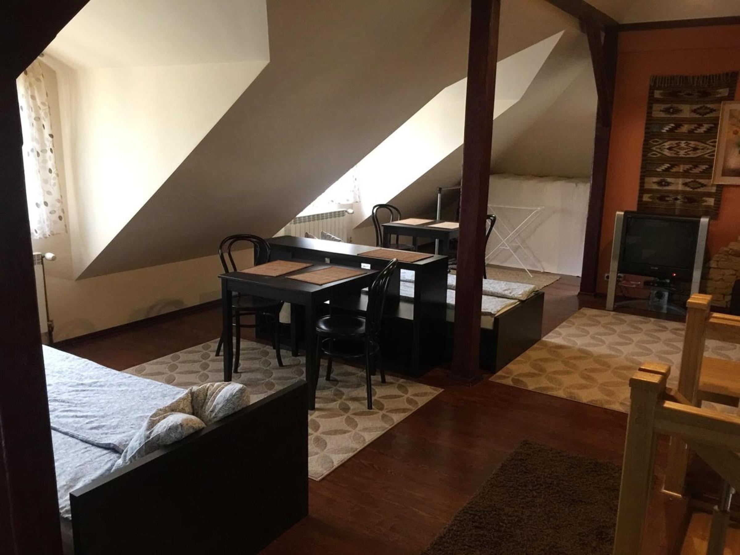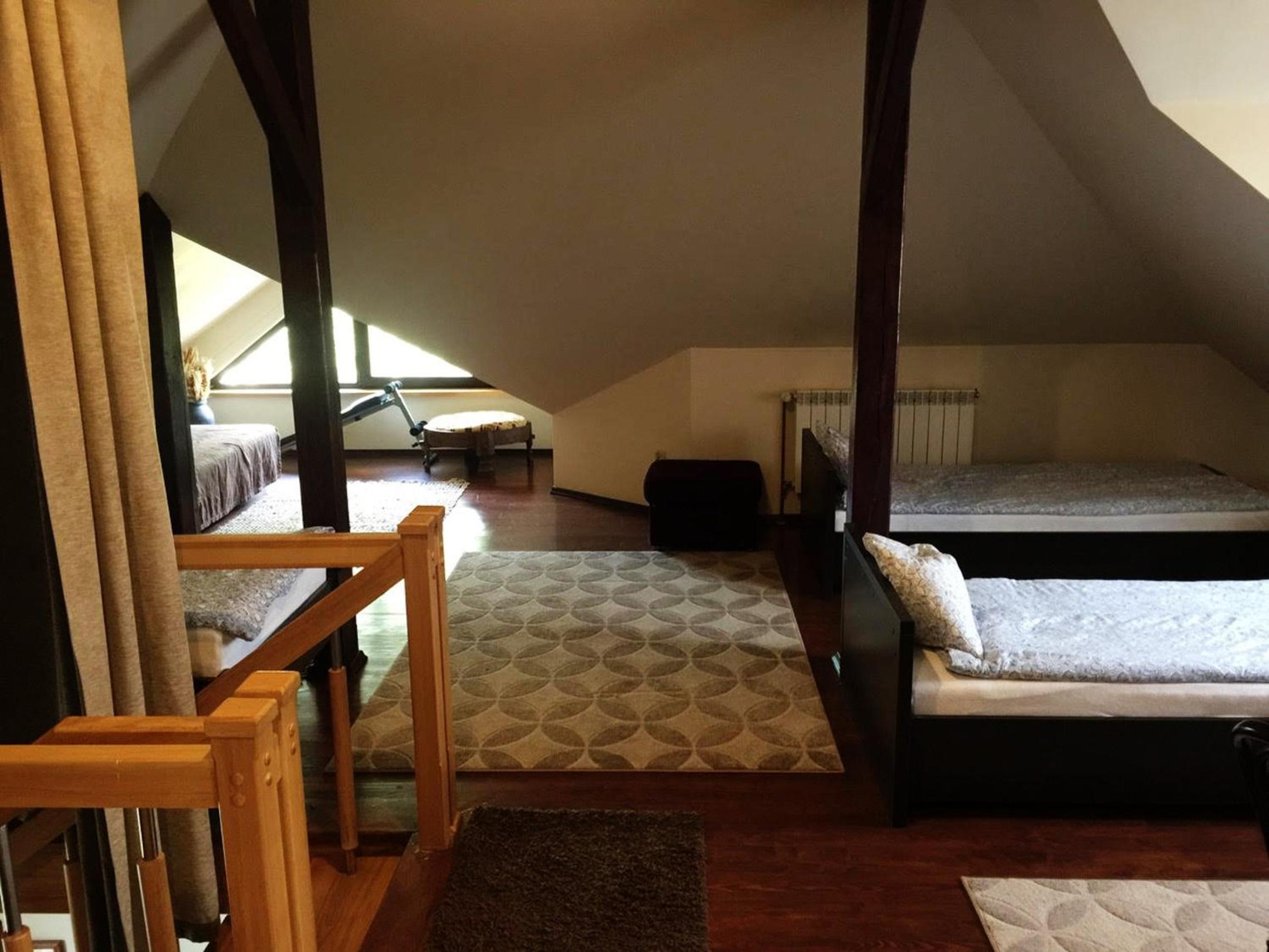 Nėra kondicionieriaus , tik vėjelis ir miegosite vienoje patalpoje- mansardoje, kuri atskirta stiklo laiptine, ir girdisi kiti kaimynai kai lipa laiptais.