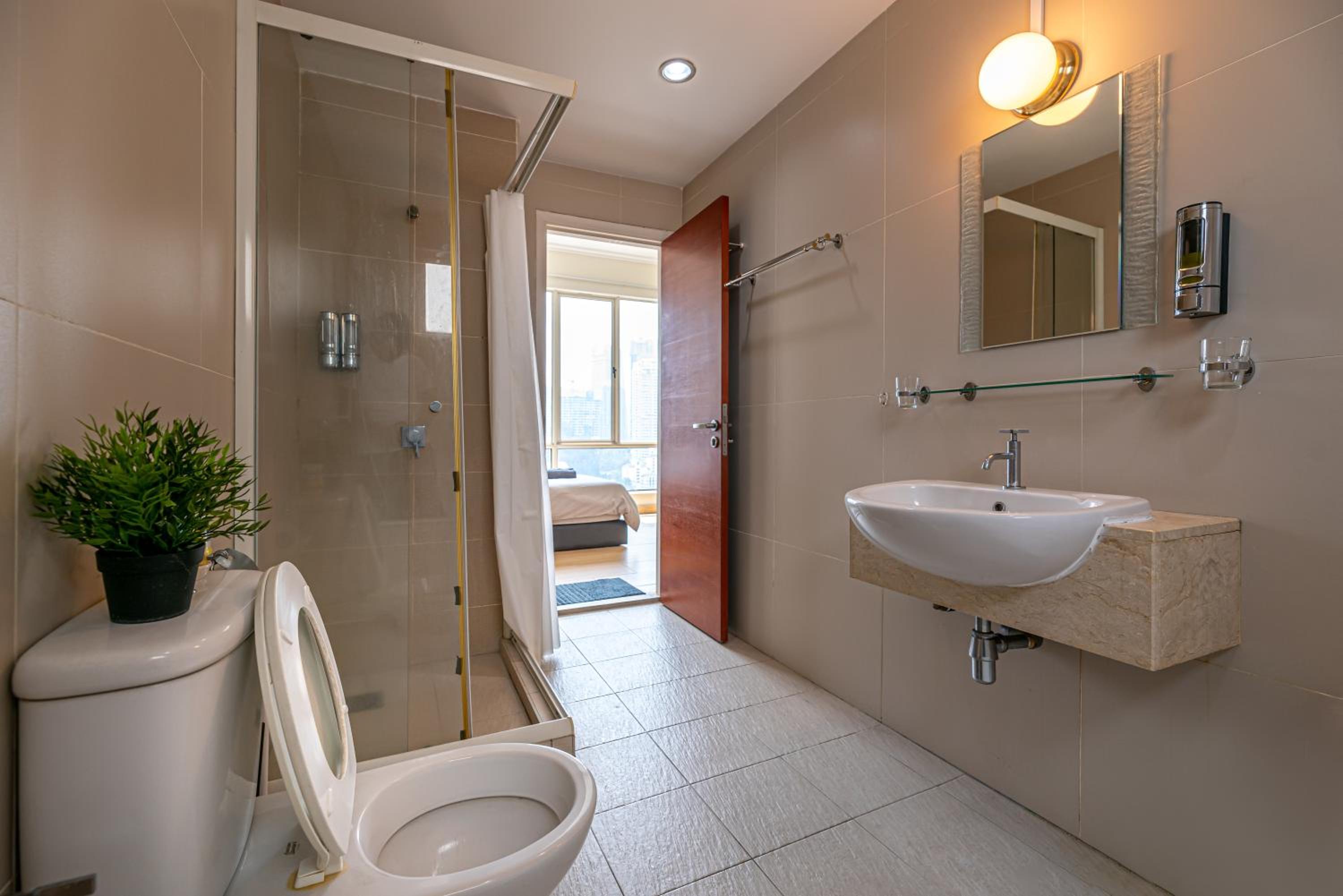 就在一个屋子里面的一个房间,房间还挺大,有衣架,插头只有一个,开窗可以看到很多建筑物的屏幕(晚上还挺好看的),有肥皂,有洗衣机可是没有洗衣粉,抽烟在阳台,挺多密码,楼下就有个my news。靠近TRX mall