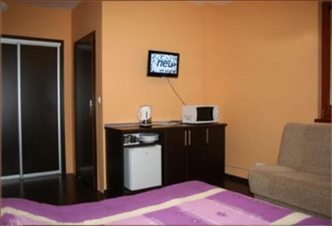 Небольшая комната, в которой есть все что нужно для небольшой остановки. Чайник, микроволновка,холодильник. Были полотенца.