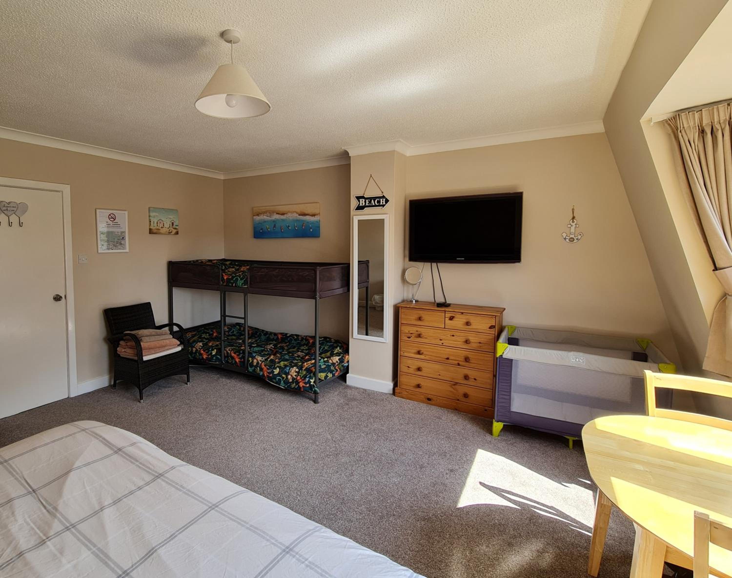It's a lovely location with free parking, and it is right on the sea front so you have a wonderful view in the morning. Facilities are everything that we needed for a family with a fully equipped kitchenette, and large spacious room with our own bathroom. Also the added breakfast items for us is always a welcome bonus so one less thing to think about.