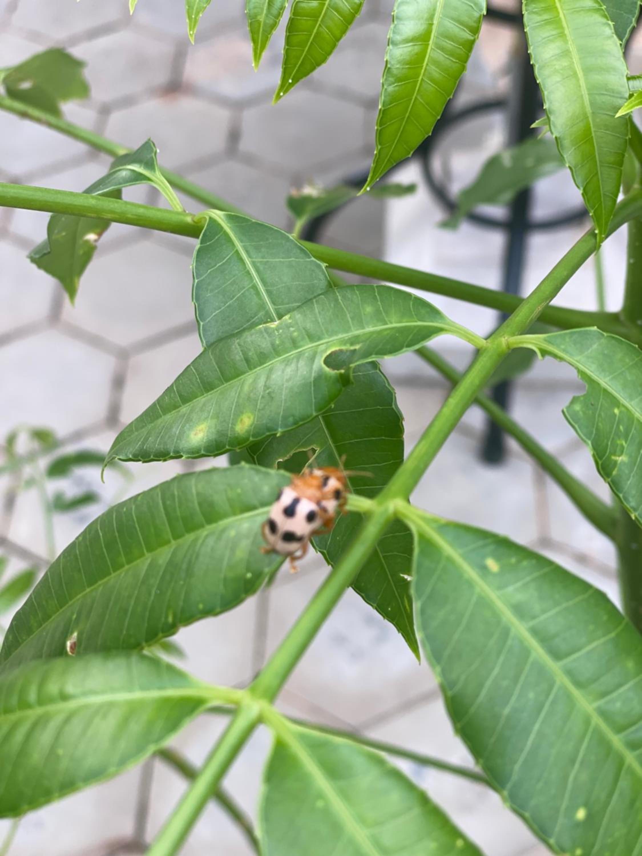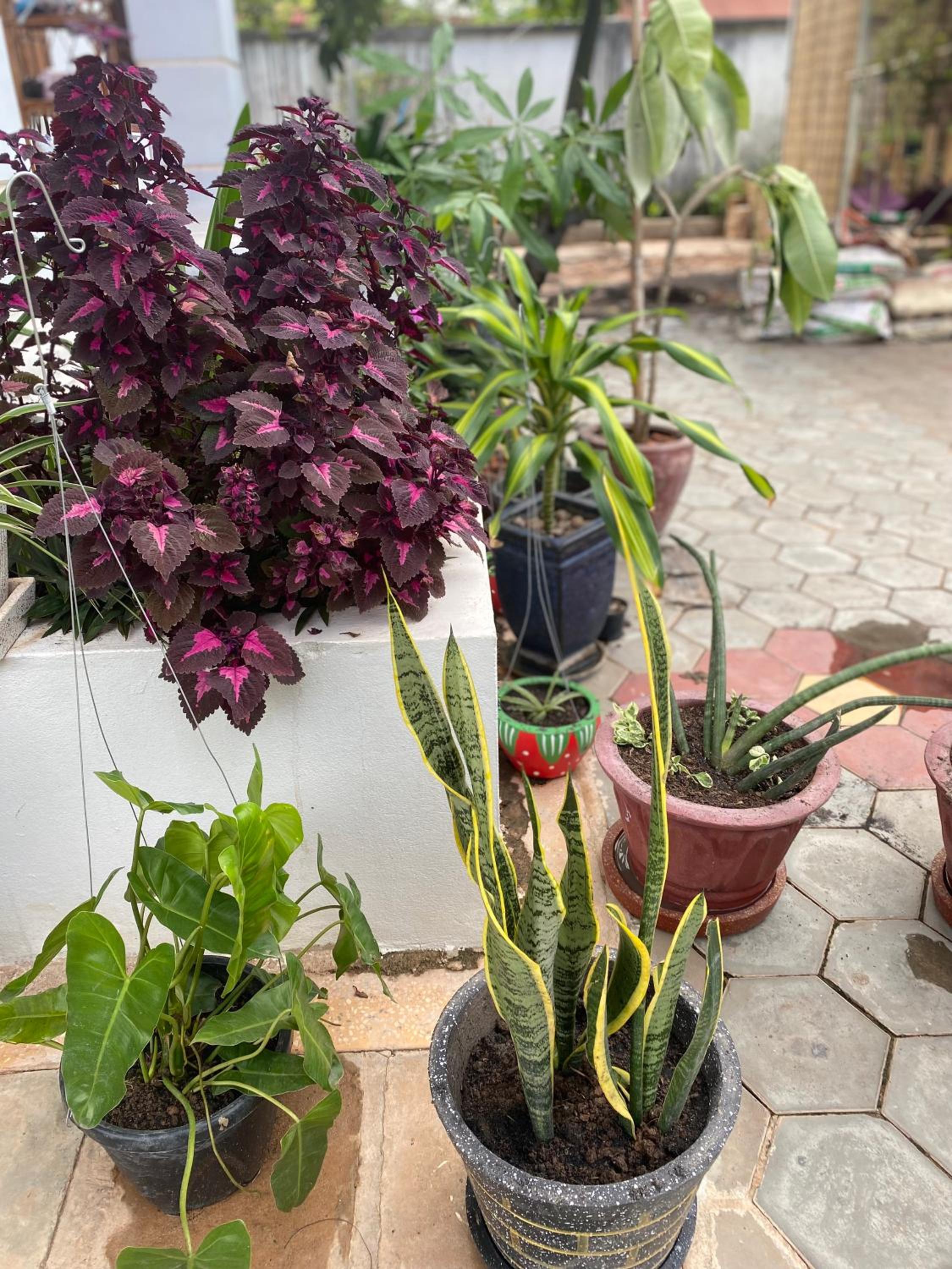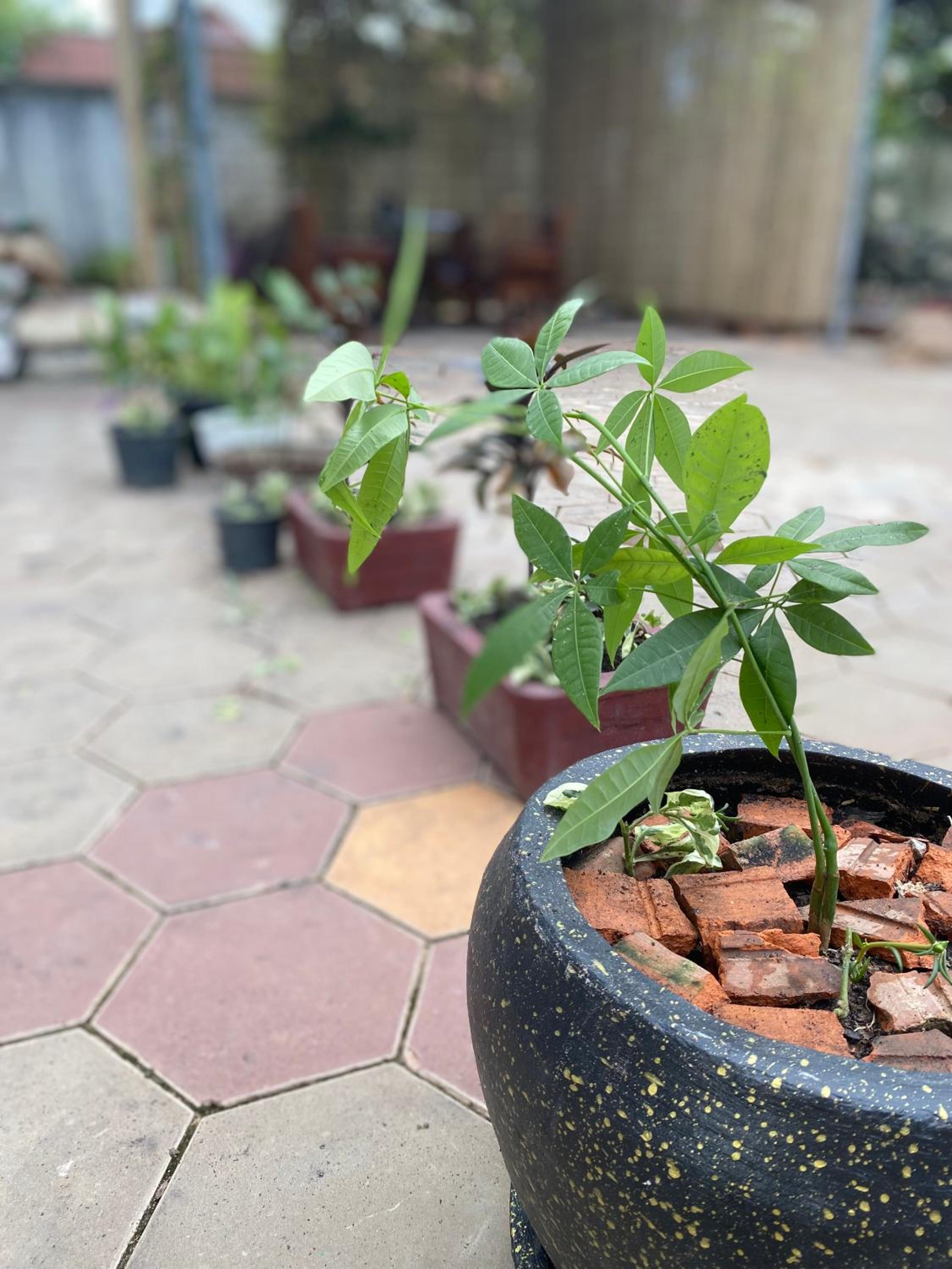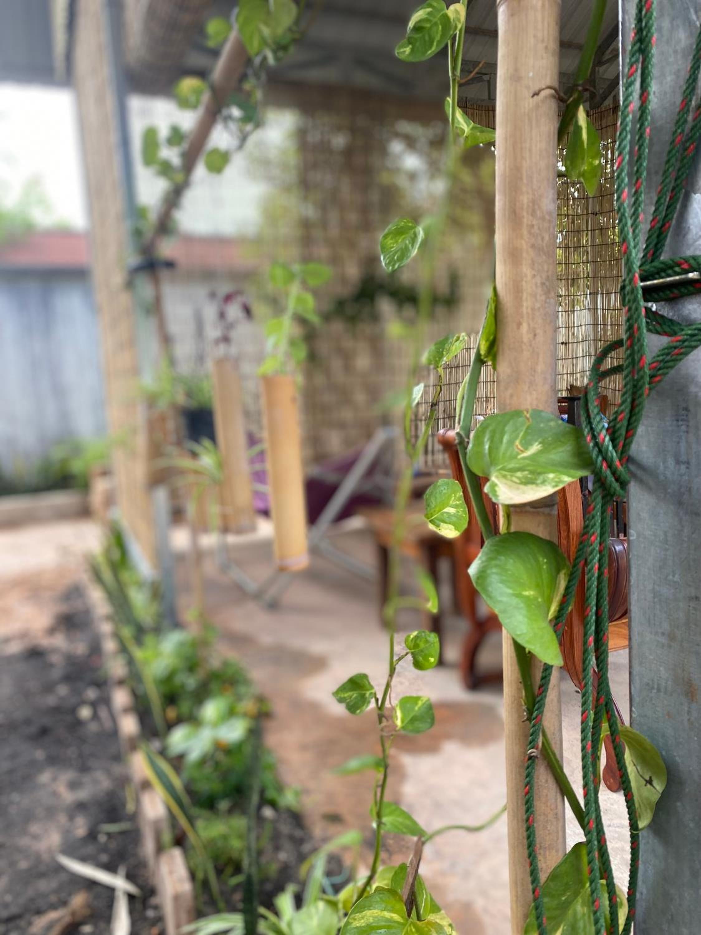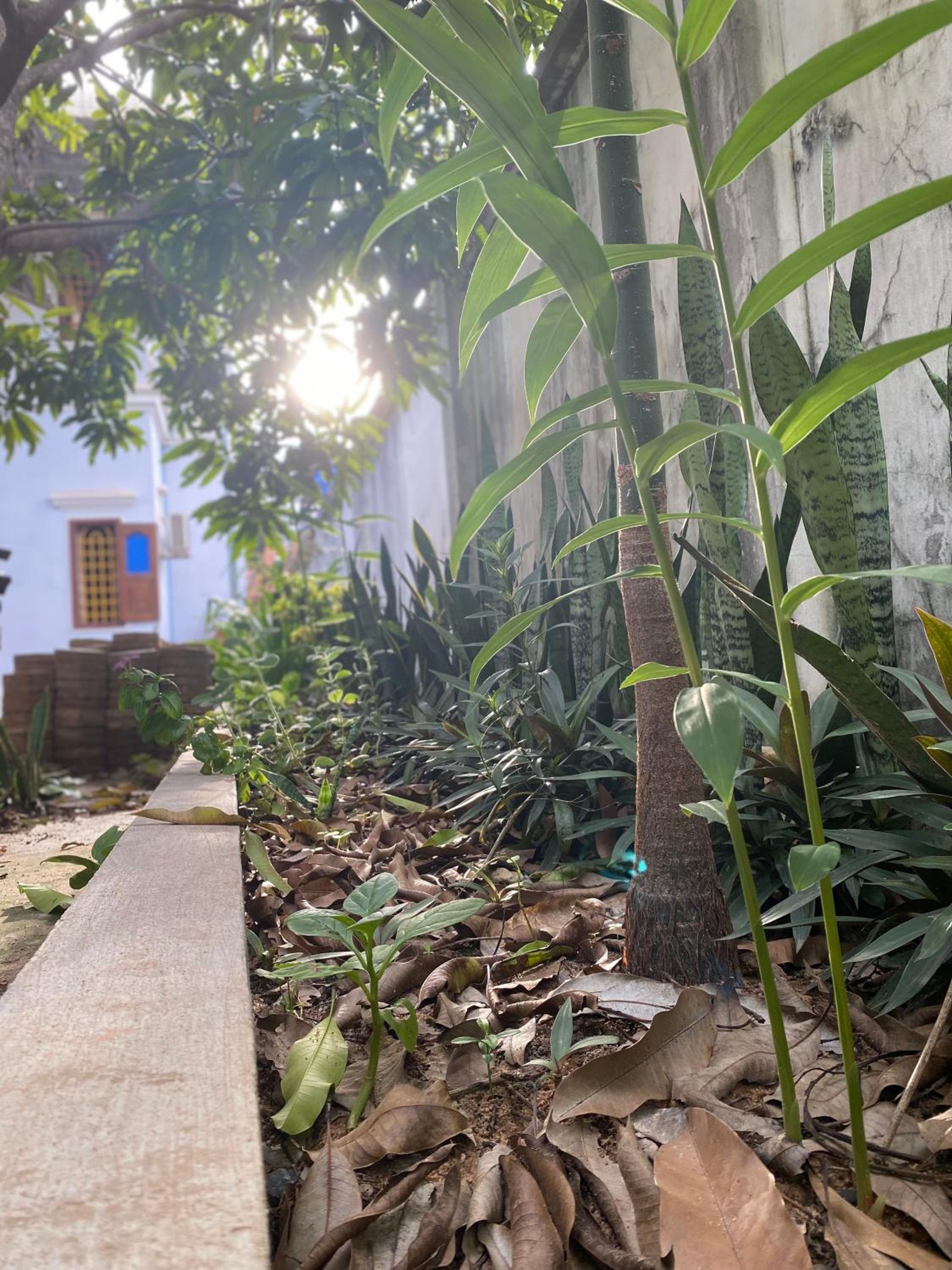 The eating area is wonderful with trees and plants everywhere.