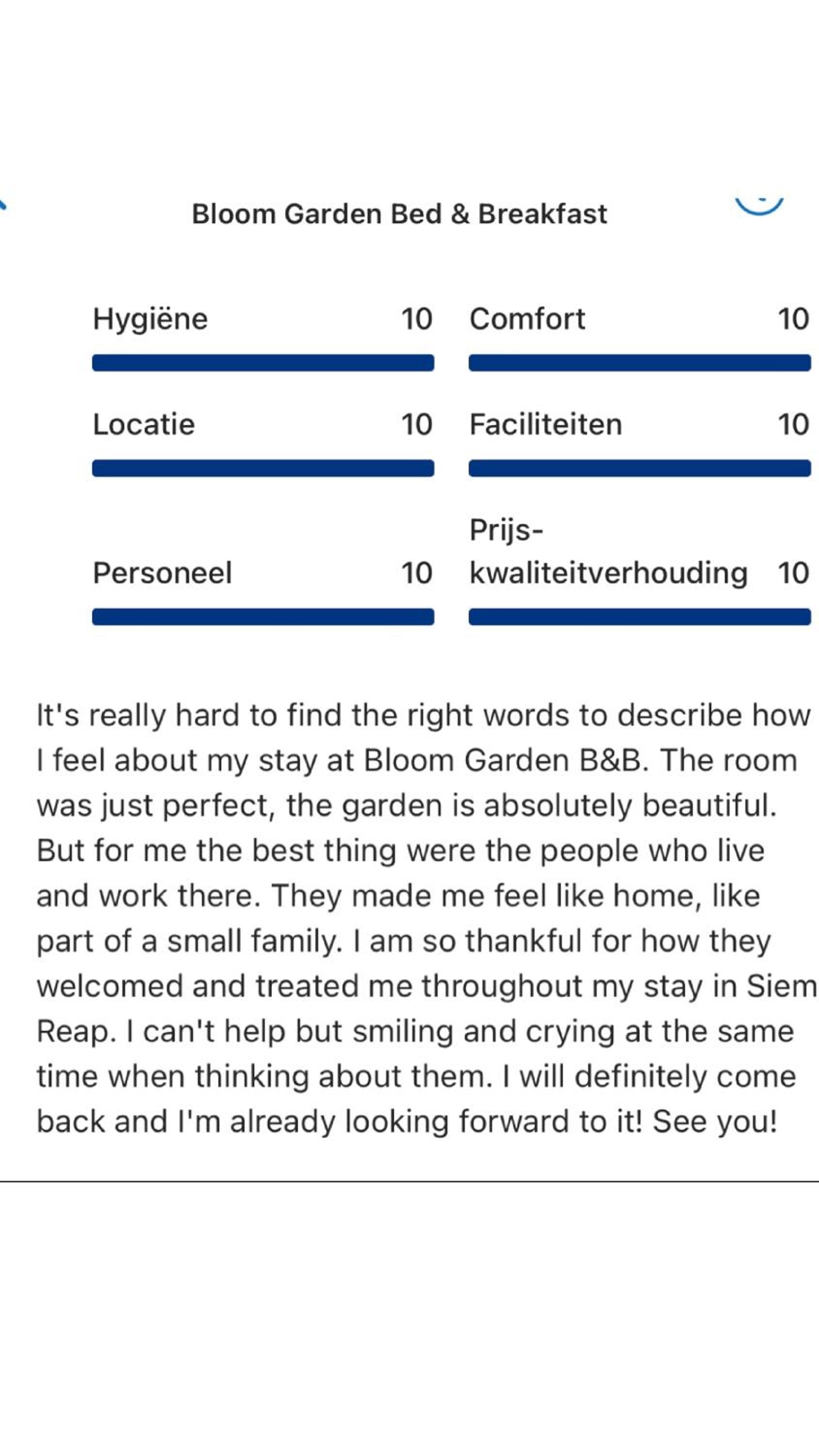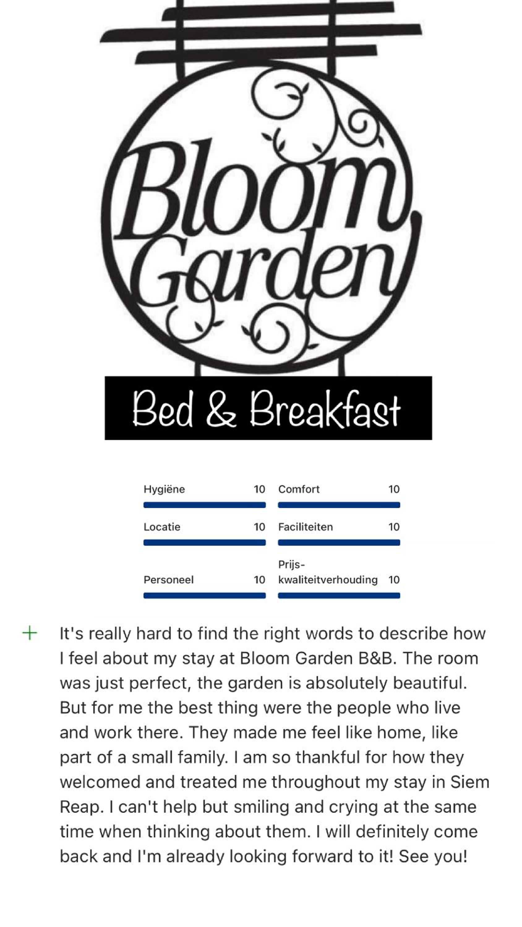 I had a wonderful time while staying with Peterhans and Panhea at Bloom Garden. A truly guesthouse where you will enjoy living in the peaceful house of this lovely couple. Peter will organize all the trips to Angkor Wat and other temples plus activities and transport. I could not ask for more. Thanks both for this beautiful experience. I hope one day I'll be able to come back.