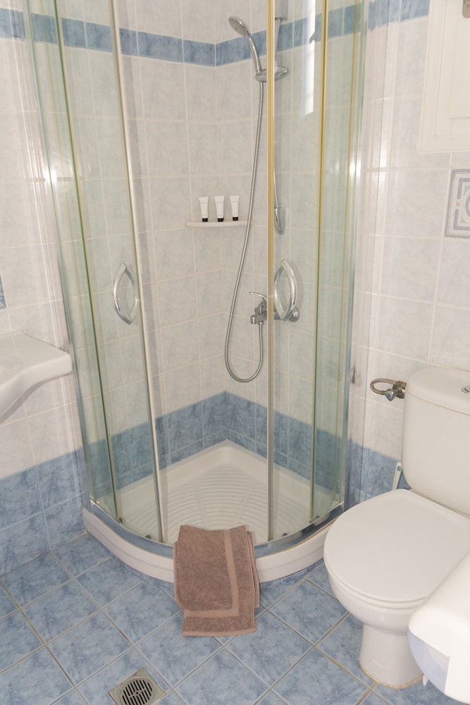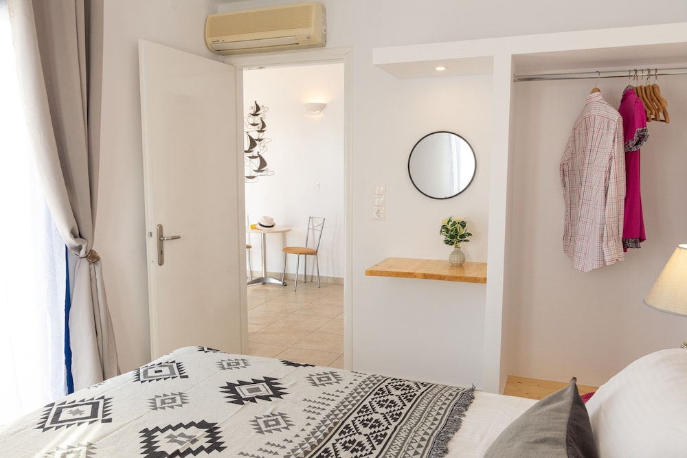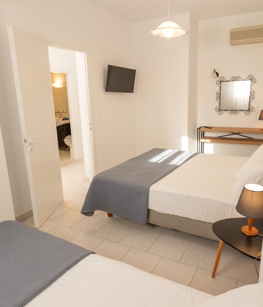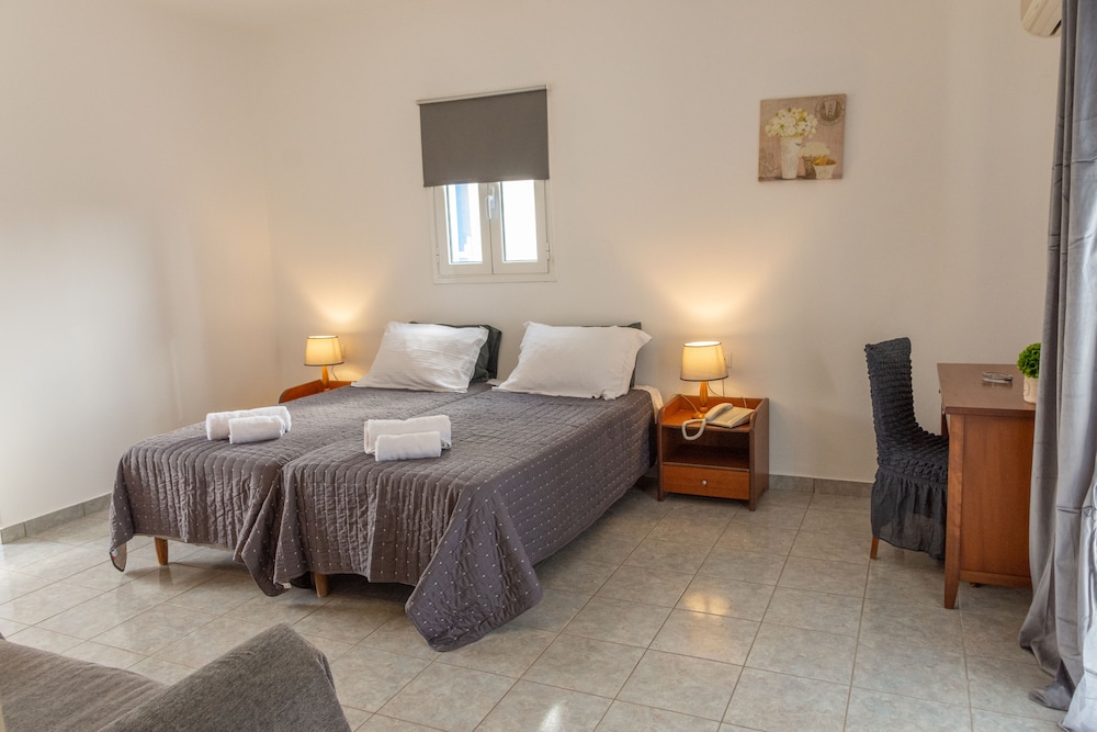 The hotel is attractive with lovely views and clean, spacious and modern rooms. The beds are even comfortable with memory foam mattresses which is very rare for Greek hotels. Unfortunately the pillows were not so comfortable and there is no kettle, glasses or cups in the room. The gardens are pretty and well kept. The rope around the pool makes it look unattractive and also less fun for the kids who were also told off by staff and the owner for jumping in, even though the pool rules on the wall said nothing about jumping in being forbidden. The staff were unfortunately not very helpful or friendly. Breakfast is not included and at €16 per person with no reduced price for children it is not a good deal for families to pay - especially for a family like us who has a child with multiple severe allergies. There is a strict policy that you can’t eat at any tables outside if bringing your own food, despite there being no tables in rooms but a stovetop and fridge in family rooms suggesting that cooking would even be encouraged (it is not). Staff were unwilling to provide us more than two spoons and bowls between 8 with which to eat our own cereal. We were also told off for using a spare clothes line even though it was not being used by anyone else. Lastly the location is very cut off along a very busy and dangerous road. You have to take the bus to get anywhere and it is not the best side of the island.