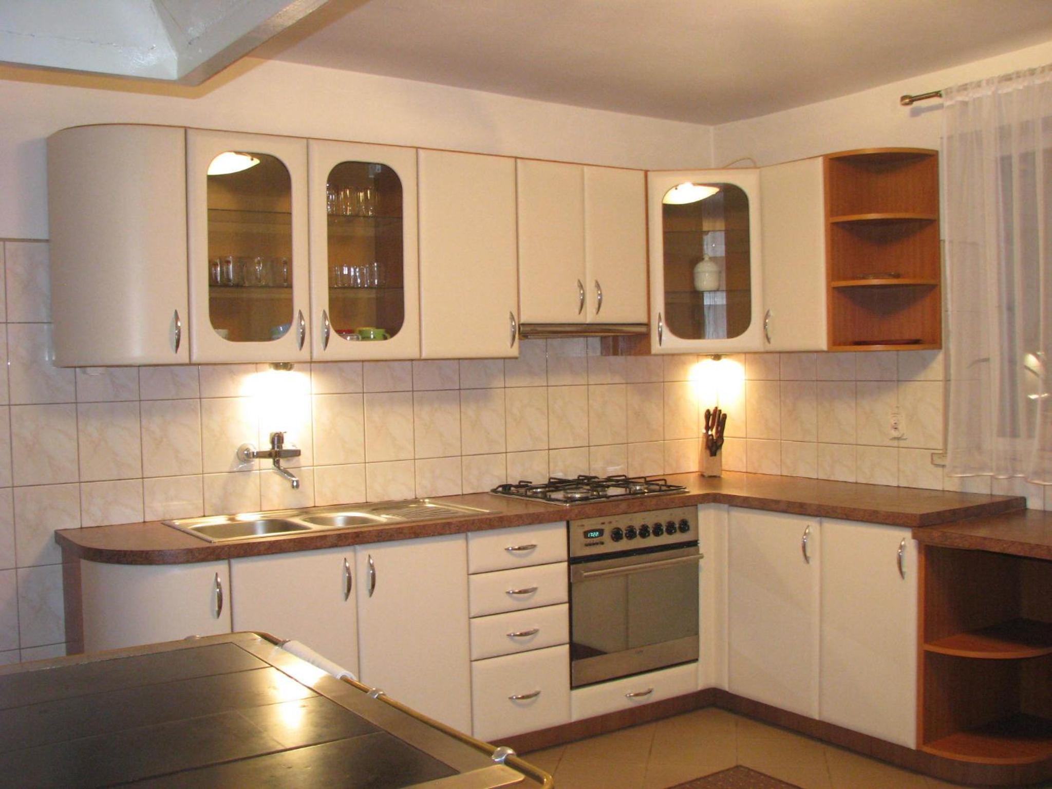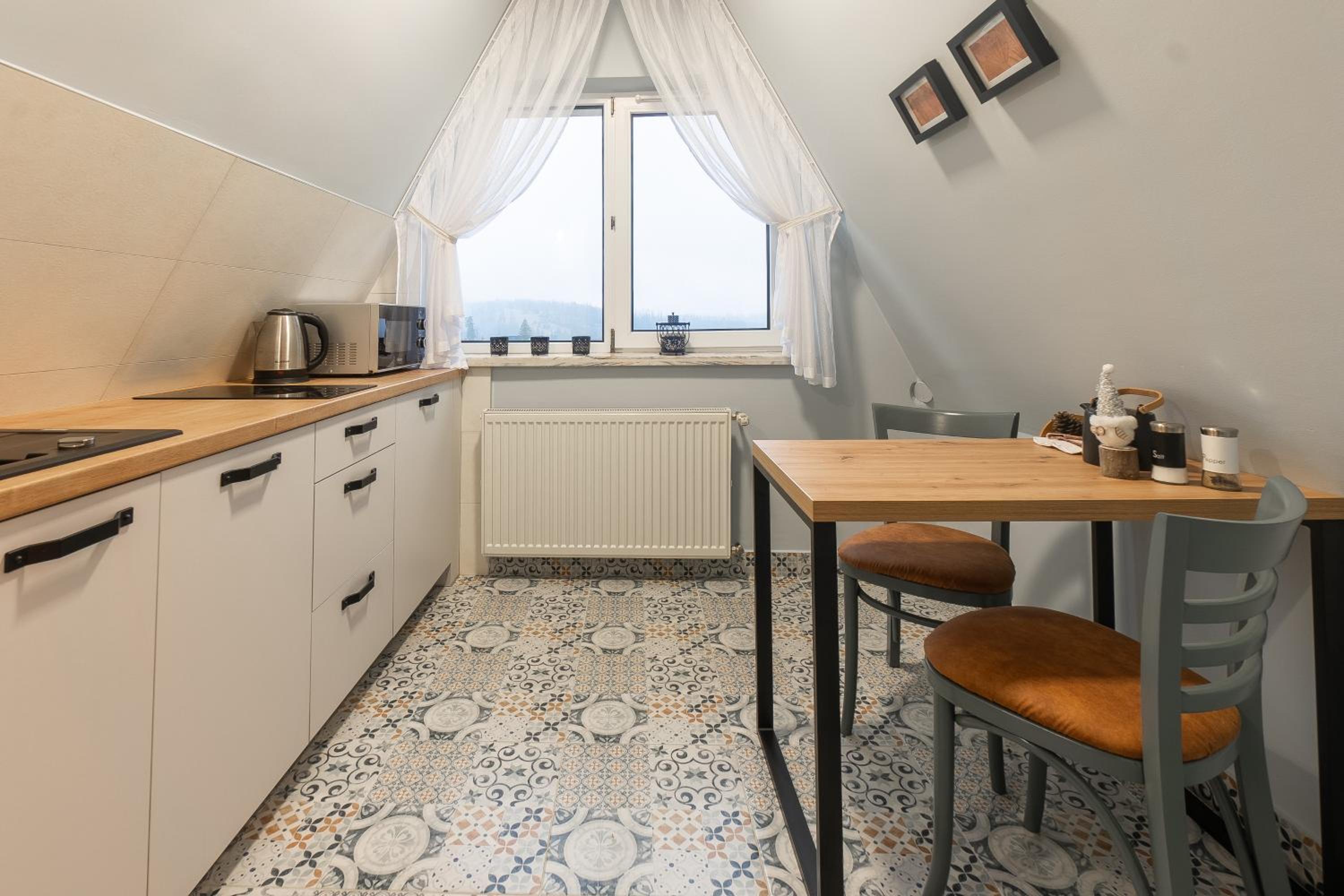 Dobrze wyposażona kuchnia z widokiem na góry.