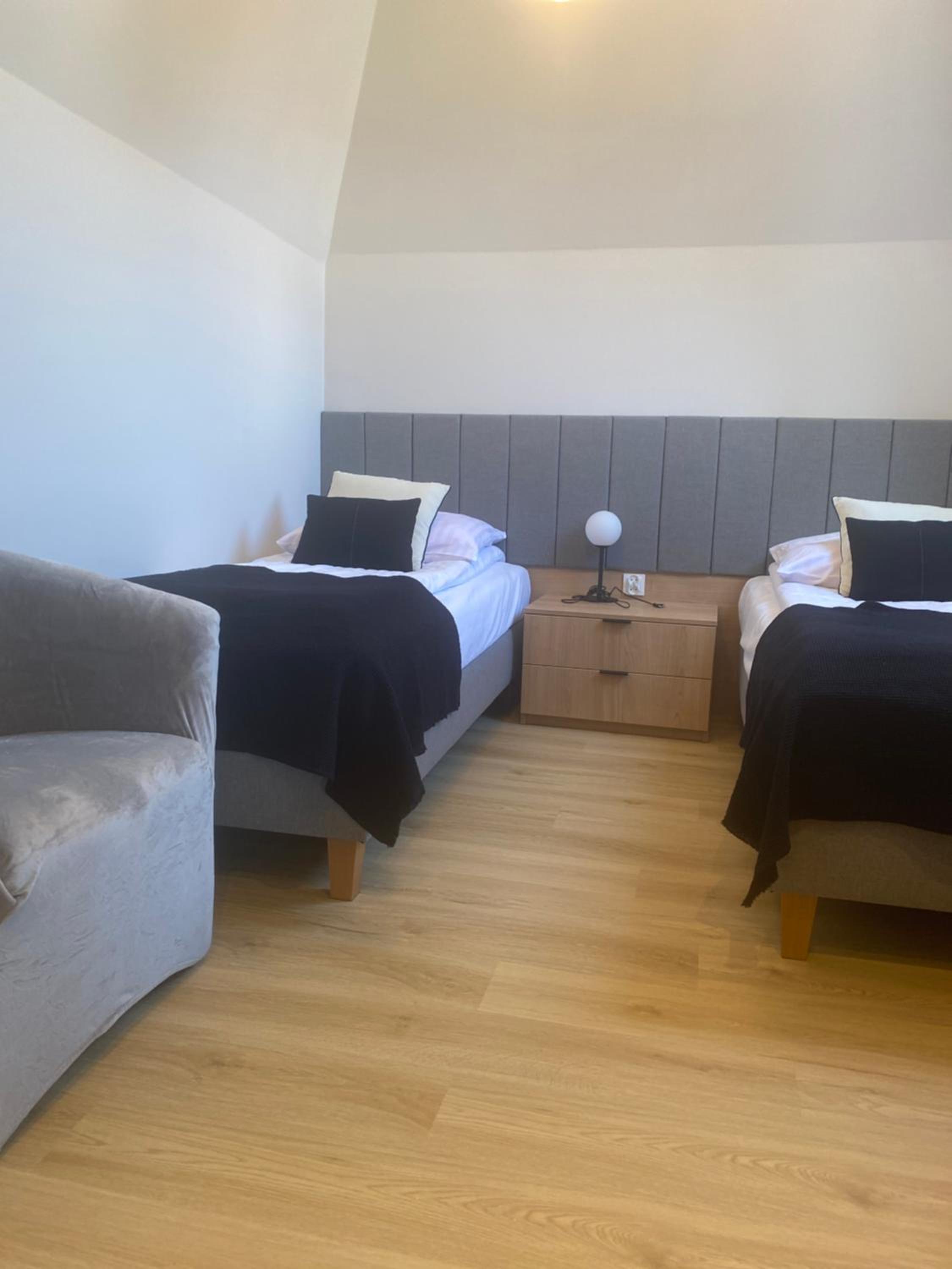 Měli jsme podkrovní dvoulůžkový pokoj - útulný, čistý a i přes malou plochu, dobře dispozičně řešený.