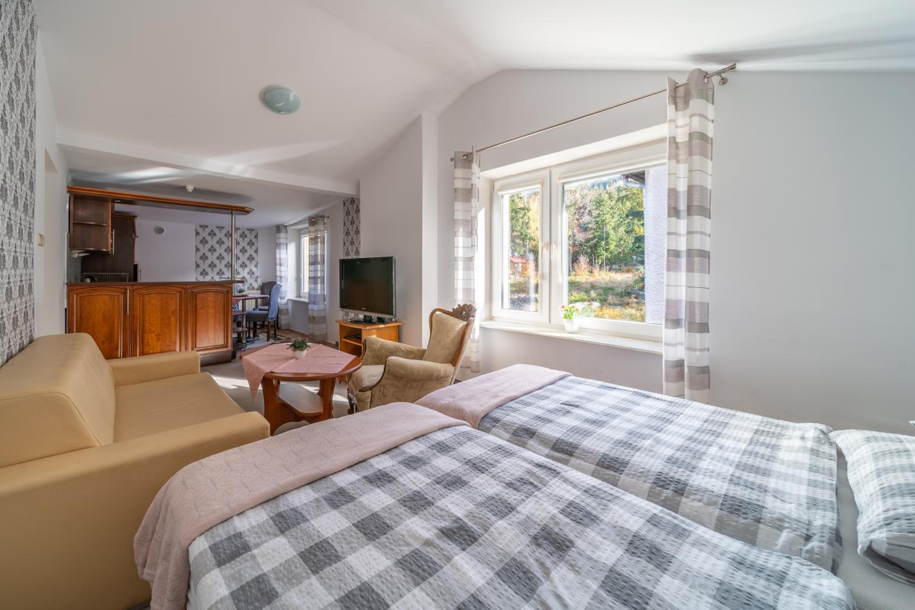 Wygodny, przestronny, wyposażony we wszystko co niezbędne apartament z balkonem, z którego rozpościera się cudowny widok na góry.