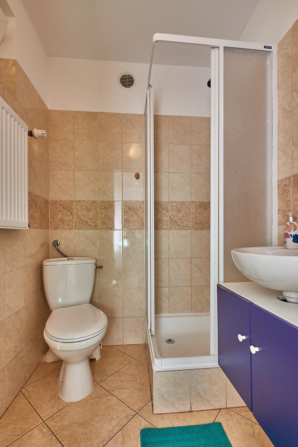 Rozklejające się drzwi prysznicowe, nieco zatłoczony pokój przez meble, słabo wypełnione poduszki, bardzo mała kabina prysznicowa
