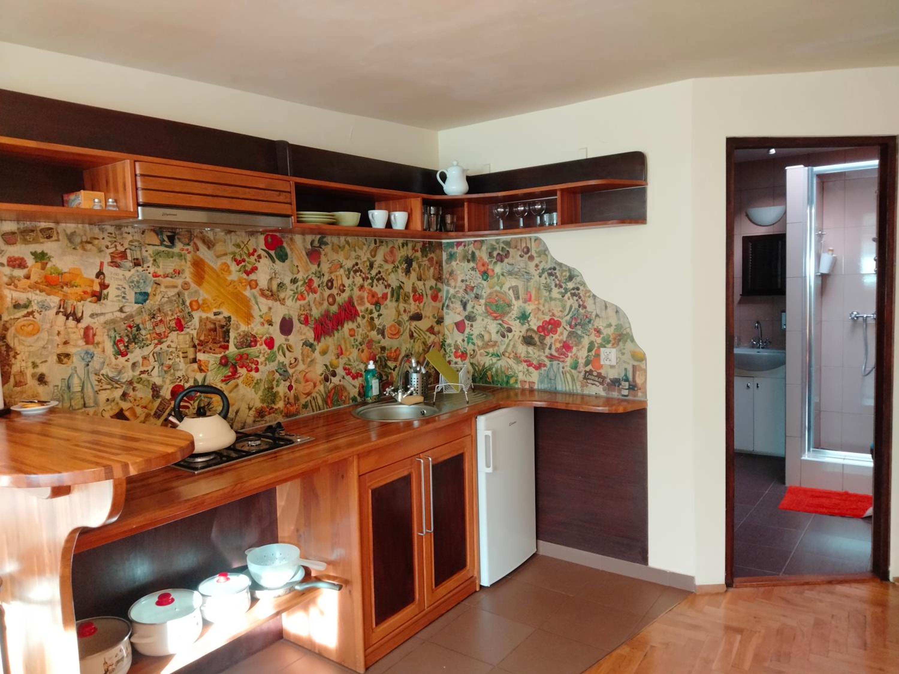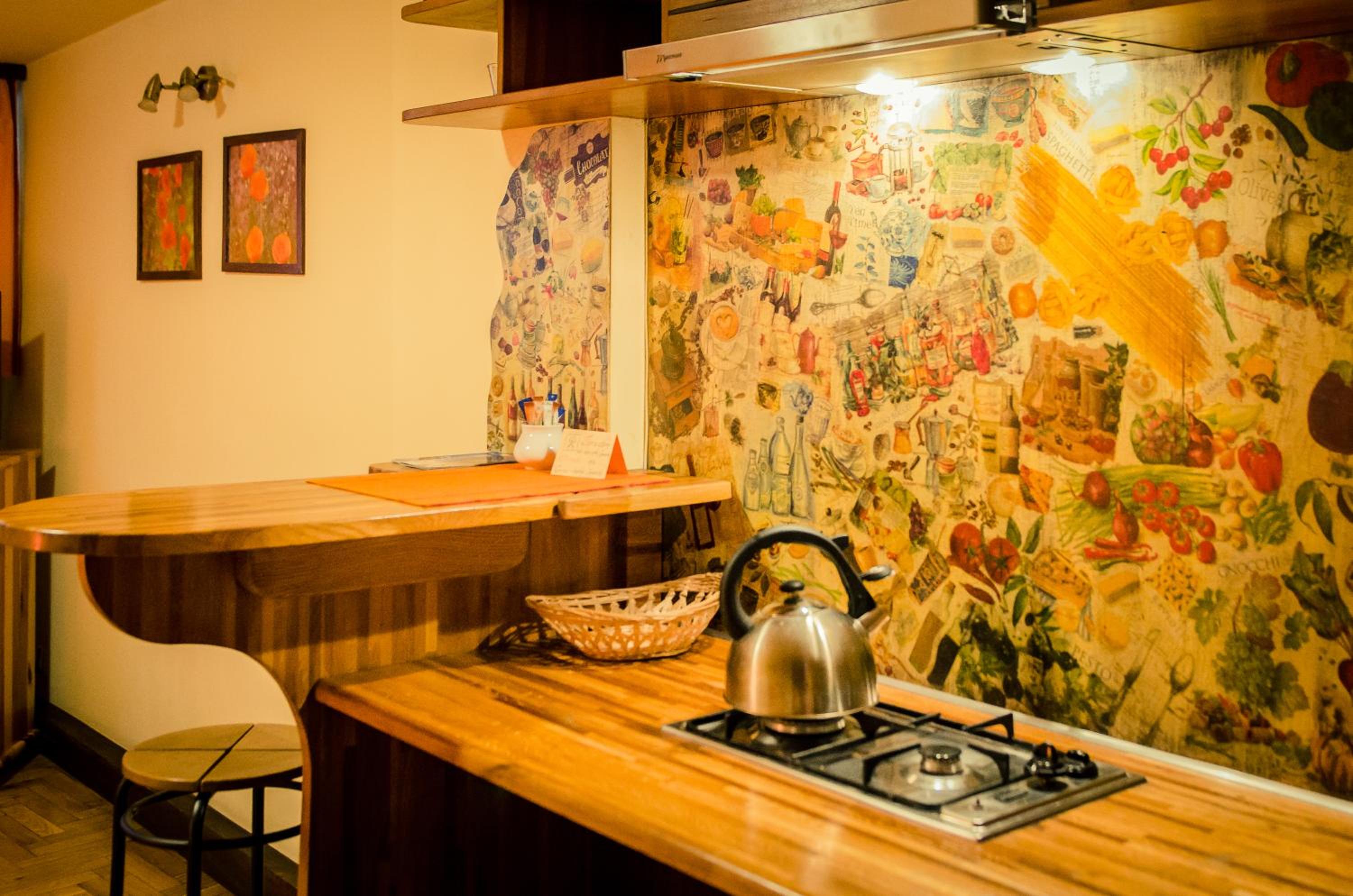Cucina completa (ma non l'abbiamo mai usata). Comodo il bar annesso dove abbiamo potuto gustare delle ottime colazioni.....e delle ottime vodka 😁 È stato possibile lasciare lì i bagagli l'ultimo giorno.
