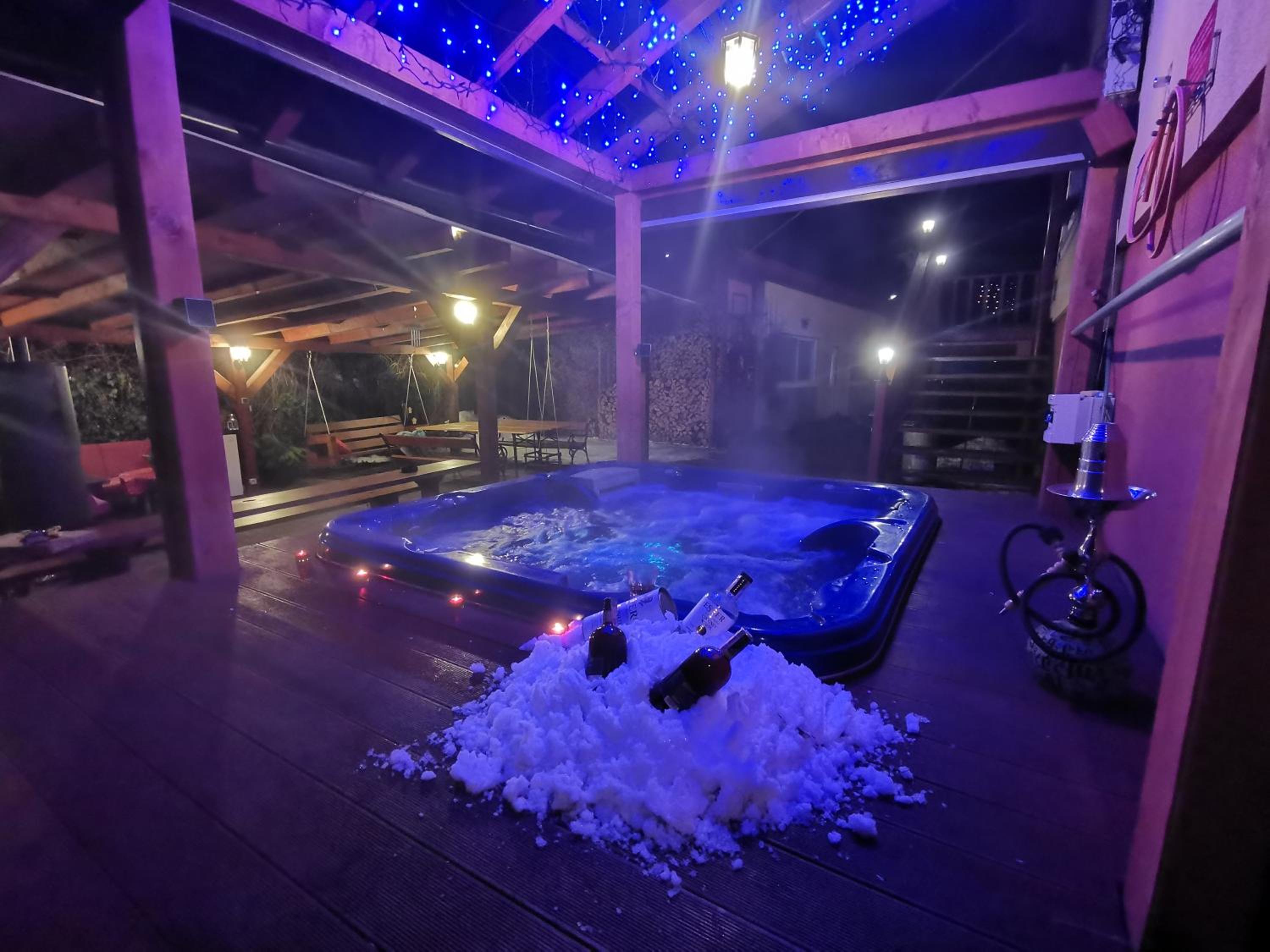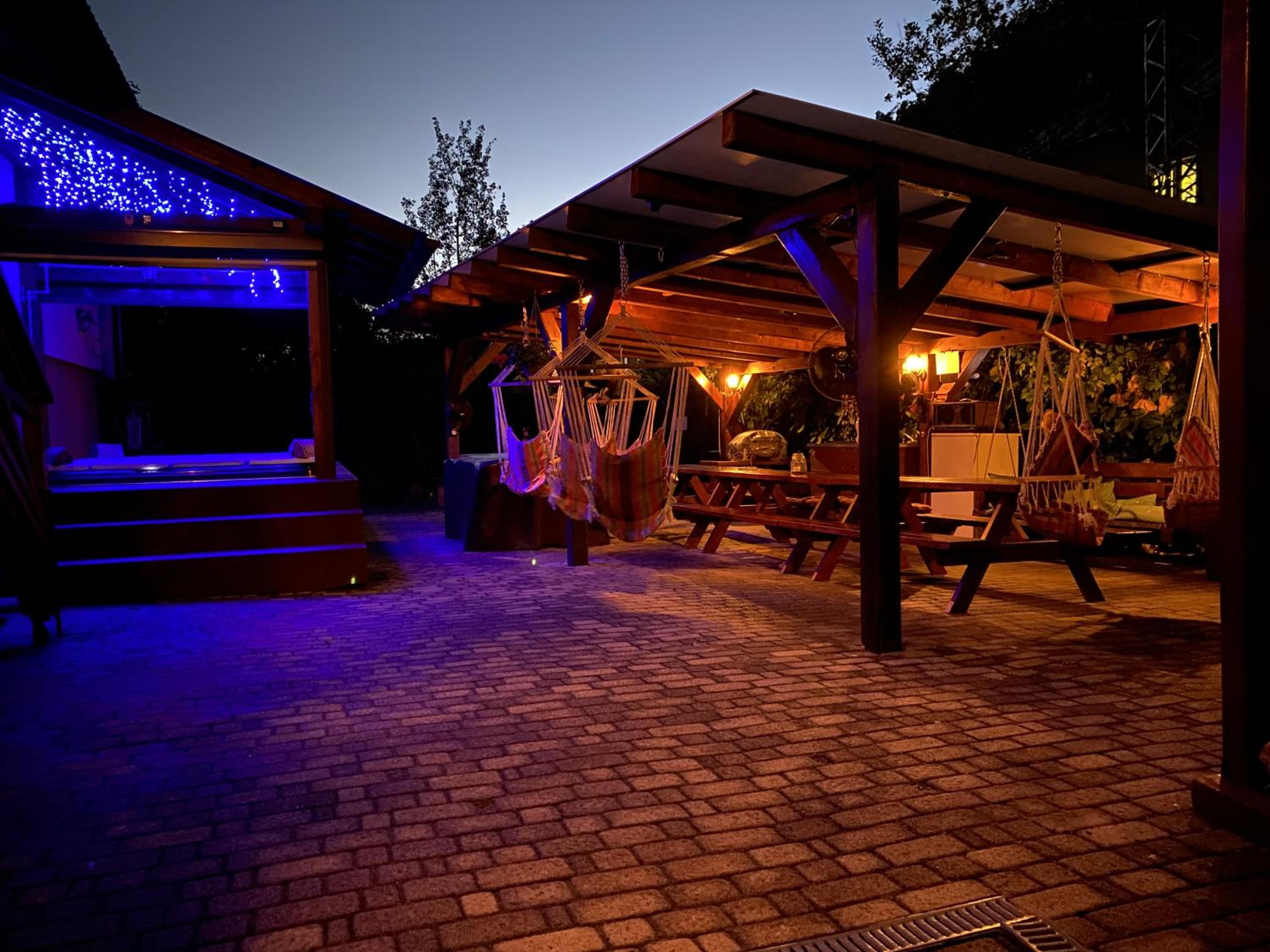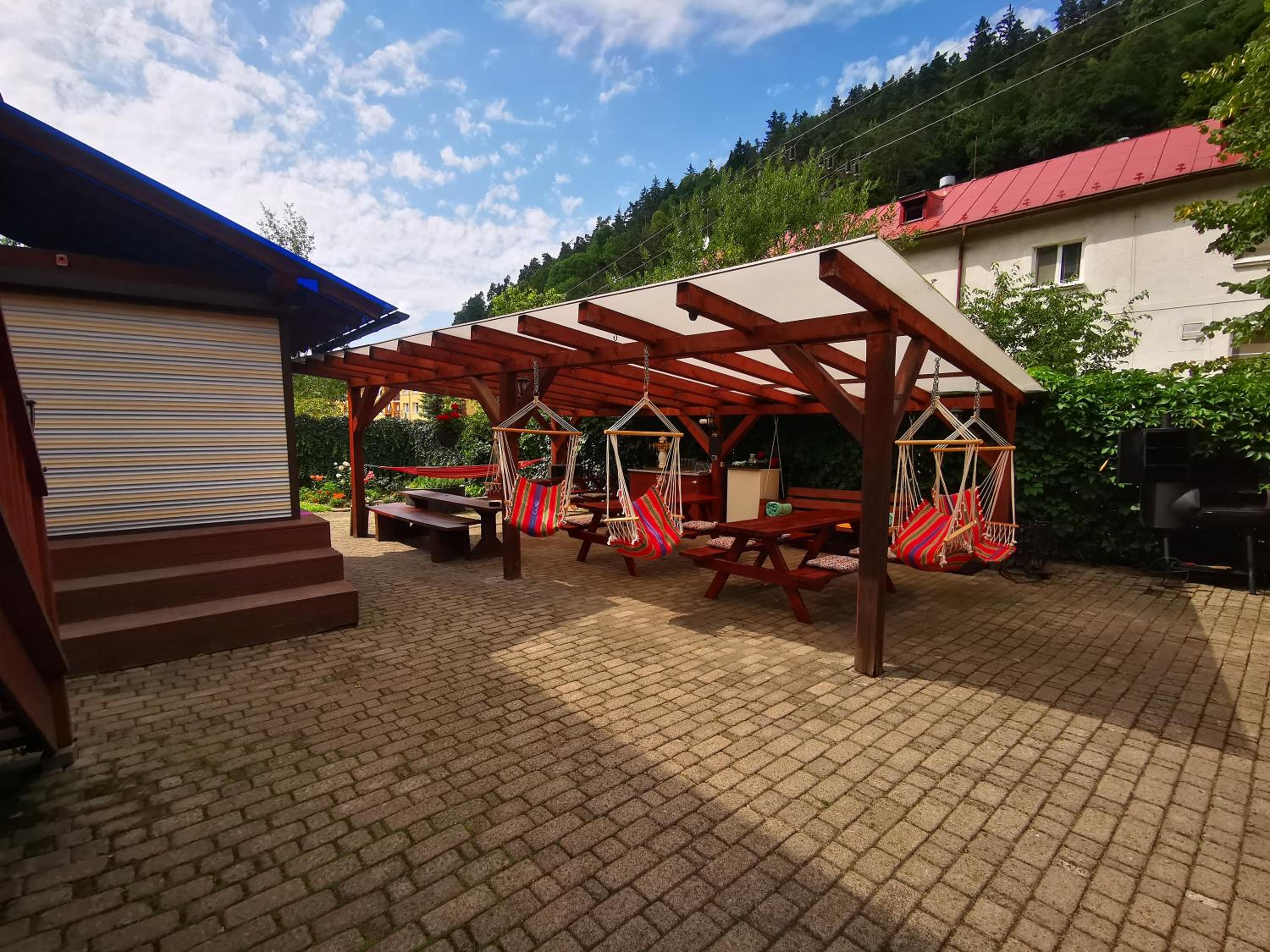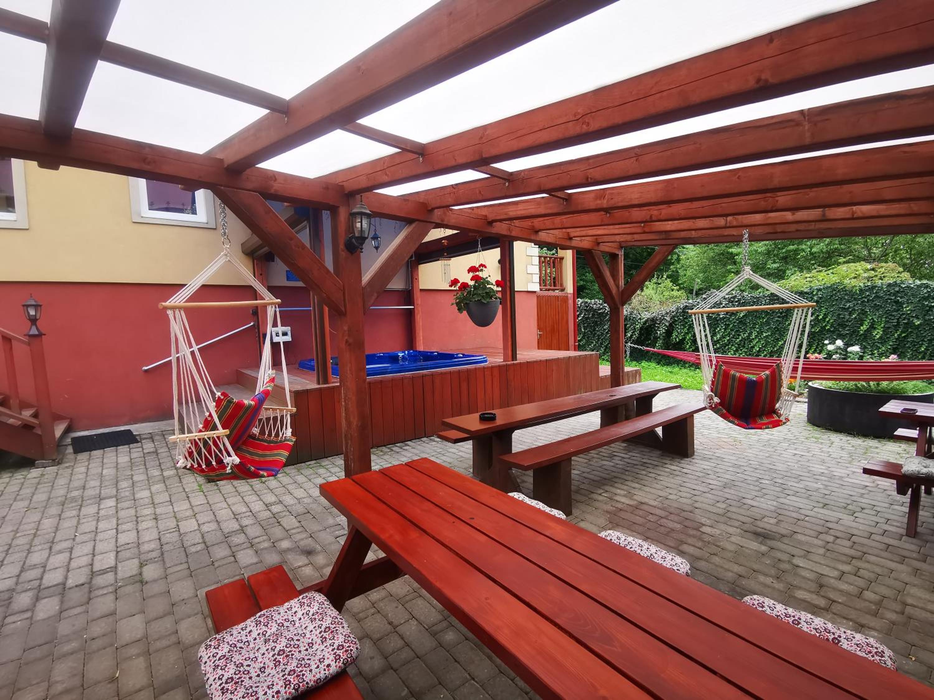 Guests can unwind in comfortable rooms and an apartment, then gather in the inviting common lounge featuring a crackling fireplace. The outdoor hot tub, gazebo with a swing, and barbecue facilities provide perfect spots for relaxation.