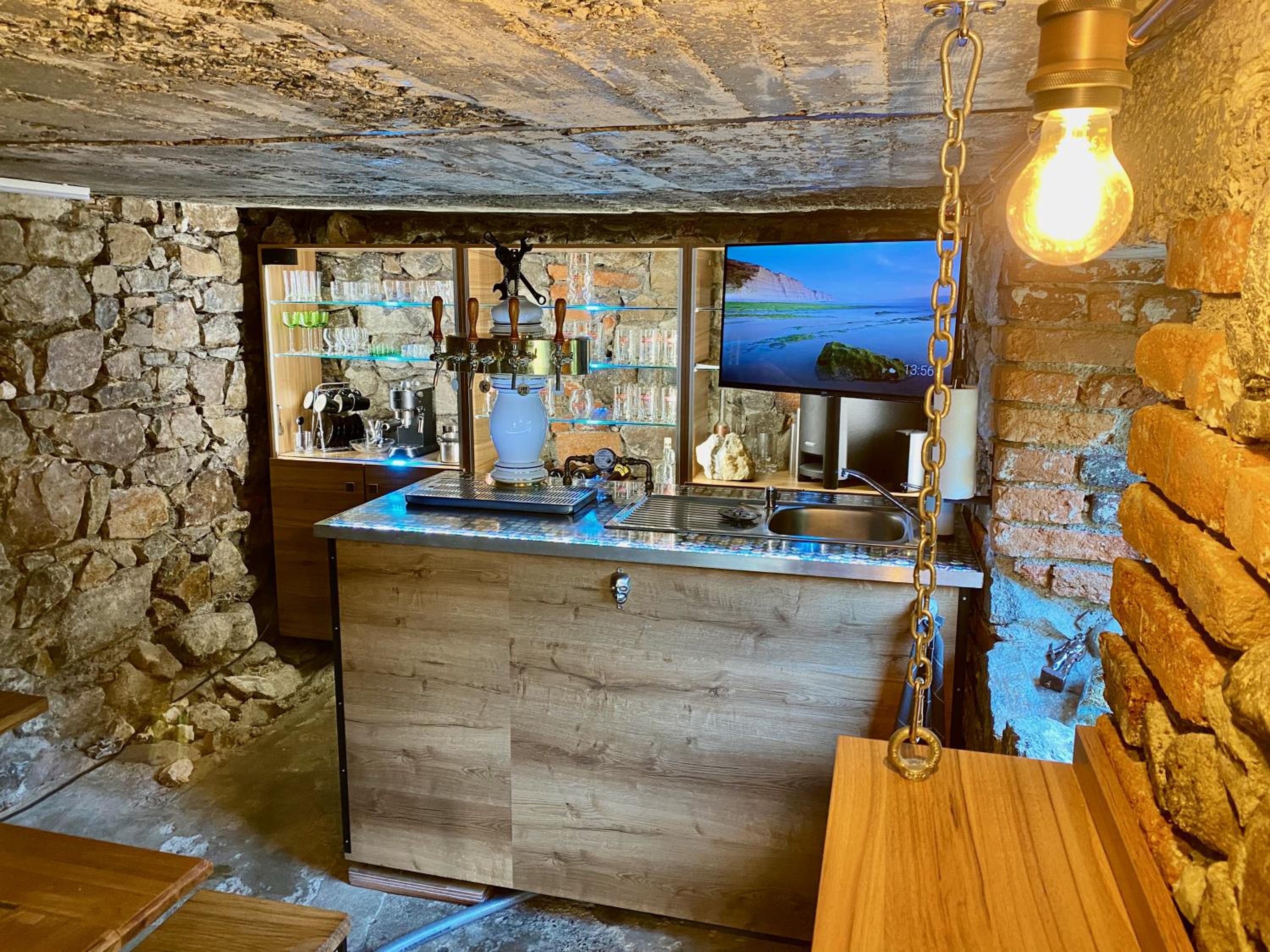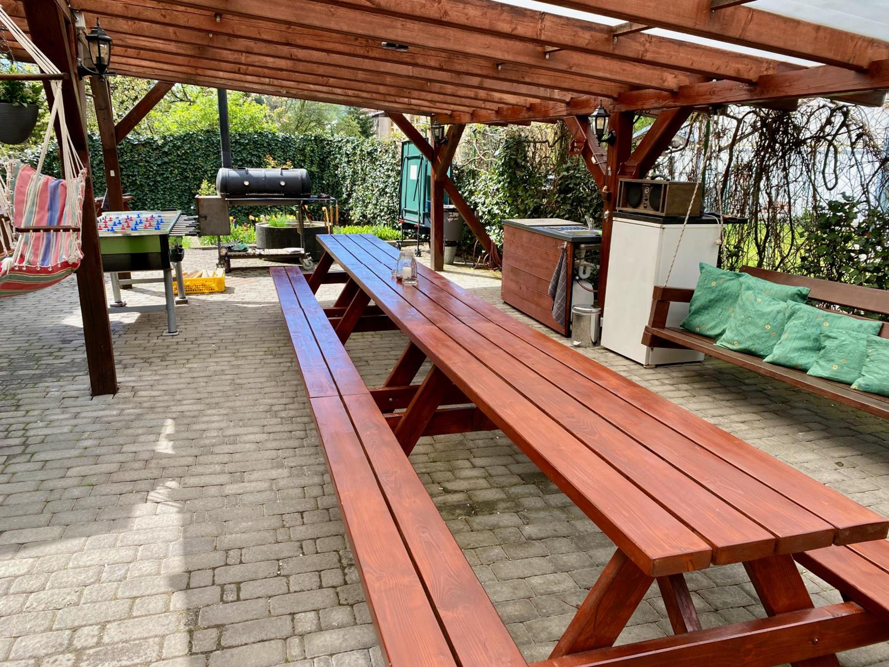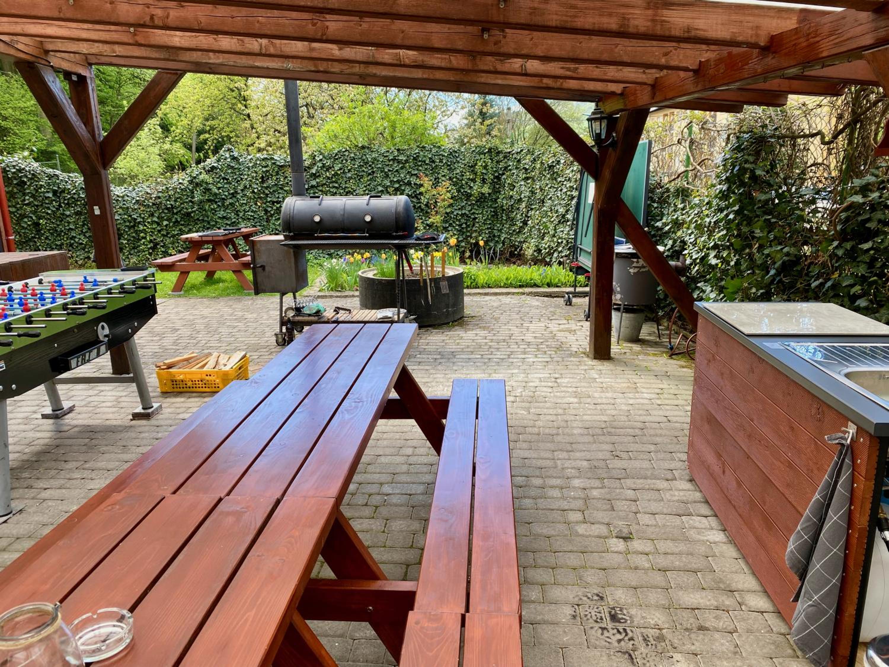 I loved the share kitchen and the garden with a big wooden table and where you can buy draft beer.